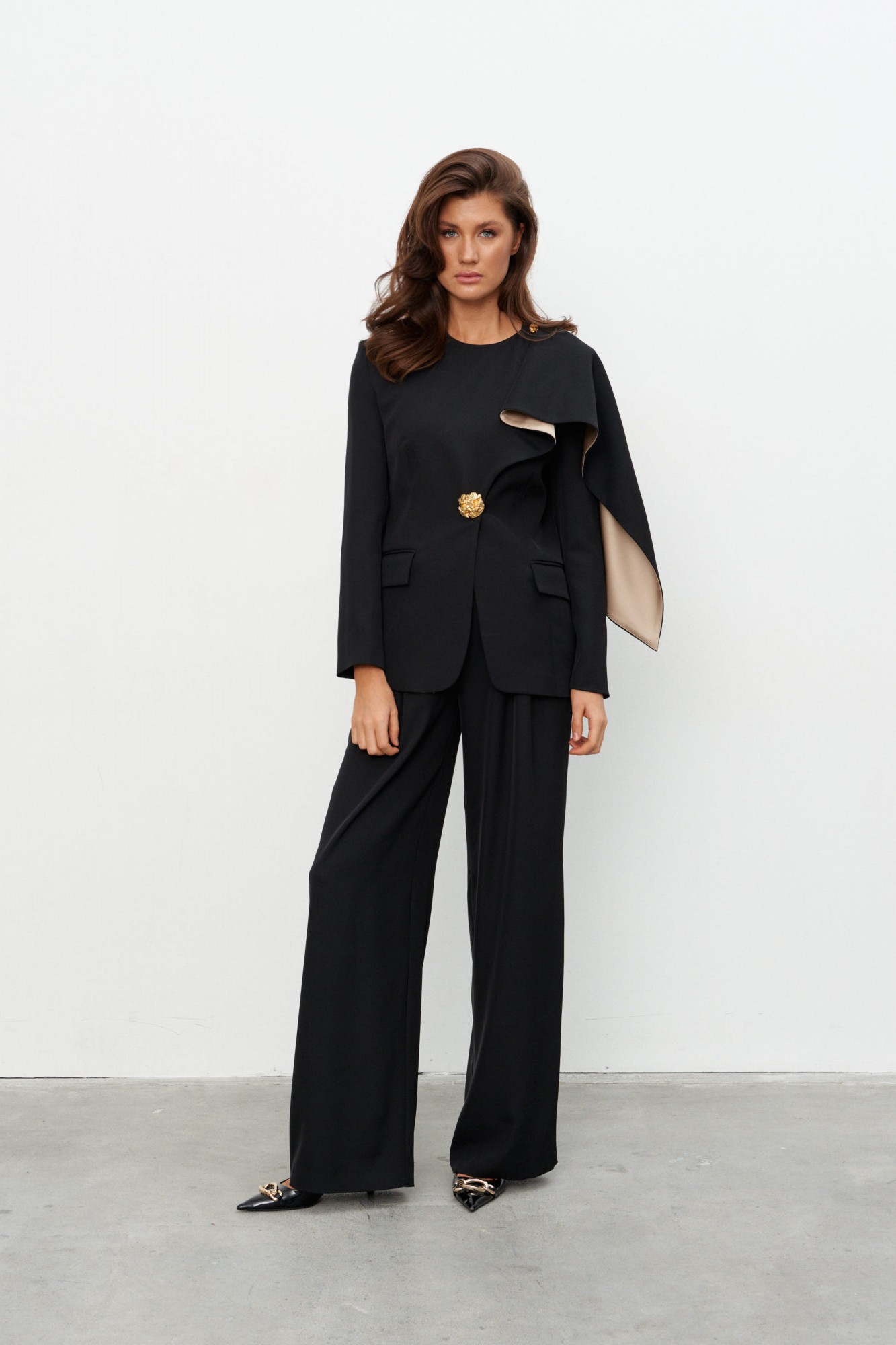 Комплект состоящий из жакета и брюк выполненных из струящейся ткани. Жакет асимметричного кроя с правым бортом переходящим в шаль, которая перекидывается на спину и фиксируется золотой пуговицей возле горловины. Жакет с плечевыми накладками, по переду два прорезных кармана с клапанами. Застёжка на массивную золотую кнопку. Изделие частично на золотистой подкладке в декоративных целях.