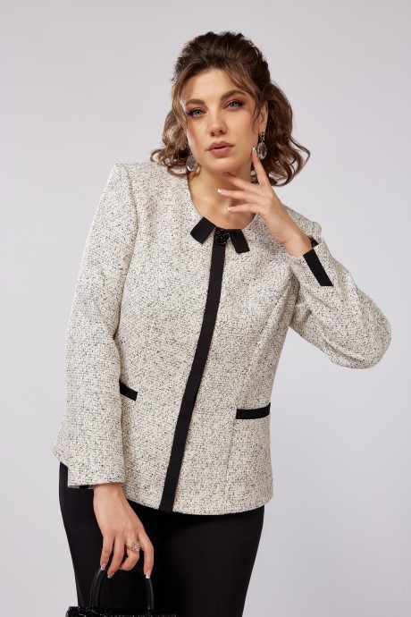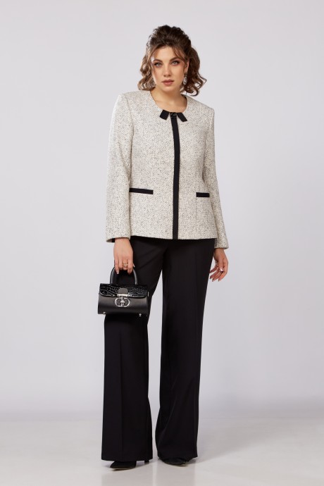Стильный, деловой, брючный костюм из комбинирован двумя видами ткани. Жакет из твида на подкладке полуприлегающего силуэта. Застежка на потайные кнопки. По горловине декоративная отделка с пришивной брошью. По полочке функциональные, прорезные, карманы с листочкой. По спинке талевые вытачки, рукав двухшовный с отделкой.