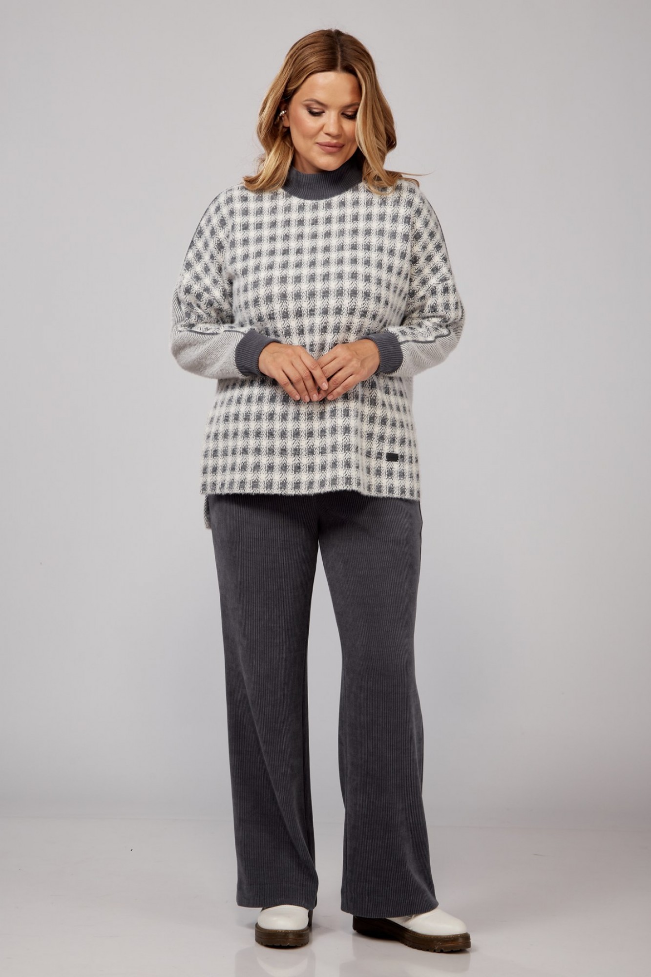 Джемпер: вискоза – 55%, ПА – 42%, ангора – 3%. Брюки: ПЭ – 50%, вискоза – 47%, спандекс – 3%.