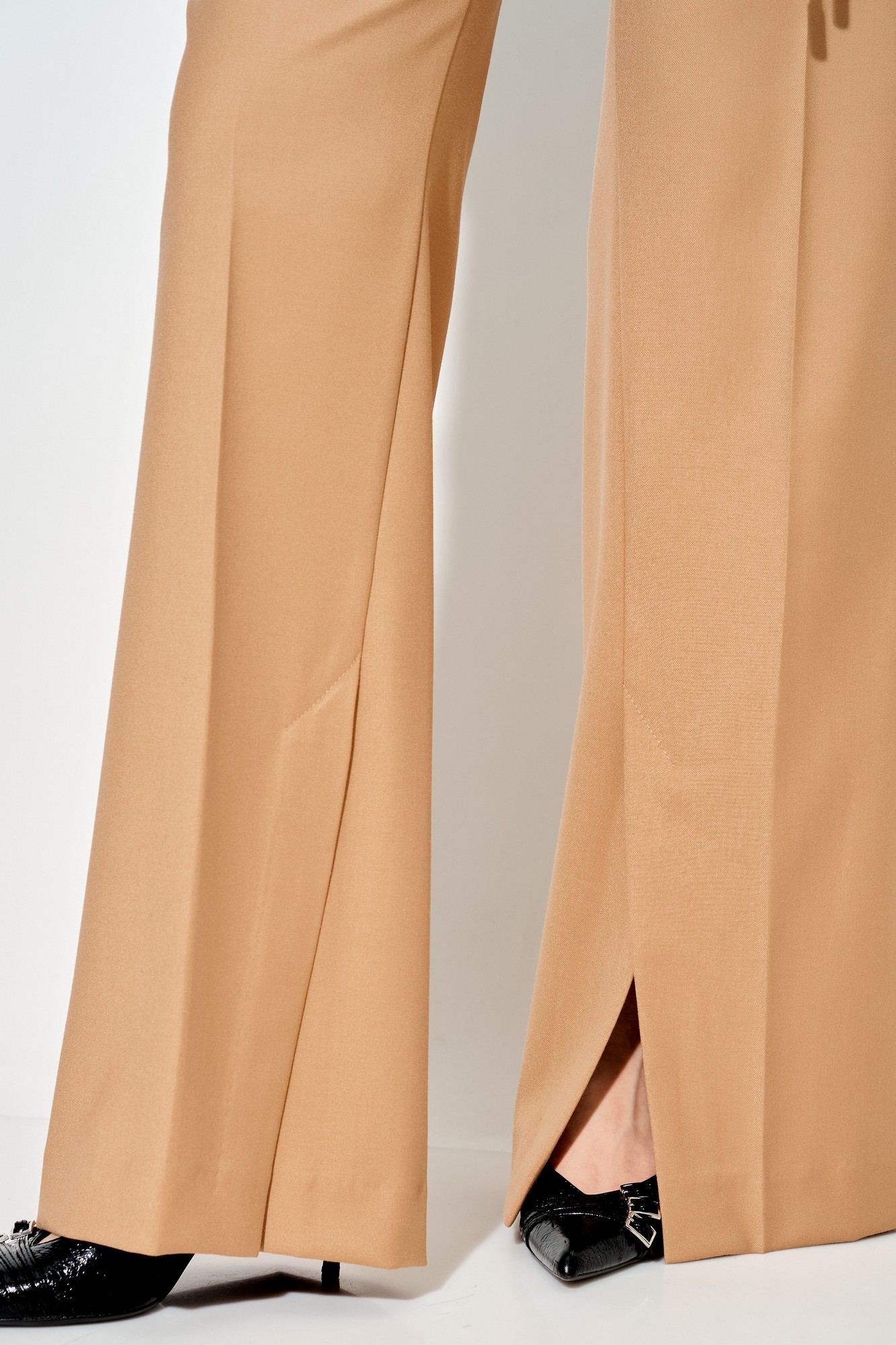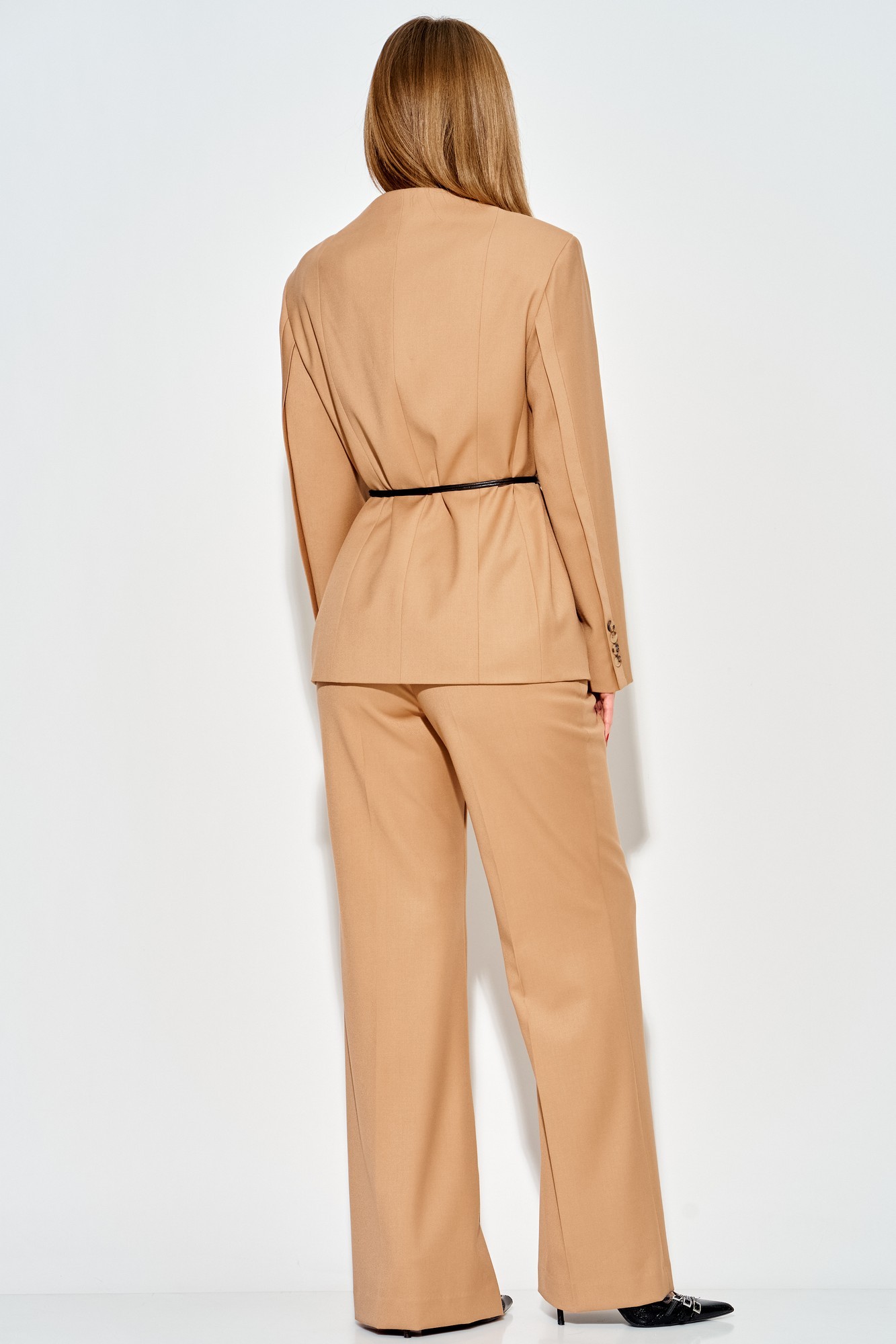 Ультрамодный деловой костюм от LAIKONY, состоящий из жакета и брюк. Жакет полуприлегающего силуэта с центральной застежкой на 4 петли и 4 пуговицы. Вырез горловины жакета фигурной формы. Детали переда жакета с отрезными бочками и вертикальными нагрудными вытачками. Карманы горизонтальные прорезные с листочками с втачными концами. Деталь спинки жакета со средним швом, отрезными бочками и рельефными швами. Рукава втачные двухшовные, по локтевым швам вставлена планка, по низу декоративно прикреплены по 4 пуговицы. Жакет с притачной понизу подкладкой. Съемный пояс в комплекте. Брюки на бедрах, плотно облегающие вверху и расширенные к низу. Пояс притачной, по спинке пояса вставлена эластичная тесьма. Застежка на тесьму-молнию, 1 потайной крючок и 1 потайную петлю и пуговицу. В боковых швах обработаны наклонные карманы, на передних и задних половинках брюк обработаны вытачки и заутюжены «канты». Внизу шаговых швов обработаны шлицы. На поясе прикреплены 5 шлёвок. Декор может отличаться от представленного на фотографии. Наш модный костюм идеально подойдет для деловой встречи и других торжественных мероприятий.