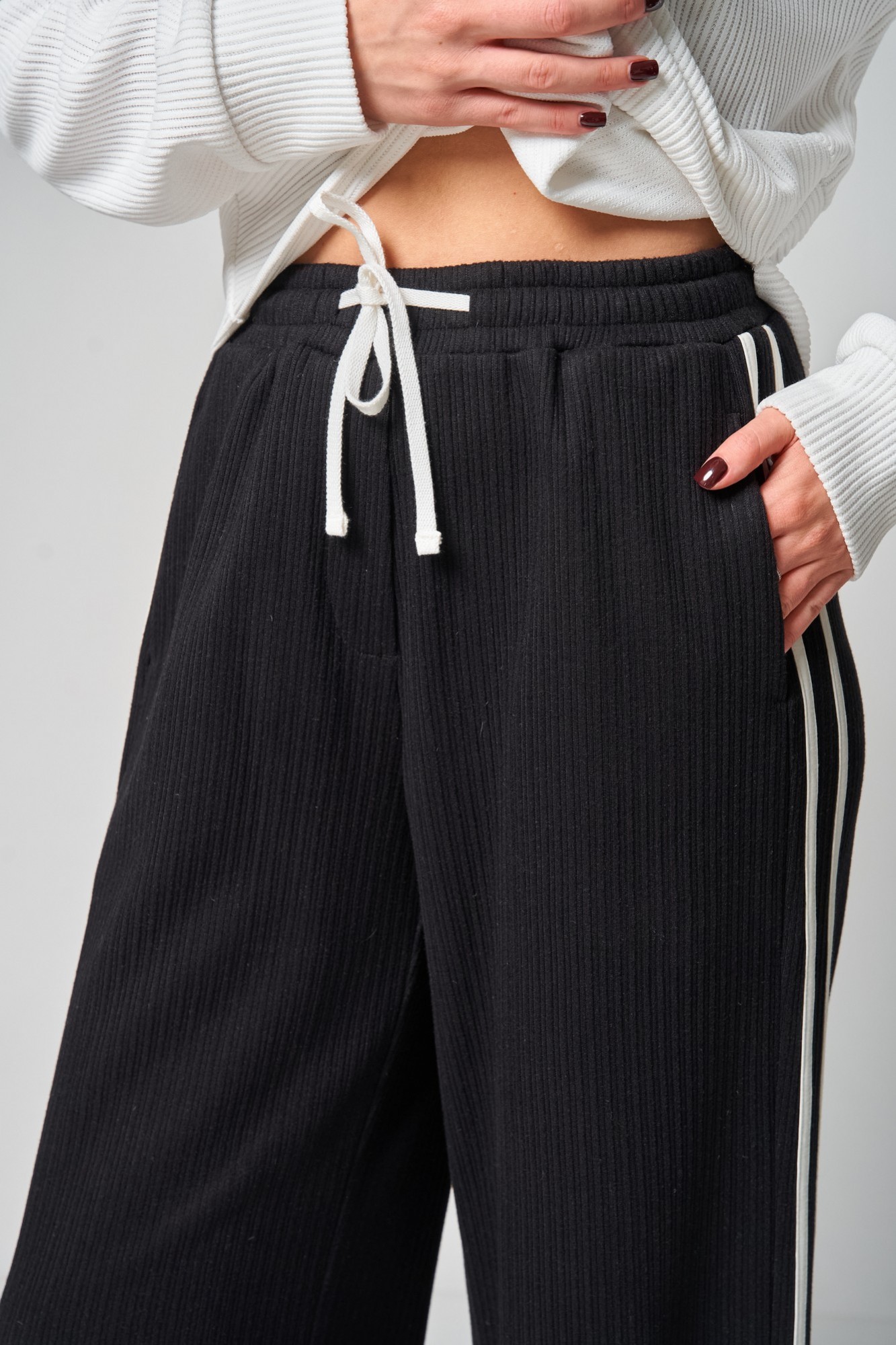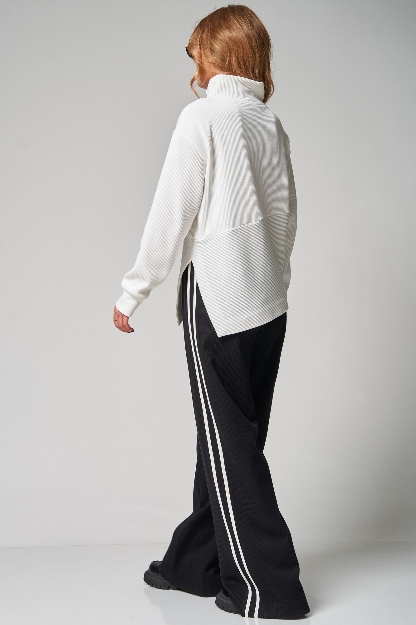 Стильный трикотажный комплект от LAIKONY свободного силуэта, состоящий из джемпера и брюк. Джемпер длиной до линии бедер. Деталь переда джемпера с кокеткой слева, в шве обработана застежка на тесьму-молнию, переходящая на стойку воротника. На уровне линии талии по переду и спинке асимметричным подрез. Рукава втачные одношовные, с притачными манжетами. Линия плача спущена. Джемпер с модной ассиметричной линией низа. Брюки широкие прямые. Пояс притачной, в пояс вставлена эластичная тесьма и декоративный шнур. По боковым швам настрочены две вертикальные отделочные тесьмы, обработаны наклонные карманы. Декор может отличаться от представленного на фотографии. Трикотаж средней плотности, хорошо тянется. Наш модный комплект идеально подойдет для повседневного использования и прогулок на свежем воздухе с друзьями.