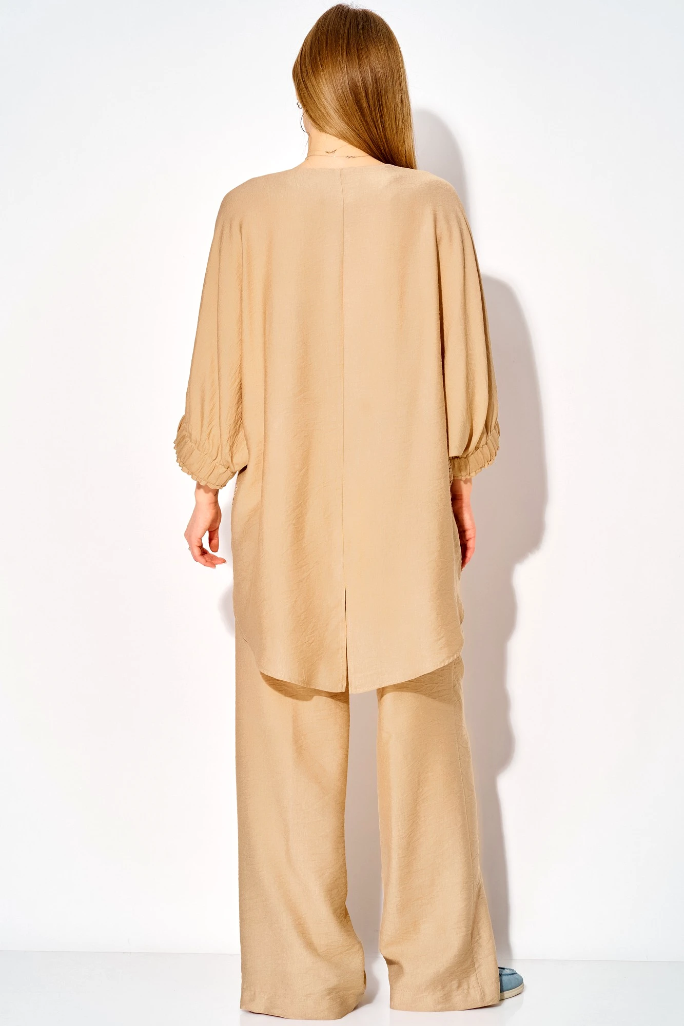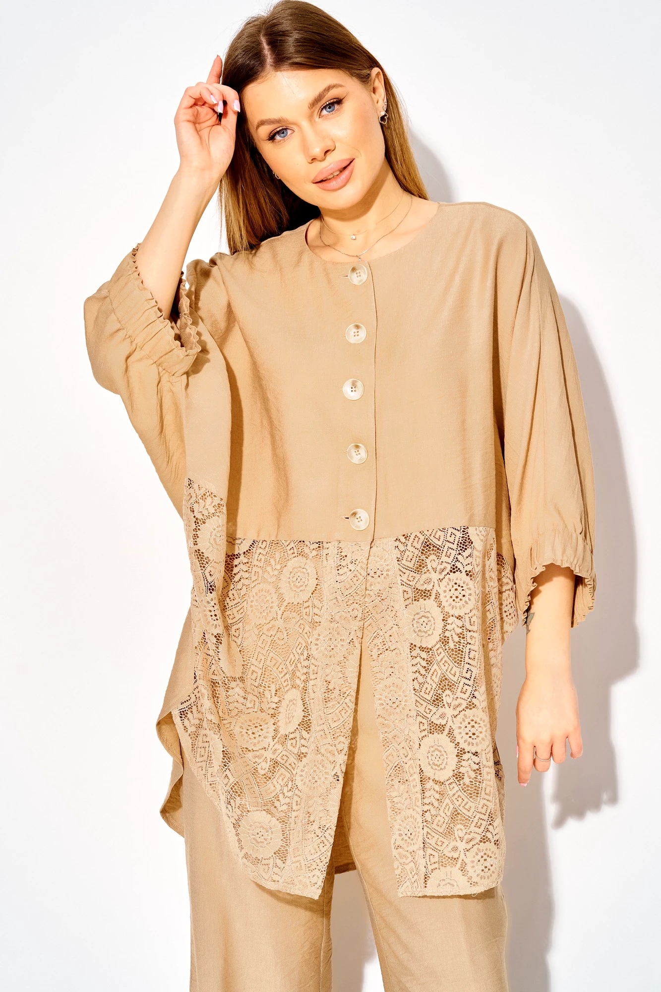 Комфортный летний комплект от LAIKONY свободного силуэта, состоящий из туники и брюк. Туника длиной ниже линии бедер создает эффект легкости и элегантности, а асимметричный низ добавляет оригинальности. Округлый вырез горловины обработан аккуратной обтачкой. Застежка центральная на петли и пуговицы. По полочке выполнен горизонтальный подрез на уровне талии, от которого идет кружевная вставка, что визуально стройнит и придает образу утонченность. Туника с цельнокроеными рукавами, которые снизу собраны на широкую резинку. Спинка со средним швом и разрезом добавляет нотку игривости. В комплекте с туникой идут стильные брюки, которые идеально дополнят ваш образ. Они свободные вверху и прямые к низу, что обеспечивает непревзойденный комфорт в носке. Застежка на молнию и пуговицу, эластичная тесьма на поясе гарантирует идеальную посадку. В боковых швах наклонные карманы. Декор может отличаться от представленного на фотографии. Ткань - мягкая вискоза. Создайте свой уникальный повседневный образ с этой великолепной туникой и брюками, которые подчеркнут вашу индивидуальность и стиль!