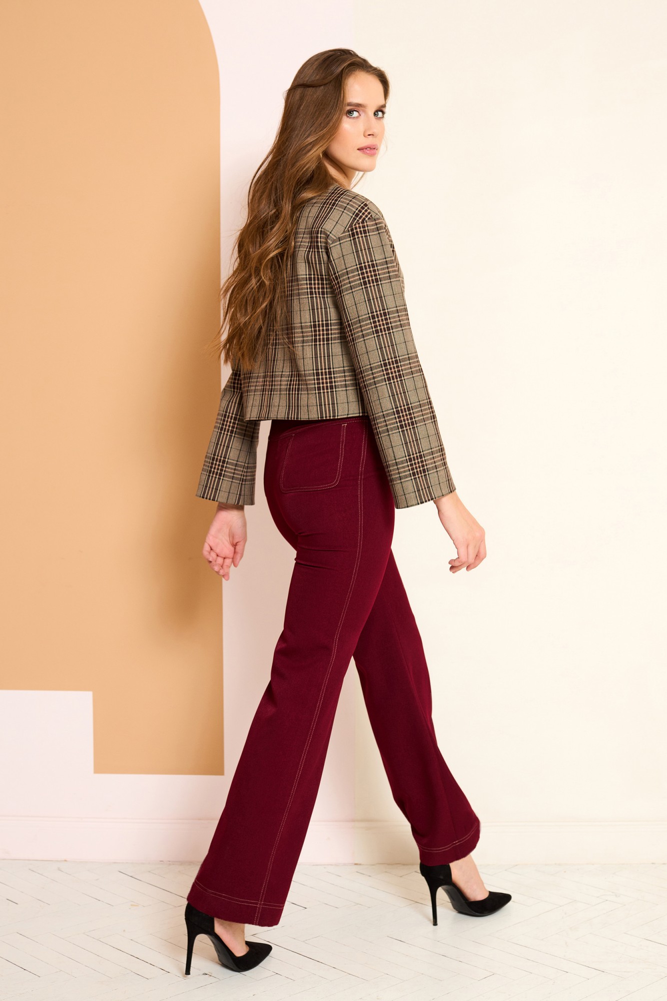 Длинные брюки-клеш оформлены притачным поясом со шлевками, сзади кокетка и накладные карманы. Детали кроя подчеркнуты для эффекта двойными строчками контрастного цвета.