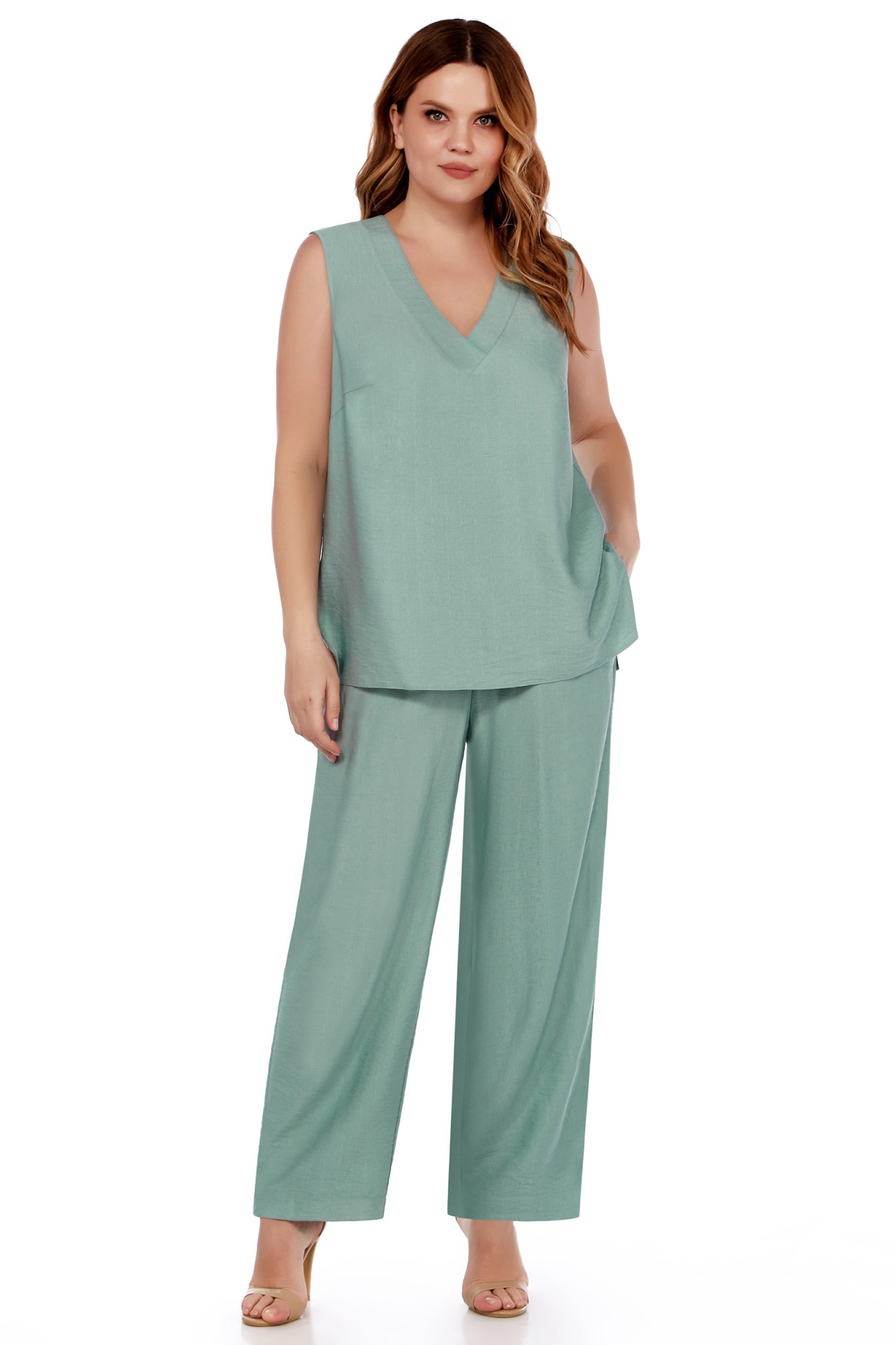 Облегченный жакет (без подкладки) прямого силуэта, с отложным воротником и лацканами. Застежка на три пуговицы. Впереди вертикальные рельефы и карманы, входящие в швы. По спинке центральный шов и рельефы от проймы. Рукав втачной 3/4. Брюки прямые, оформлены поясом с резинкой. У боковых швов – внутренние карманы. Длина 7/8. Топ средней длины, свободного силуэта, выполнен из той же ткани. Удлиненный вырез горловины оформлен притачной деталью. Впереди нагрудные вытачки, по боковым швам разрезы. Облегченный жакет (без подкладки) прямого силуэта, с отложным воротником и лацканами. Застежка на три пуговицы. Впереди вертикальные рельефы и карманы, входящие в швы. По спинке центральный шов и рельефы от проймы. Рукав втачной 3/4. Брюки прямые, оформлены поясом с резинкой. У боковых швов – внутренние карманы. Длина 7/8. Топ средней длины, свободного силуэта, выполнен из той же ткани. Удлиненный вырез горловины оформлен притачной деталью. Впереди нагрудные вытачки, по боковым швам разрезы.