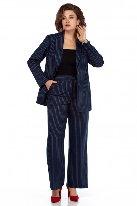 Комплект выполнен в морском стиле, актуальном в нынешнем сезоне. Жакет полуприлегающего силуэта с отложным воротником и лацканами, застёжка на одну пуговицу. Впереди рельефы + вытачка, накладные карманы с клапанами и пуговицами. По спинке шов. Рукав длинный. Детали жакета подчеркнуты двойными строчками. Жакет на подкладке «Гранд». Брюки длинные, прямые, оформлены притачным поясом на талии (по бокам резинки), застежка «молния» + пуговица. Накладные карманы со входом сбоку. Вдоль бокового шва – открытая шлица на застежке сквозь петли на пуговицы. Детали брюк подчеркнуты двойными строчками.
