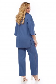 Комплект двухпредметный: рубашка, брюки. Комплект выполнен из натурального льна с декором кружевной тесьмой. Рубашка средней длины, свободного силуэта, с отложным воротником на стойке, застежка по планке на пуговицы. Впереди кокетка, у кокетки - складочки, нагрудные вытачки, вертикальные вставки из кружевной тесьмы. По спинке кокетка, по центру декор тесьмой, спинка чуть ниже переда, по боковым швам - разрезы. Линия плеча приспущена, рукав 3/4, внизу разрез, сверху декор тесьмой. Брюки длинные, прямые, оформлены притачным поясом (сзади резинка), застежка "молния" + пуговица, у боковых швов - внутренние карманы. Брюки с вертикальными боковыми вставками декором тесьмой.