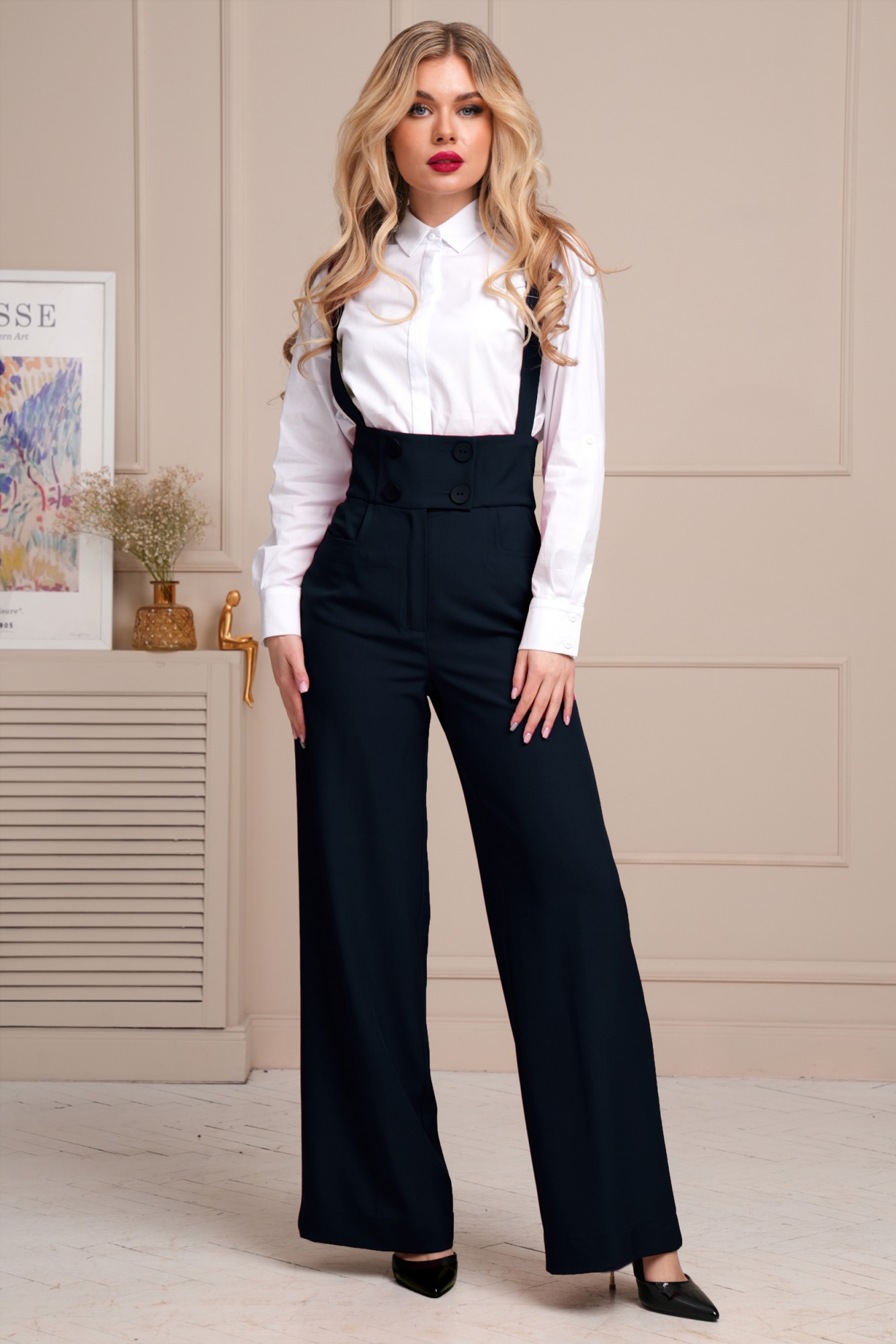 Брюки длинные, прямые, оформлены широким корсажным поясом. Бретели съёмные на пуговицах. Застежка на пуговицы и «молнию». Сзади листочки.