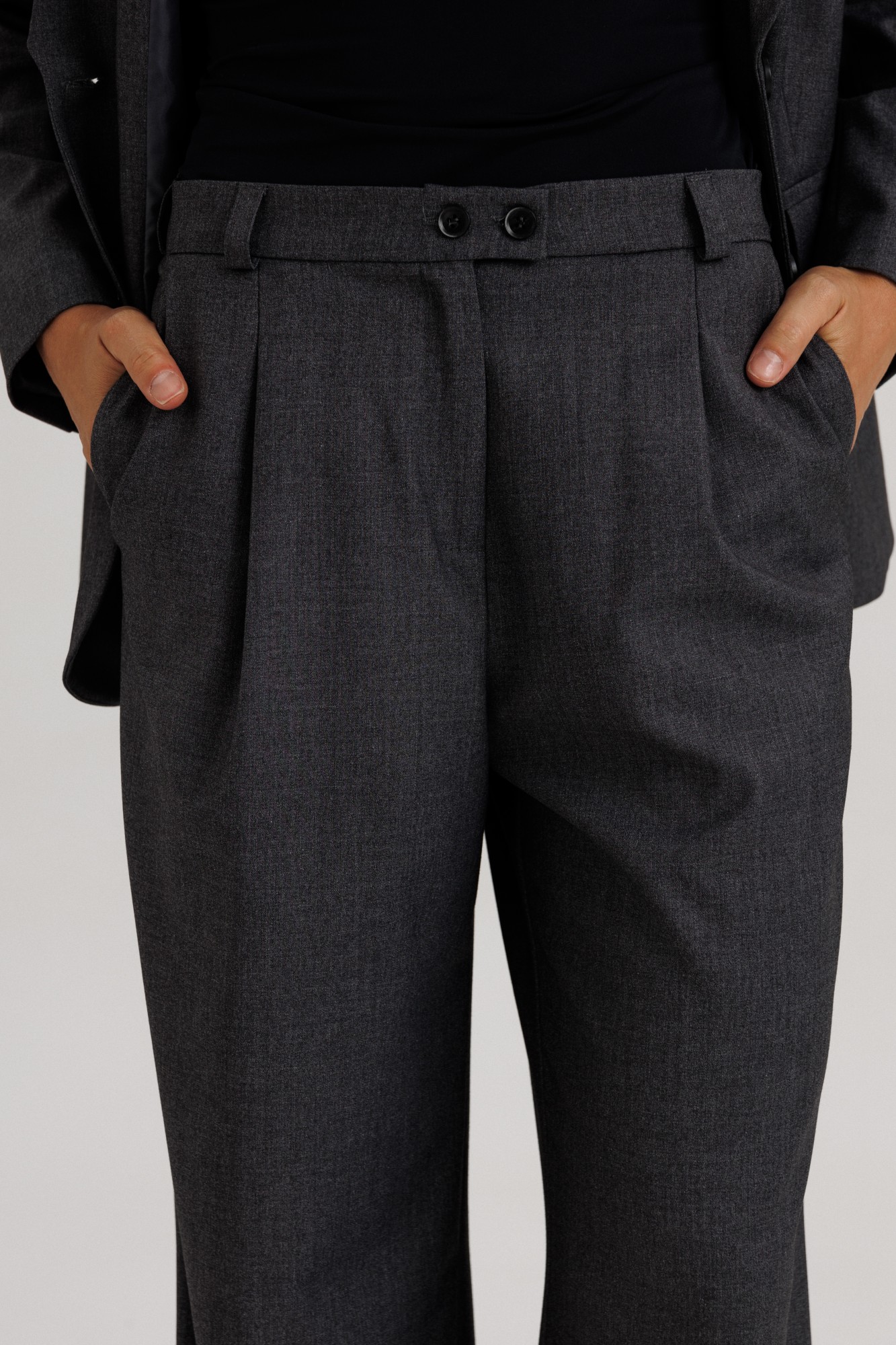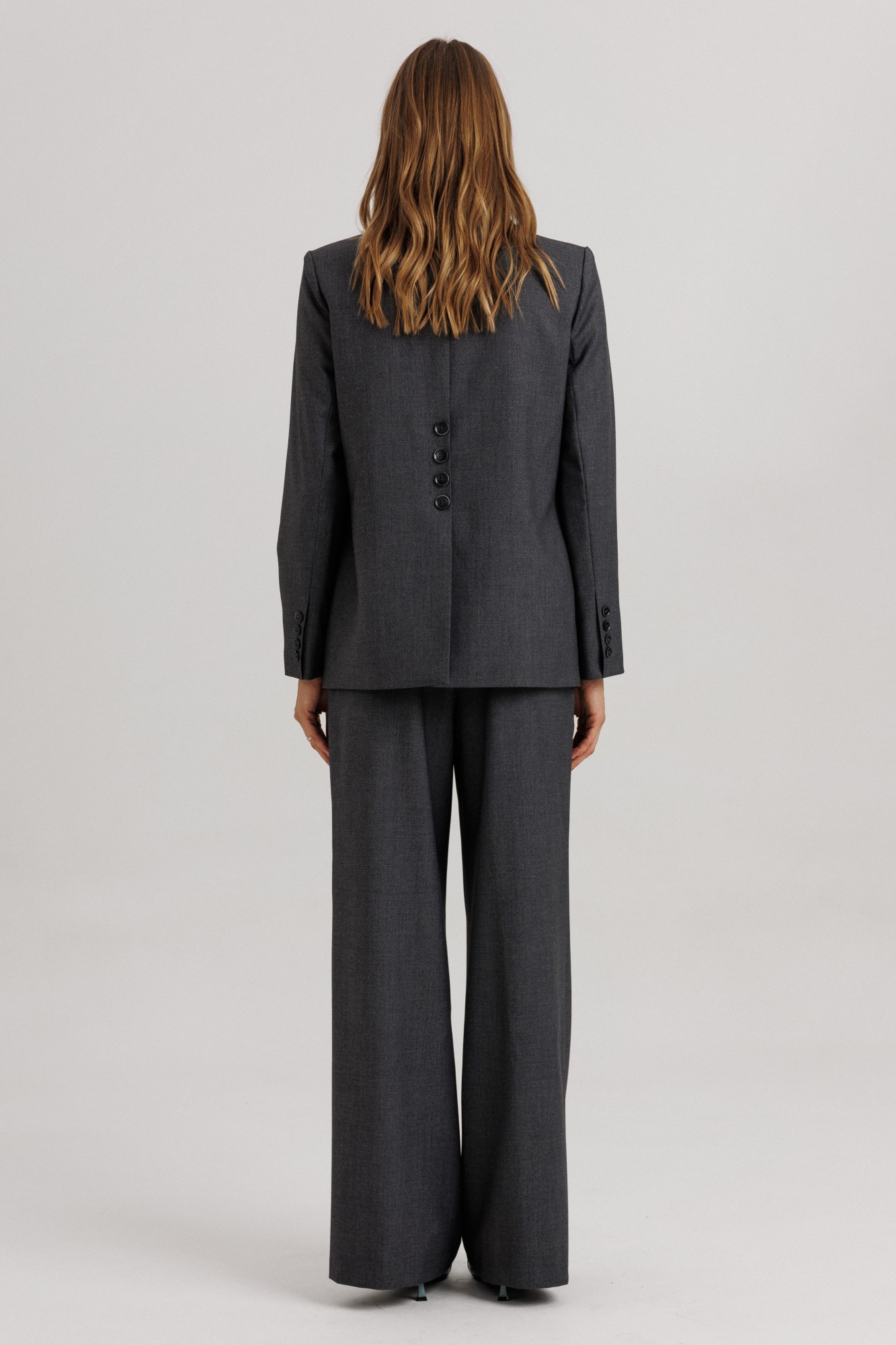 Стильный гармоничный комплект в стиле умеренного оверсайза, состоящий из свободного жакета и широких брюк. Эффектной деталью комплекта выступает высокая открытая шлица на спинке жакета, закрепленная пуговицами. Жакет прямого свободного силуэта на подкладке. На полочке изделия расположены вертикальные выточки и притачные боковые детали. Фронтально горизонтально расположены функциональные прорезные карманы с листочкой и клапаном. Горловина оформлена глубоким английским отложным воротником с лацканами. На спинке жакета расположена открытая высокая шлица (38 см) в среднем шве изделия, которая закреплена нефункциональными пуговицами. Длина изделия жакета по среднему шву жакета 69-71 см (в зависимости от размерного ряда). Рукав двухшовный, длиной 60-61 см. Брюки комплекта созданы в свободном стиле. В пояс брюк по спинке вставлена эластичная тесьма, шириной 3 см. Спереди пояс фиксируется горизонтально на петли/пуговицы и вертикалную закрытую клапан-молнию (гульфик). При желании в пояс можно вставить ремень, так как имеются шлевочные держатели. В боковых швах карманы с наклонным входом, на поясной линии талии переда расположена неглубокая складка для свободы движения, на задних полотнищах линии талии: вытачки. Длина брюк по боковому шву 108 см (без учета высоты пояса). (фурнитура может отличаться от представленной на рекламном фотоматериале). Особые рекомендации: рекомендуется холодная деликатная ручная стирка, без использования отбеливающих СМС, без интенсивного трения. Сушка в вертикальном положении. ВТО с минимальным паром.