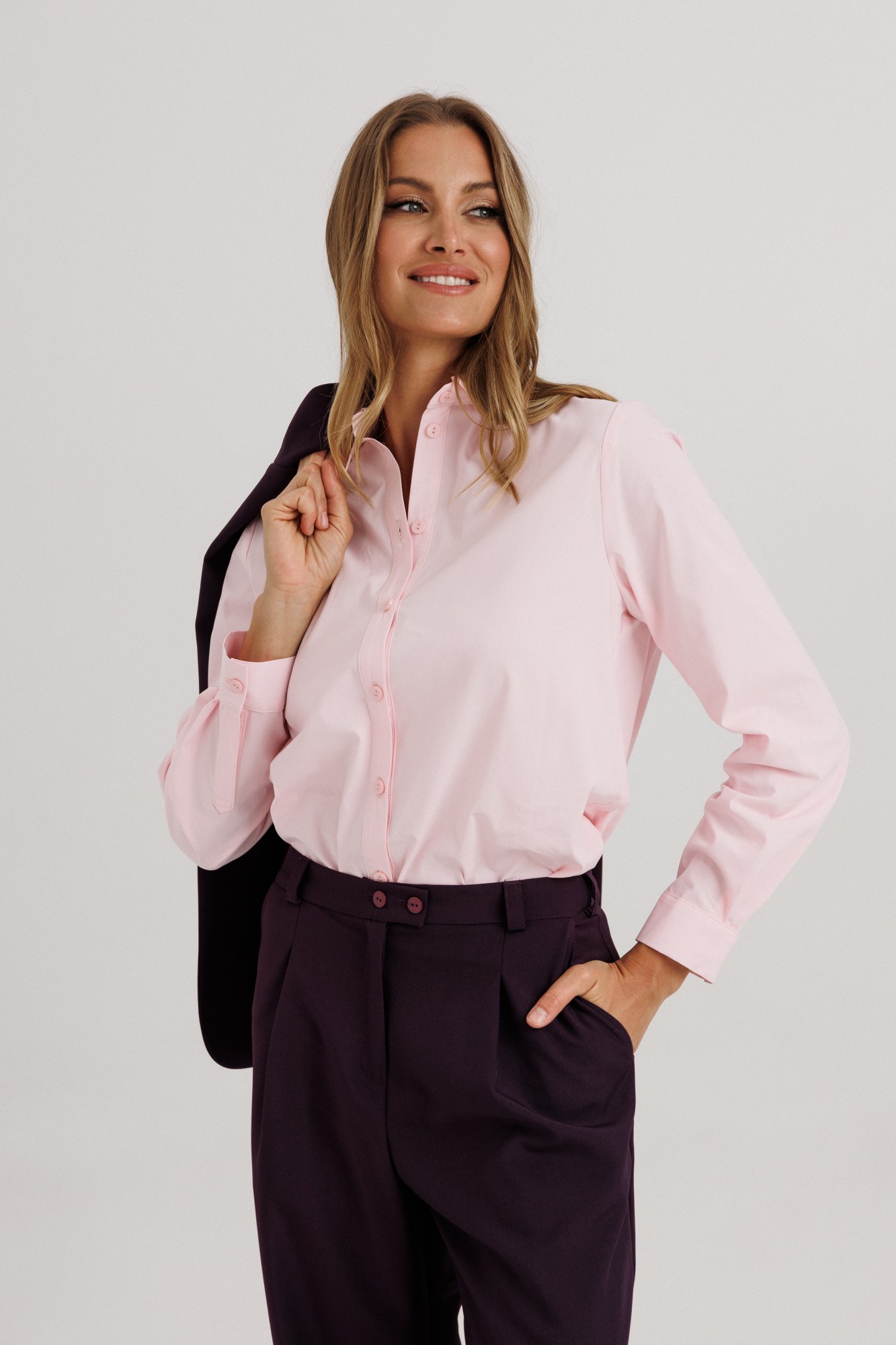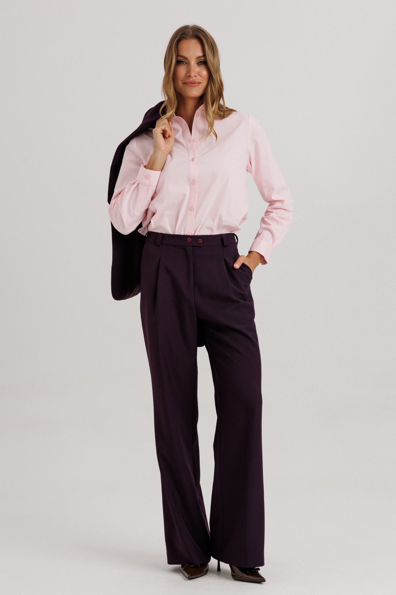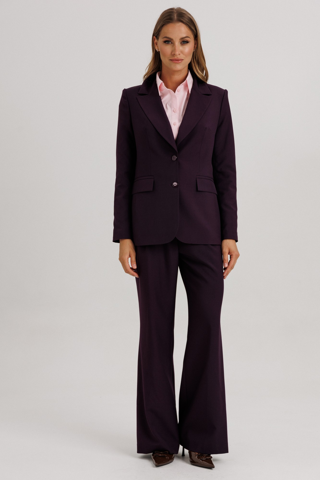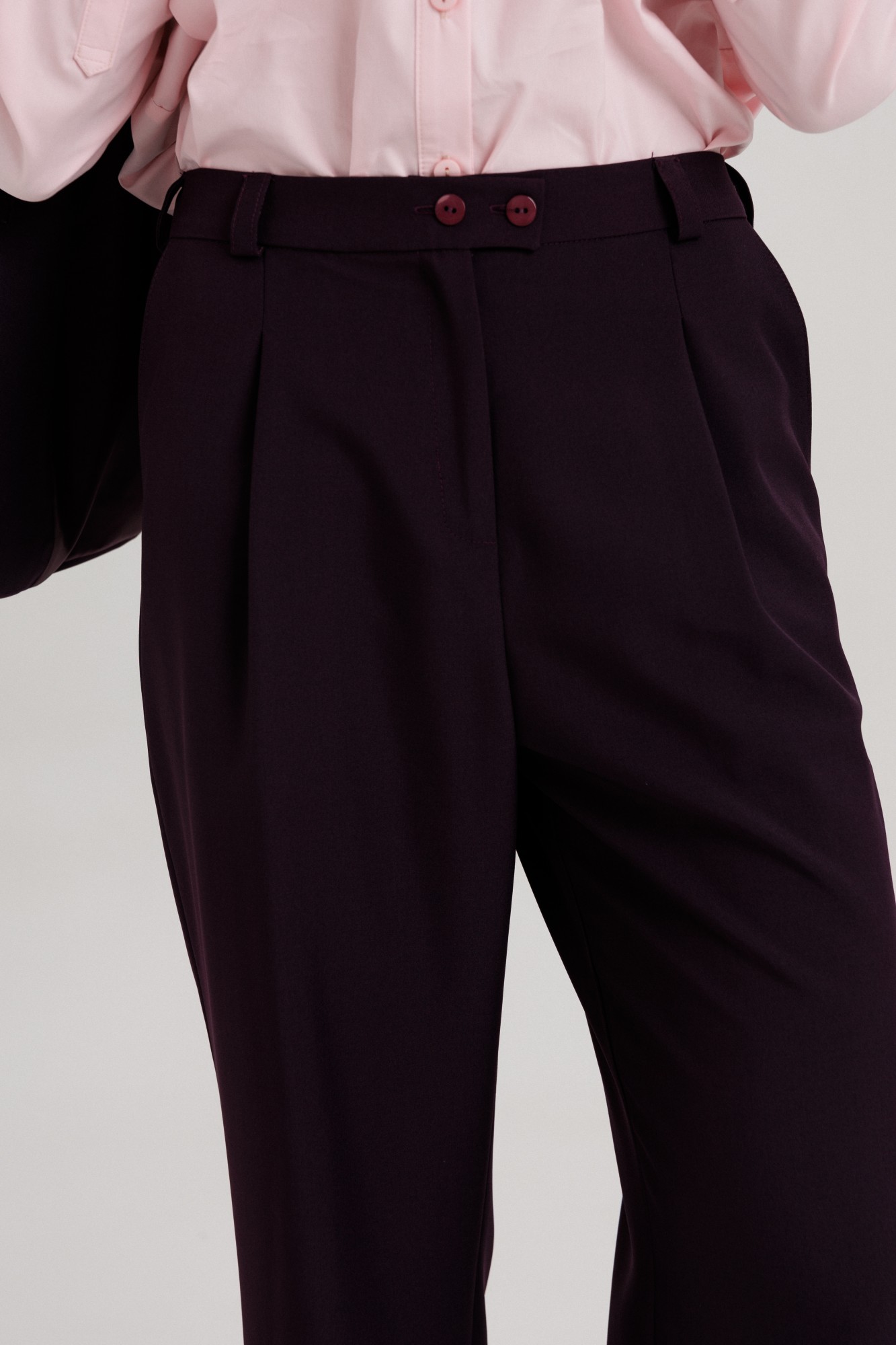 Стильный гармоничный комплект в стиле умеренного оверсайза, состоящий из свободного жакета и широких брюк, а также блузона. Эффектной деталью комплекта выступает высокая открытая шлица на спинке жакета, закрепленная пуговицами. Жакет прямого свободного силуэта на подкладке. На полочке изделия расположены вертикальные выточки и притачные боковые детали. Фронтально горизонтально расположены функциональные прорезные карманы с листочкой и клапаном. Горловина оформлена глубоким английским отложным воротником с лацканами. На спинке жакета расположена открытая высокая шлица (38 см) в среднем шве изделия, которая закреплена нефункциональными пуговицами. Длина изделия жакета по среднему шву жакета 69-71 см (в зависимости от размерного ряда). Рукав двухшовный, длиной 60-61 см. Брюки комплекта созданы в свободном стиле. В пояс брюк по спинке вставлена эластичная тесьма, шириной 3 см. Спереди пояс фиксируется горизонтально на петли/пуговицы и вертикалную закрытую клапан-молнию (гульфик). При желании в пояс можно вставить ремень, так как имеются шлевочные держатели. В боковых швах карманы с наклонным входом, на поясной линии талии переда расположена неглубокая складка для свободы движения, на задних полотнищах линии талии: вытачки. Длина брюк по боковому шву 108 см (без учета высоты пояса). Блуза рубашечного покроя с втачным одношовным рукавом с манжетой. Спинка изделия состоит из горизонтальной кокетки и основной детали, на которой расположены 2 складки для свободы движения. Линия низа: фигурная. Рукав втачной, одношовный, с притачной манжетой, высотой 5,5 см и разрезом-планкой для петли/ пуговицы. Высота планки 11 см. Длина рукава в готовом виде 61 см. Горловина оформлена стойкой и рубашечным воротником. Застежка вертикальная на планках петли/ пуговицы. Длина блузы по спинке 74- 76 см (в зависимости от размерного ряда). (фурнитура может отличаться от представленной на рекламном фотоматериале). Особые рекомендации: рекомендуется холодная деликатная ручная стирка, без использования отбеливающих СМС, без интенсивного трения. Сушка в вертикальном положении. ВТО с минимальным паром.