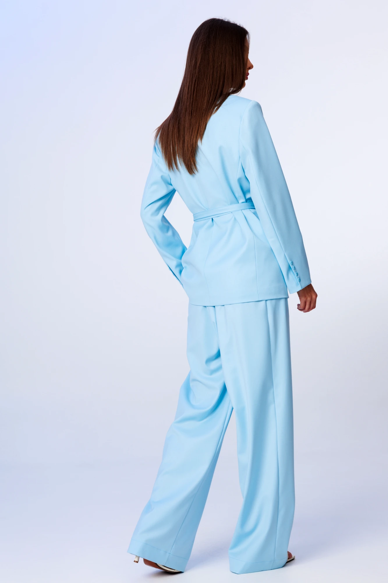 Стильный гармоничный комплект, состоящий из жакета и свободных брюк в стиле палаццо. Жакет прямого свободного силуэта на подкладке с двухшовным рукавом, длиной 61-62 см с закрытой шпицей, на которой вертикально расположены 4 пуговицы. Английский отложной на стойке воротник, застежка однобортная фронтальная петли/пуговицы с закругленными бортами. На полочке расположены горизонтальные прорезные фигурные карманы с клапаном. Спинка жакета имеет средний шов. Детали кроя имеют рельефный бочок для удачной посадки изделия. Длина изделия по среднему шву спинки 71-73 см в зависимости от размерного ряда. Брюки комплекта созданы в свободном стиле палаццо. В пояс брюк по спинке вставлена эластичная тесьма, шириной 3 см. Спереди пояс фиксируется горизонтально на петли/пуговицы и вертикальную закрытую клапан-молнию (гульфик). При желании в пояс можно вставить ремень, так как имеются шлевочные держатели. В боковых швах карманы с наклонным входом, на поясной линии талии расположены две неглубокие складки для свободы движения. Длина брюк по боковому шву 105-107 см в зависимости от размерного ряда. Дополнительно в комплекте присутствует текстильный пояс и текстильная брошь. (фурнитура может отличаться от представленной на рекламном фотоматериале). Особые рекомендации: рекомендуется холодная деликатная ручная стирка, без использования отбеливающих СМС, без интенсивного трения. Сушка в вертикальном положении. ВТО с минимальным паром.