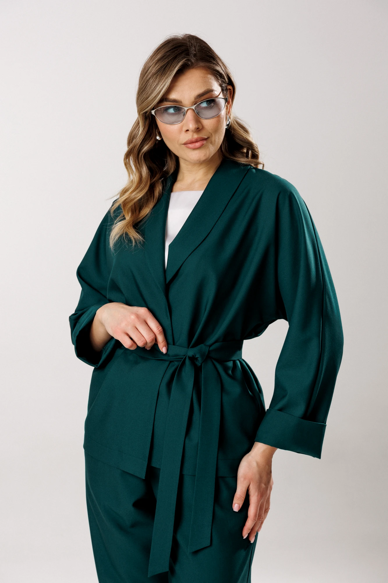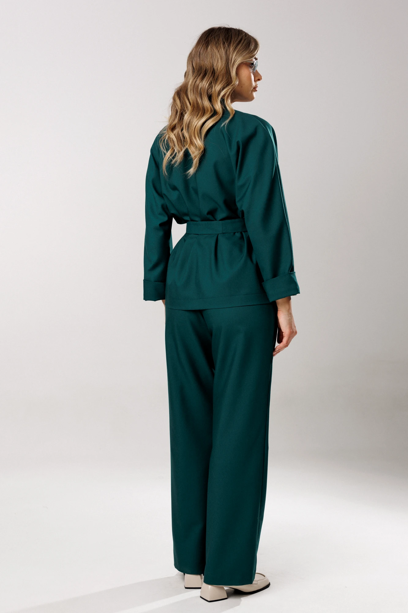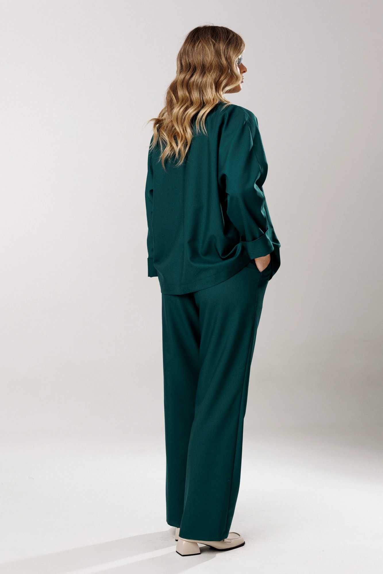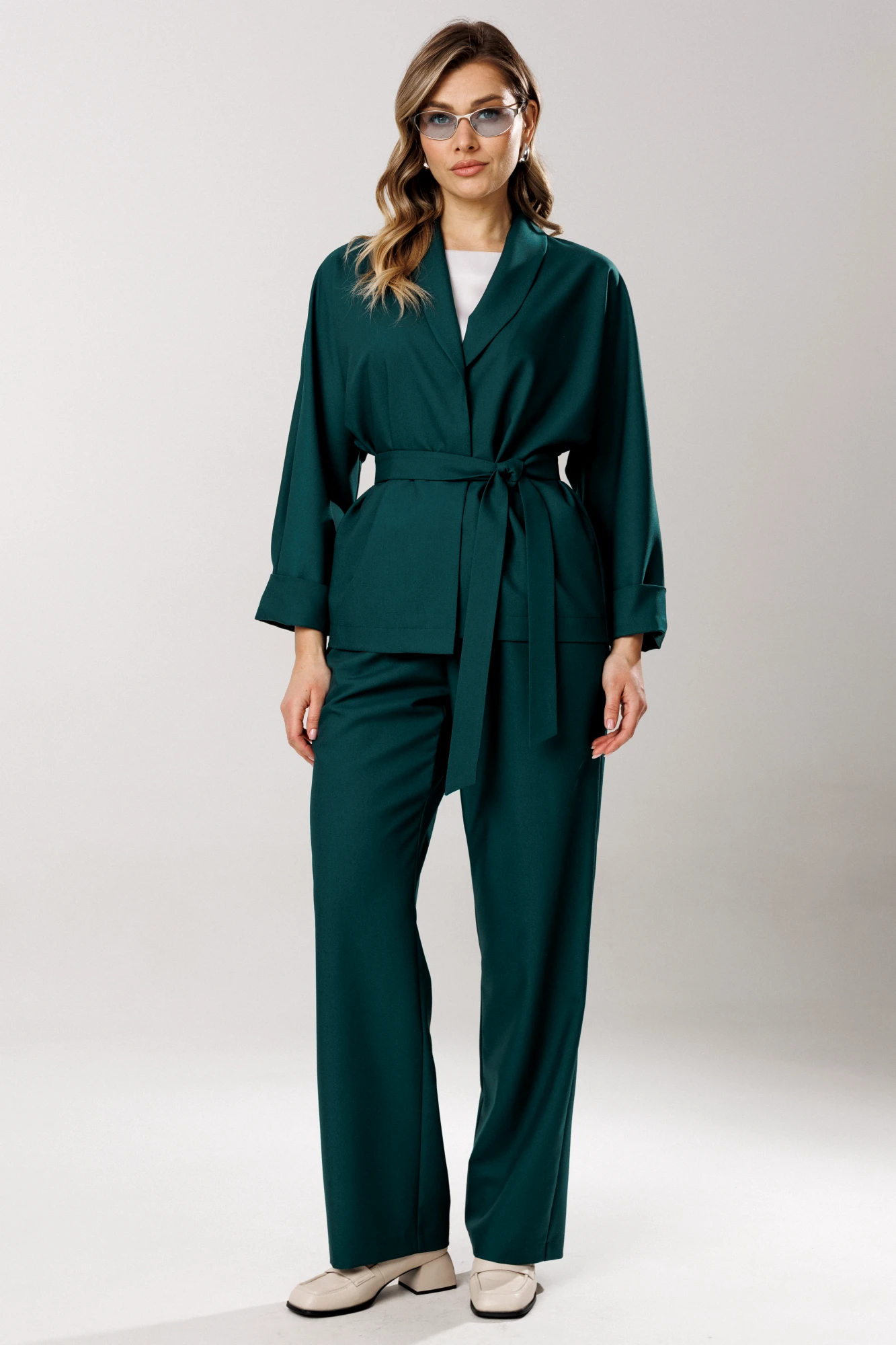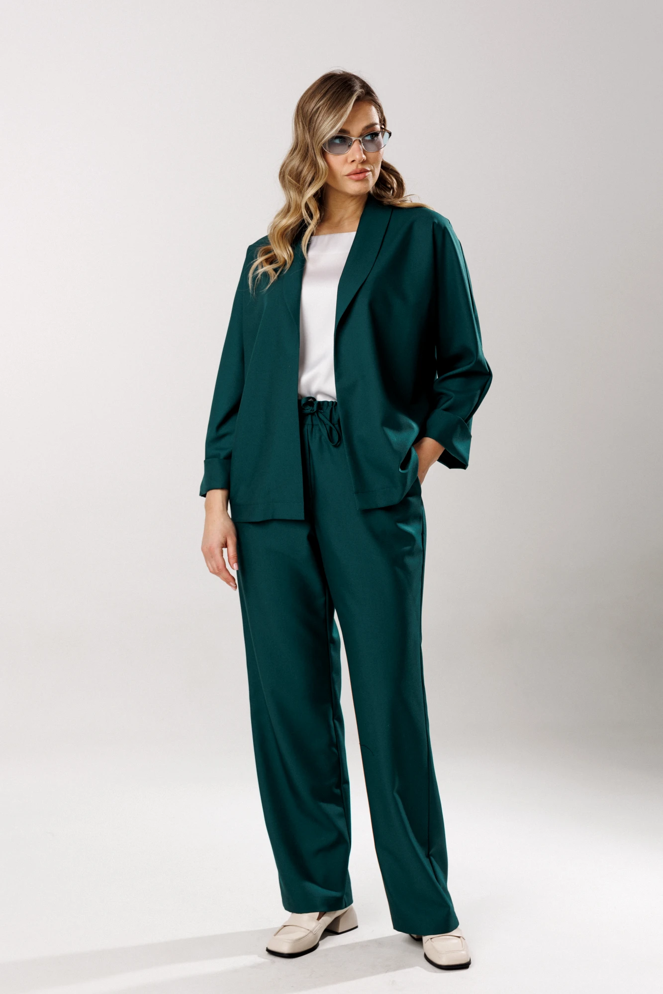 Шикарный комплект, состоящий из свободного прямого блузона с поясом, прямых брюк и топ-блузы. Блузон жакетного типа, без подкладки, прямого силуэта с цельнокройным рукавом. Рукав длины 7/8 с притачным манжетом-отворотом, высотой 7 см. Горловина представлена цельнокройным отложным лацканом-шаль. Борта изделия без застежки. Длина изделия блузона по спинке 67 см. Блузон дополнен съемным текстильным поясом, шириной 4 см. Брюки свободного прямого силуэта с притачным поясом на эластичной тесьме и шнуром. На задних полотнищах расположена притачная кокетка, спереди внутренние карманы с наклонным входом. Пояс притачной, внутрь вложена для свободы движения эластичная тесьма (резинка 3,5 см) и текстильный шнур. Длина брюк по боковому шву 103 см. Блуза прямого силуэта, без рукавов. На полочке изделия расположены горизонтальные вытачки. В боковых швах открытые разрезы (10 см). Горловина оформлена округленным вырезом-каре на обтачной детали. Линия плеча обработана окантовочной тесьмой с фиксированным подгибом. Длина блузы 62-65 см (в зависимости от размерного ряда). (фурнитура может отличаться от представленной на рекламном фотоматериале). Особые рекомендации: рекомендуется холодная деликатная ручная стирка, без использования отбеливающих СМС, без интенсивного трения. Сушка в вертикальном положении. ВТО с минимальным паром.