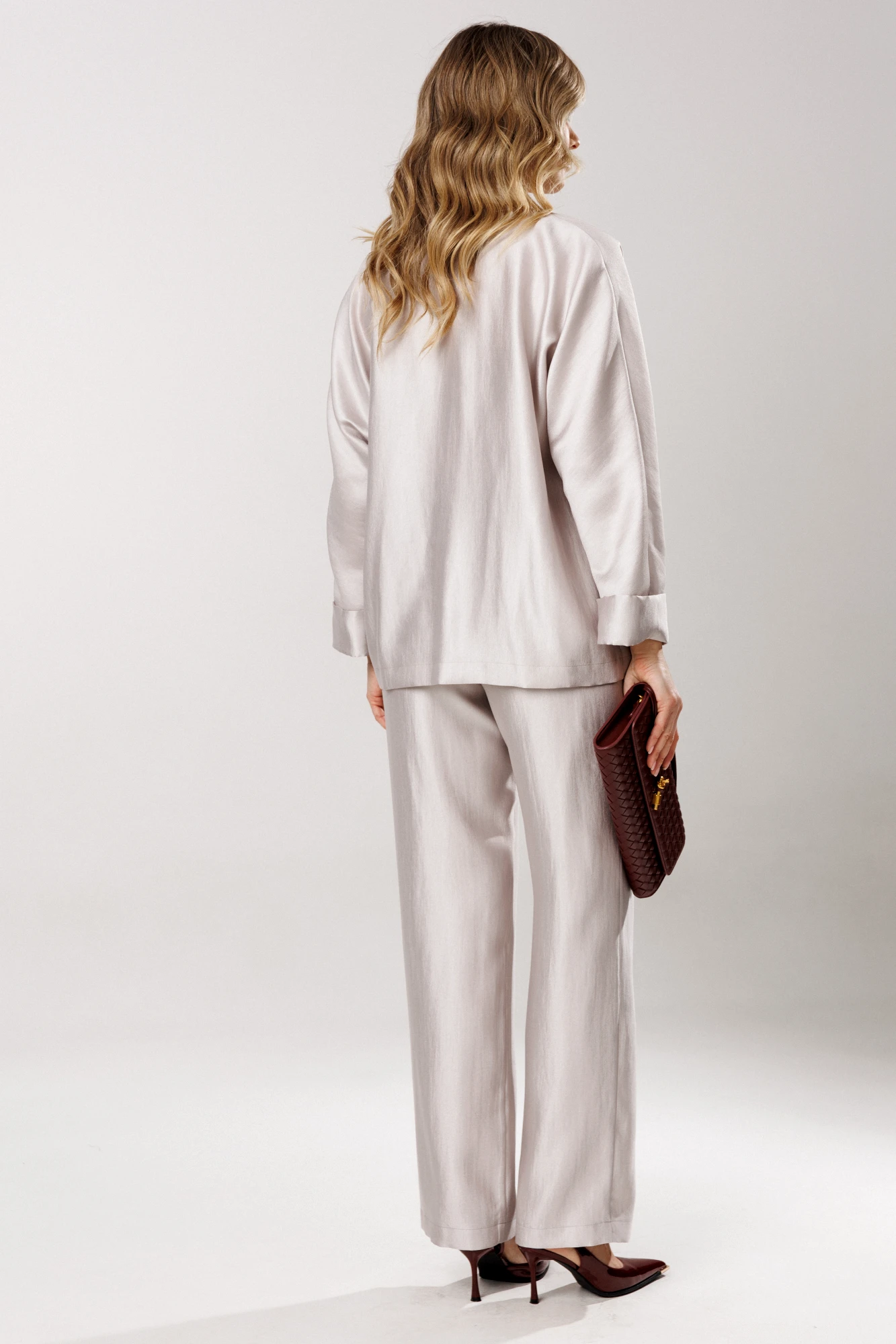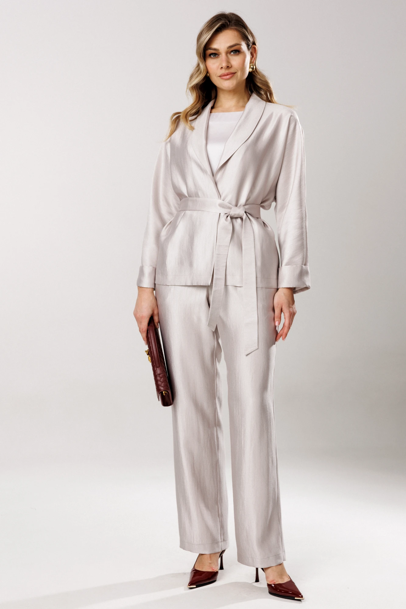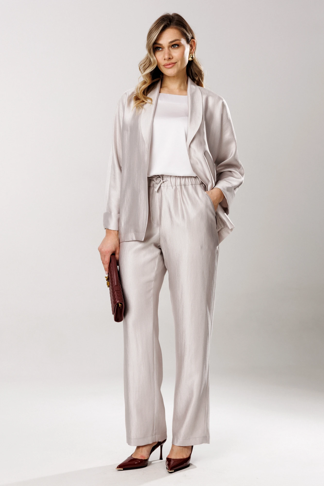 Шикарный комплект, состоящий из свободного прямого блузона с поясом, прямых брюк и топ-блузы. Блузон жакетного типа, без подкладки, прямого силуэта, с цельнокройным рукавом. Рукав длины 7/8 с притачным манжетом-отворотом, высотой 7 см. Горловина представлена цельнокройным отложным лацканом-шаль. Борта изделия без застежки. Длина изделия блузона по спинке 67 см. Блузон дополнен съемным текстильным поясом, шириной 4 см. Брюки свободного прямого силуэта с притачным поясом на эластичной тесьме и шнуром. На задних полотнищах расположена притачная кокетка, спереди внутренние карманы с наклонным входом. Пояс притачной, внутрь вложена для свободы движения эластичная тесьма (резинка 3,5 см) и текстильный шнур. Длина брюк по боковому шву 103 см. Блуза прямого силуэта, без рукавов. На полочке изделия расположены горизонтальные вытачки. В боковых швах открытые разрезы (10 см). Горловина оформлена округленным вырезом-каре на обтачной детали. Линия плеча обработана окантовочной тесьмой с фиксированным подгибом. Длина блузы 62-65 см (в зависимости от размерного ряда). (фурнитура может отличаться от представленной на рекламном фотоматериале). Особые рекомендации: рекомендуется холодная деликатная ручная стирка, без использования отбеливающих СМС, без интенсивного трения. Сушка в вертикальном положении. ВТО с минимальным паром.