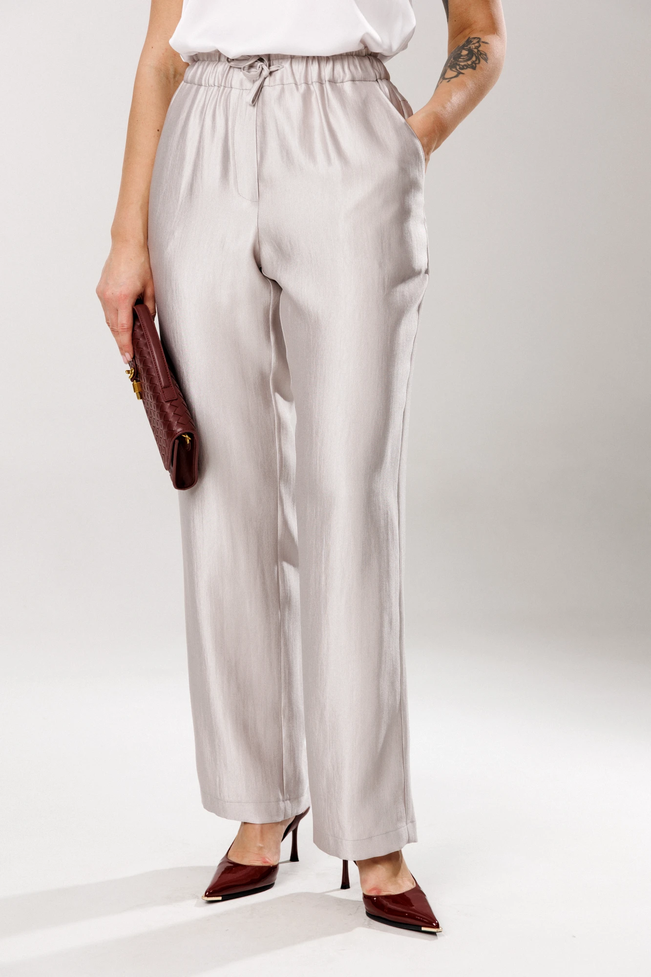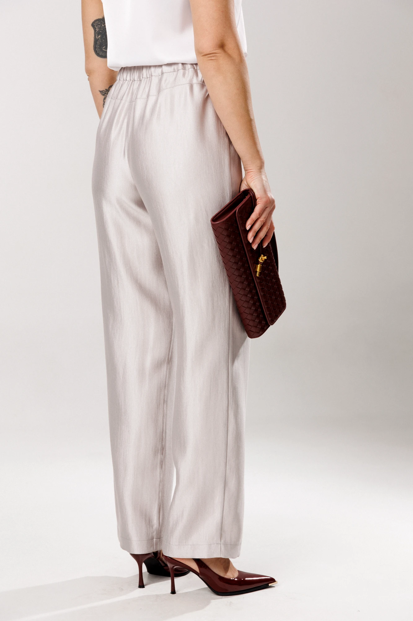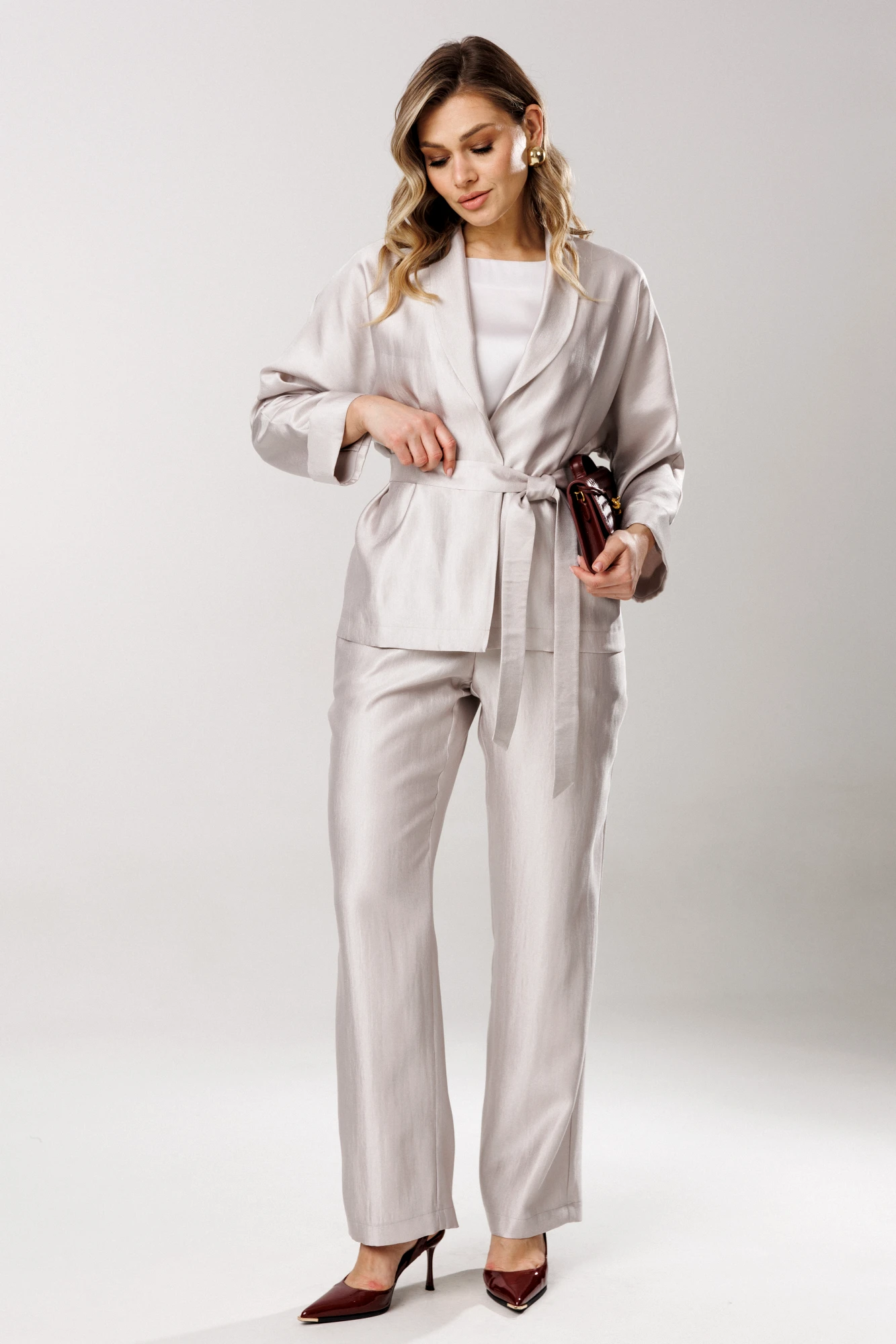 Шикарный комплект, состоящий из свободного прямого блузона с поясом, прямых брюк и топ-блузы. Блузон жакетного типа, без подкладки, прямого силуэта, с цельнокройным рукавом. Рукав длины 7/8 с притачным манжетом-отворотом, высотой 7 см. Горловина представлена цельнокройным отложным лацканом-шаль. Борта изделия без застежки. Длина изделия блузона по спинке 67 см. Блузон дополнен съемным текстильным поясом, шириной 4 см. Брюки свободного прямого силуэта с притачным поясом на эластичной тесьме и шнуром. На задних полотнищах расположена притачная кокетка, спереди внутренние карманы с наклонным входом. Пояс притачной, внутрь вложена для свободы движения эластичная тесьма (резинка 3,5 см) и текстильный шнур. Длина брюк по боковому шву 103 см. Блуза прямого силуэта, без рукавов. На полочке изделия расположены горизонтальные вытачки. В боковых швах открытые разрезы (10 см). Горловина оформлена округленным вырезом-каре на обтачной детали. Линия плеча обработана окантовочной тесьмой с фиксированным подгибом. Длина блузы 62-65 см (в зависимости от размерного ряда). (фурнитура может отличаться от представленной на рекламном фотоматериале). Особые рекомендации: рекомендуется холодная деликатная ручная стирка, без использования отбеливающих СМС, без интенсивного трения. Сушка в вертикальном положении. ВТО с минимальным паром.