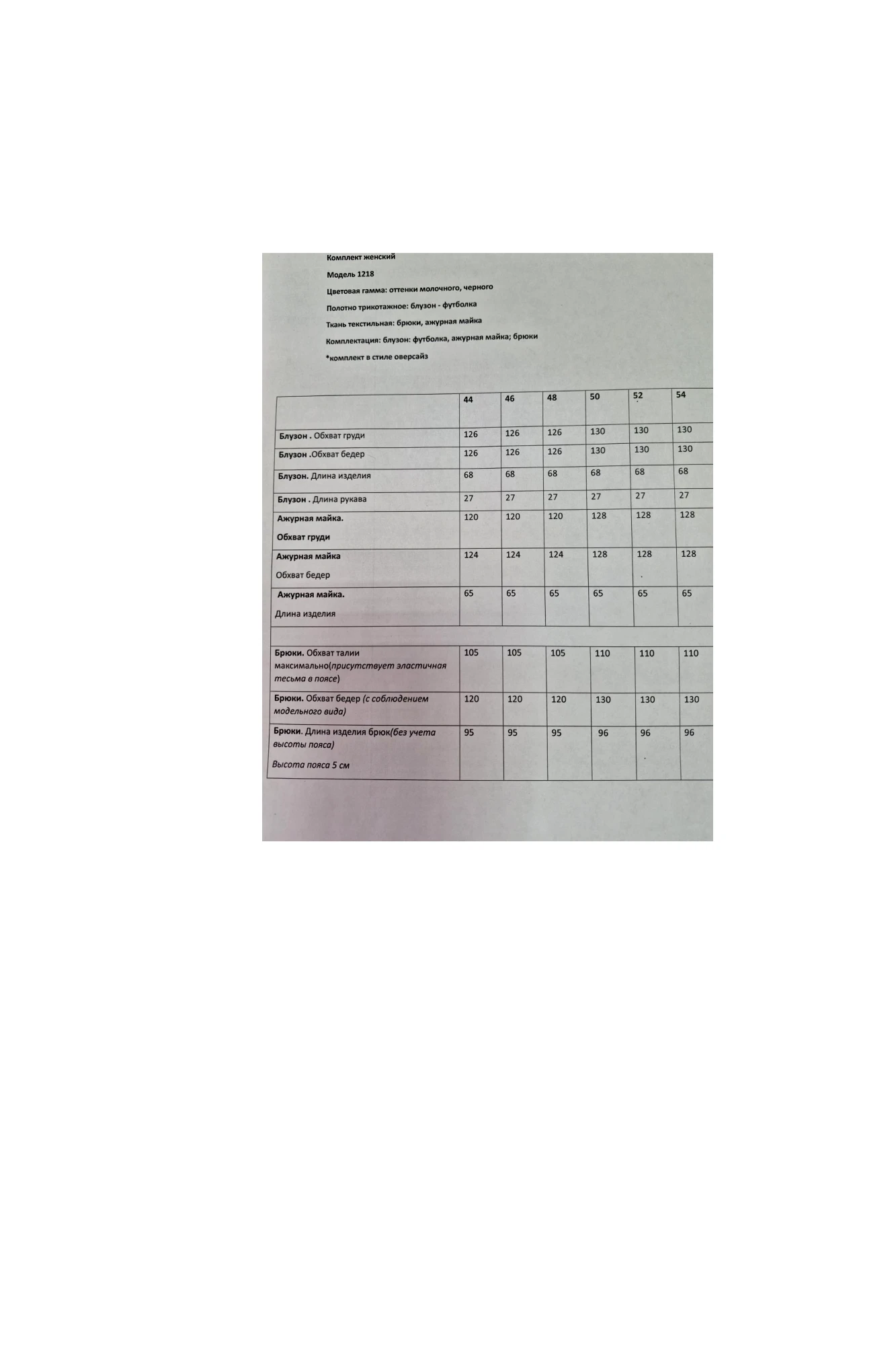 Стильный комплект-тройка: блузон, состоящий из тандема: футболка +майка в стиле оверсайз и свободных брюк-бананов, зауженных к низу. Блузон свободного силуэта, состоящий из футболки со спущенной линией проймы и укороченным втачным рукавом, длиной 26 см. Горловина округлая, оформлена планкой 2,5 см. Длина блузона по спинке 68 см. Низ изделия и рукавов обработаны открытым срезом с проложенной строчкой и ажурной майкой на бретелях. Срезы майки обработаны окантовочной тесьмой 0,7 см. Длина ажурной майки 65 см. Брюки современного свободного силуэта с заужением к низу, в стиле «бананы». Карманы-хулиганы расположены в боковых швах. Спереди на линии талии расположены неглубокие модельные складки. В боковых швах вставлены по всей длине вертикальные планки-лампасы, шириной 4 см. Пояс притачной, с эластичной тесьмой внутри и Дополнительным шнуром для изменения объема талии. Высота пояса 5,5 см. Оканчиваются брюки легкой сборкой и притачным манжетом-отворотом. Длина брюк по боковому шву с отворотом и высотой пояса 100 см. Особые рекомендации: рекомендуется холодная деликатная ручная стирка, без использования отбеливающих СМС, без интенсивного трения. Сушка в вертикальном положении. ВТО с минимальным паром.