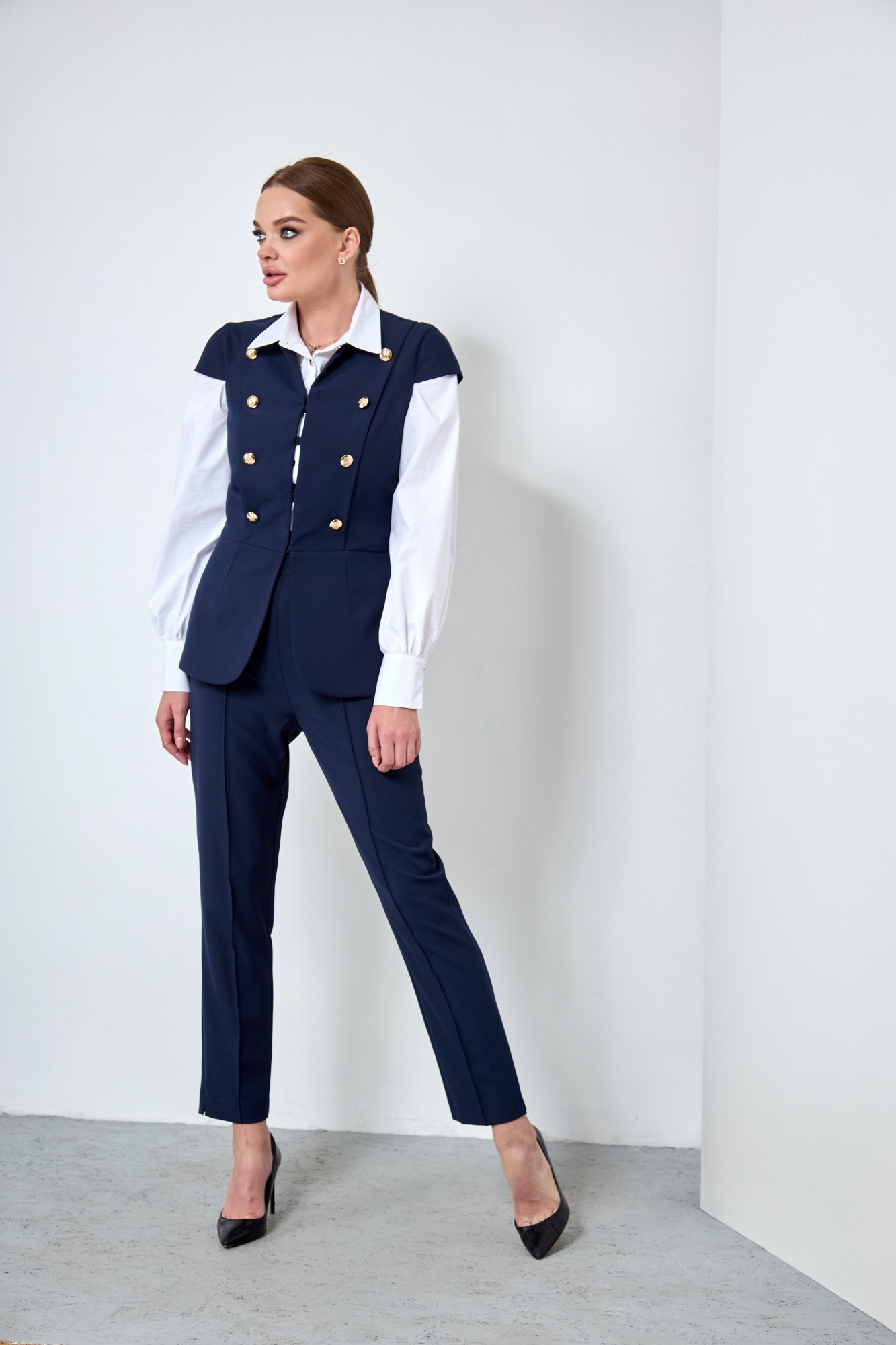 Дизайнерский комплект состоит из рельефного прилегающего жилета на подкладе с изящными эполетными плечами(длина8.5 см) и отрезной фигурной баской по переду талии изделия(длина 23.5 см). Передняя часть изделия имеет центральные отлетные рельефные детали, на которых расположены вертикально декоративные пуговицы. Застежка фиксируется по центру на крючках «в стык». Спинка состоит из прямой кокетки и рельефных вертикальных деталей-бочков. На линии талии спинки расположен горизонтально фигурный хлястик, который закреплен по краям декоративными пуговицами. Горловина жилета дополнена стойкой. шириной 4 см. Длина жилета по среднему шву спинки 66 см.