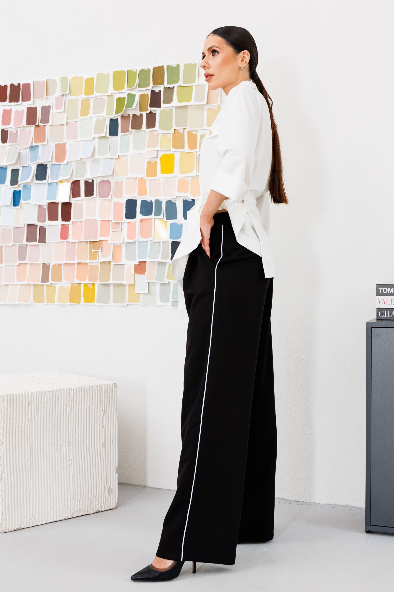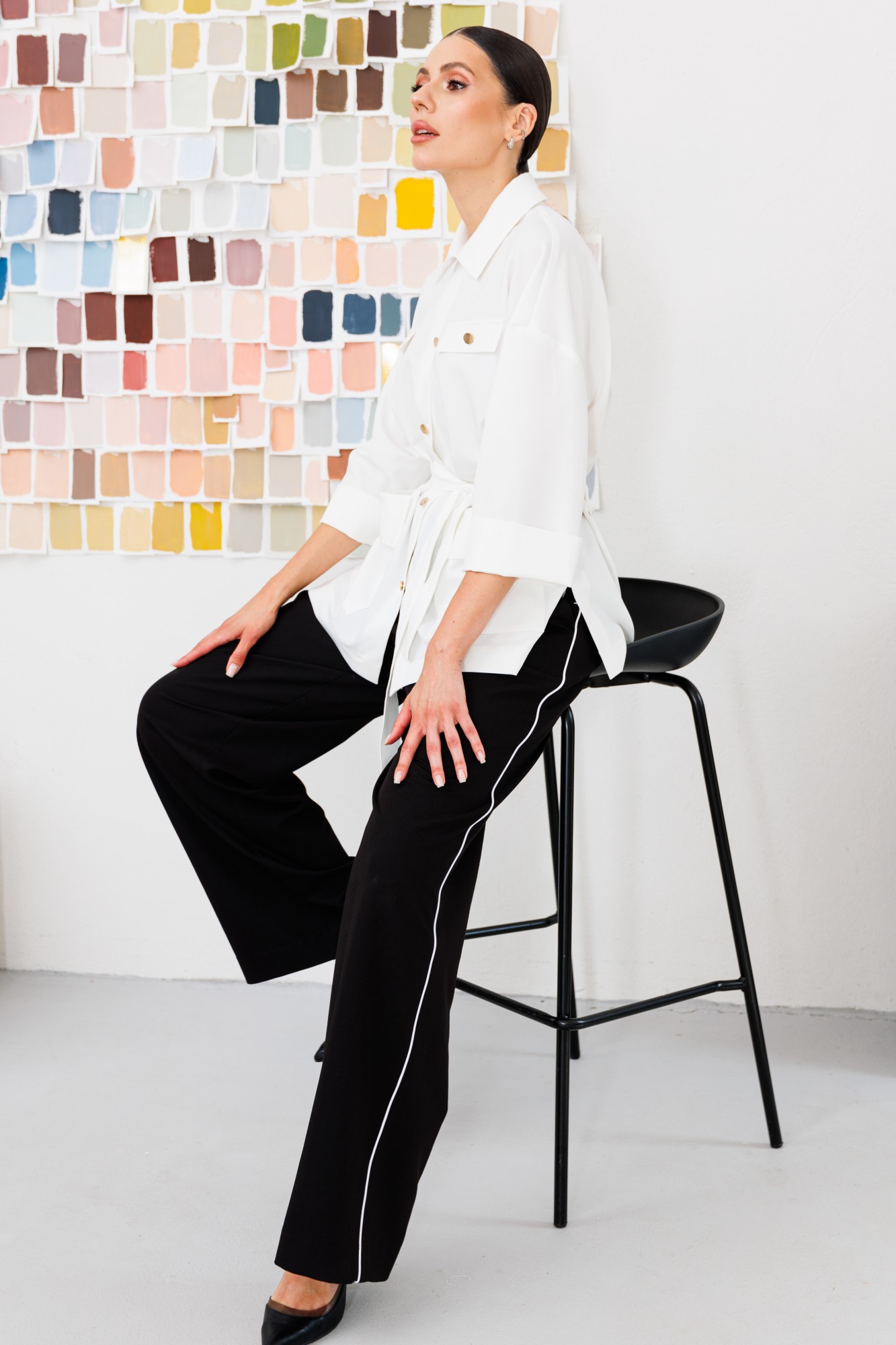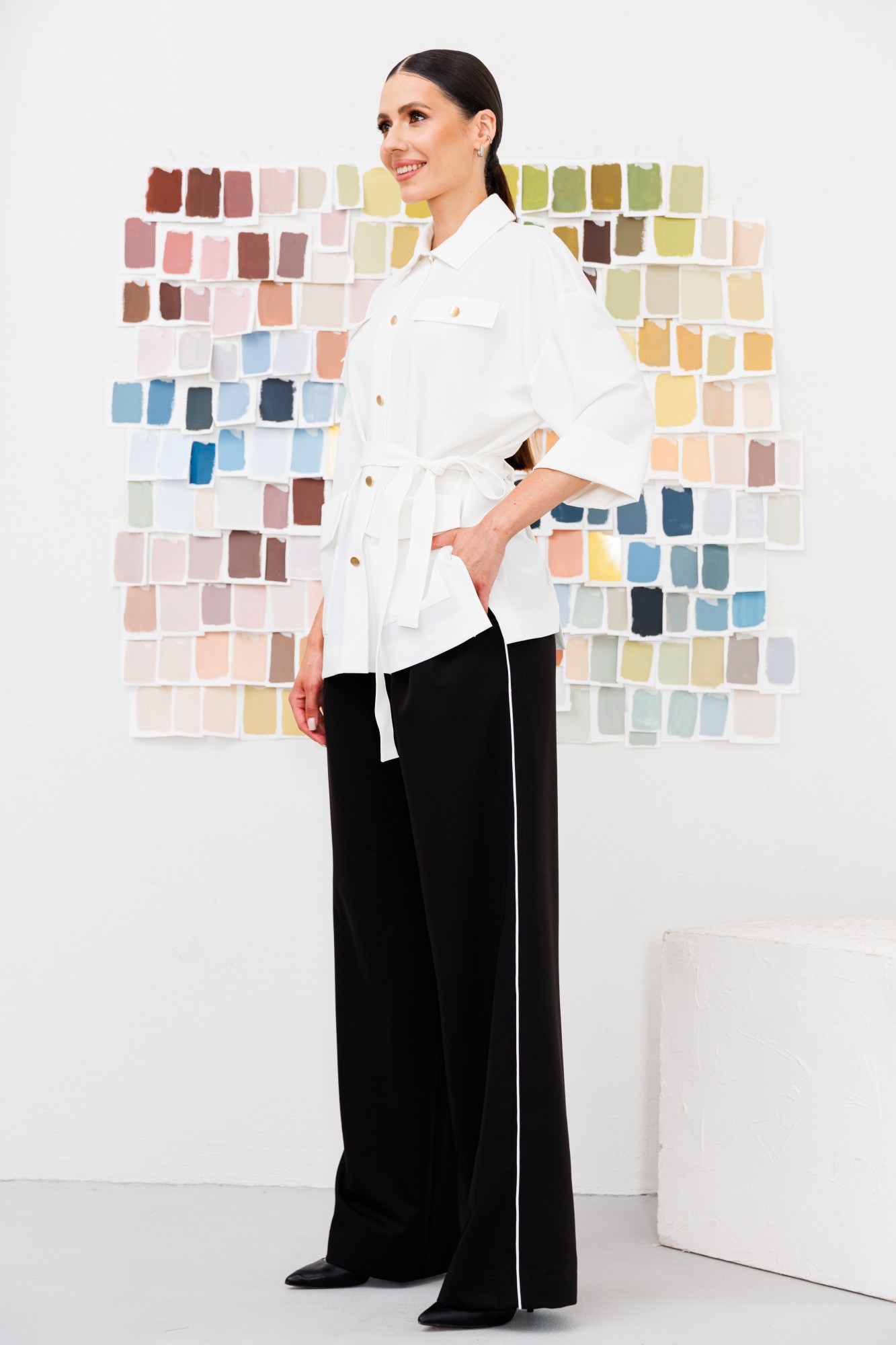 Стильный современный комплект, состоящий из блузона и брюк в стиле палаццо. Блузон прямого свободного силуэта со спущенной линией плеча и одношовным рукавом с отворотом. Спинка имеет центральный средний шов и притачные детали баски на уровне линии талии, которые заходят друг на друга, образуя шлицы. Горизонтально расположена на линии талии надстрочная деталь (шлевочная), длиной 23 см и высотой 5,5 см для съемного текстильного пояса, который может фиксировать линию талии на мягкий узел. Спереди полочки расположены горизонтально накладные верхние клапаны, которые фиксируются пуговицами и нижние накладные прямоугольные функциональные карманы с отлетными фигурными отворотами. Воротник рубашечного кроя с полустойкой. Центральная часть изделия обработана подбортами и застежкой на петли/пуговицы. В боковых швах изделия расположены открытые разрезы, высотой 16-18 см. Линия плеча спущена, рукав одношовный, с отворотом, длиной 3/4, при желании отворот опускается и длина рукава становится 7/8. Длина изделия по спинке 69-73 см (в зависимости от размерного ряда). Брюки комплекта созданы в свободном стиле палаццо. В пояс брюк по спинке вставлена эластичная тесьма, шириной 3 см. Спереди пояс фиксируется горизонтально на петли/пуговицы и вертикальную закрытую клапан-молнию (гульфик). При желании в пояс можно вставить ремень, так как имеются шлевочные детали. В боковых швах: карманы с наклонным входом, на поясной линии талии расположены две неглубокие складки для свободы движения. Декоративным акцентом брюк является контрастный кант, вставленный в боковые швы. Длина изделия по боковому шву 107 см. (фурнитура может отличаться от представленной на рекламном фотоматериале). Особые рекомендации: рекомендуется холодная деликатная ручная стирка, без использования отбеливающих СМС, без интенсивного трения. Сушка в вертикальном положении. ВТО с минимальным паром.