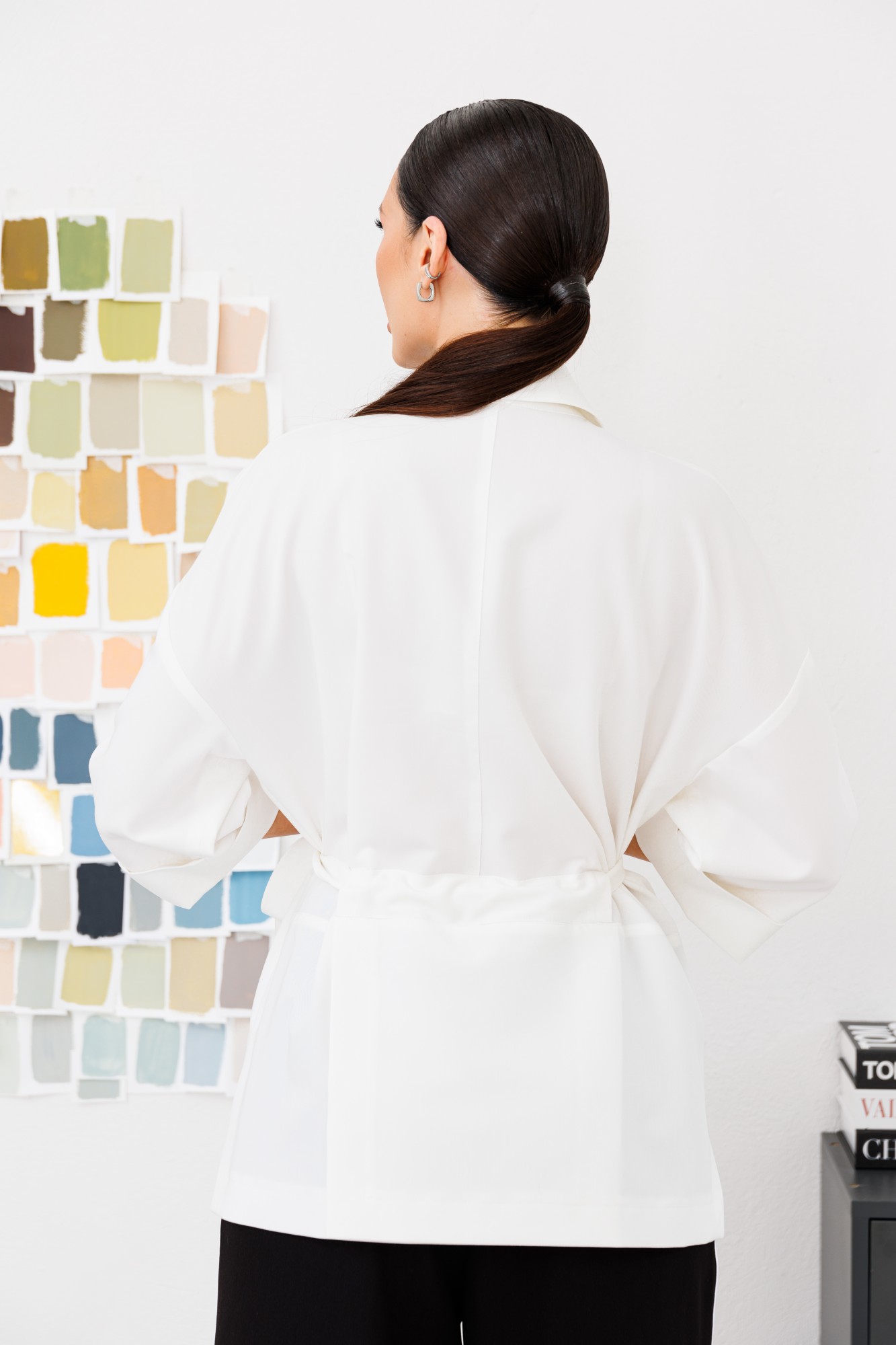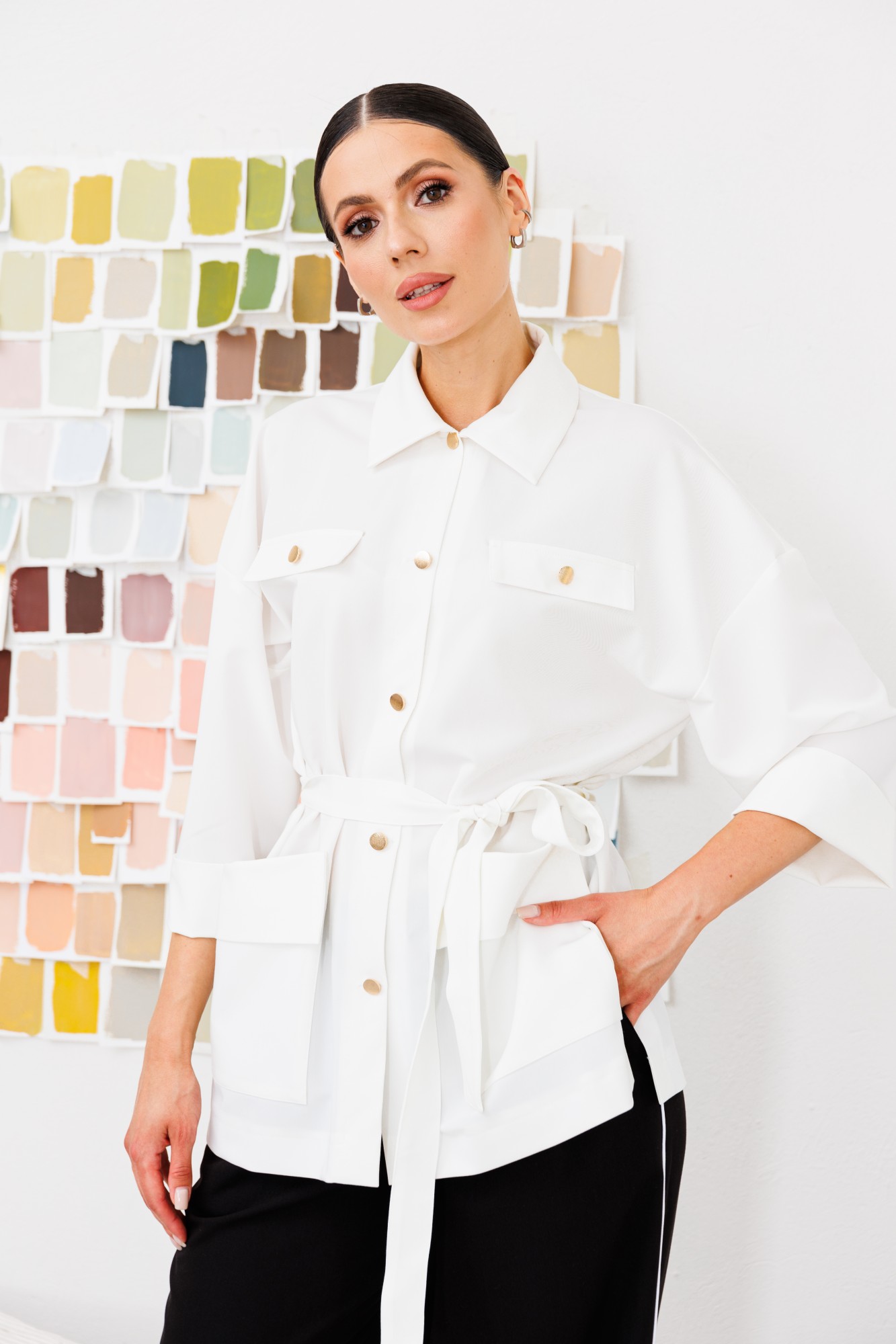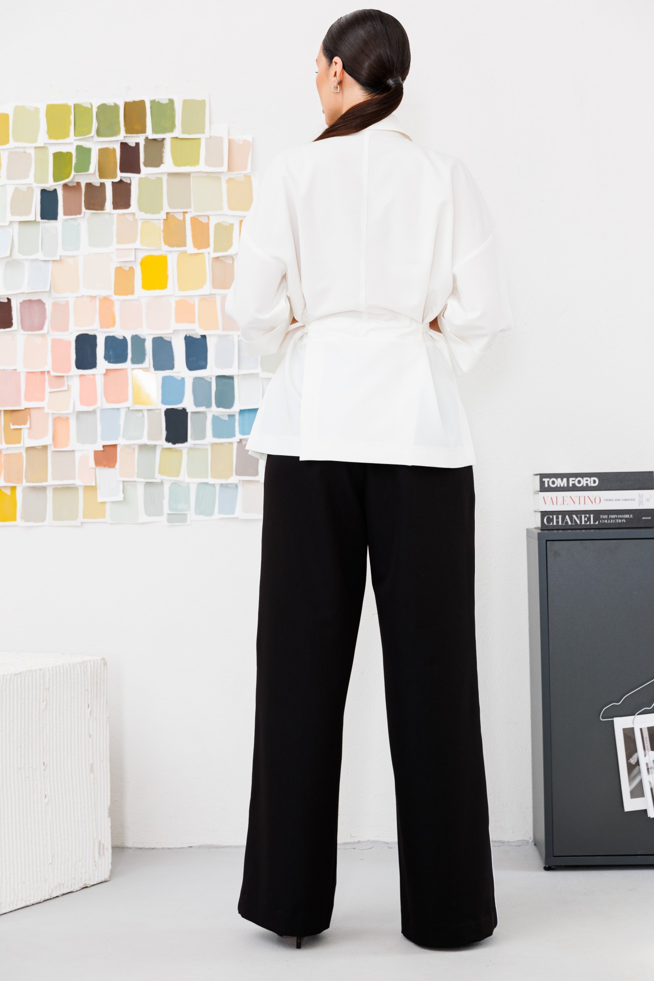 Стильный современный комплект, состоящий из блузона и брюк в стиле палаццо. Блузон прямого свободного силуэта со спущенной линией плеча и одношовным рукавом с отворотом. Спинка имеет центральный средний шов и притачные детали баски на уровне линии талии, которые заходят друг на друга, образуя шлицы. Горизонтально расположена на линии талии надстрочная деталь (шлевочная), длиной 23 см и высотой 5,5 см для съемного текстильного пояса, который может фиксировать линию талии на мягкий узел. Спереди полочки расположены горизонтально накладные верхние клапаны, которые фиксируются пуговицами и нижние накладные прямоугольные функциональные карманы с отлетными фигурными отворотами. Воротник рубашечного кроя с полустойкой. Центральная часть изделия обработана подбортами и застежкой на петли/пуговицы. В боковых швах изделия расположены открытые разрезы, высотой 16-18 см. Линия плеча спущена, рукав одношовный, с отворотом, длиной 3/4, при желании отворот опускается и длина рукава становится 7/8. Длина изделия по спинке 69-73 см (в зависимости от размерного ряда). Брюки комплекта созданы в свободном стиле палаццо. В пояс брюк по спинке вставлена эластичная тесьма, шириной 3 см. Спереди пояс фиксируется горизонтально на петли/пуговицы и вертикальную закрытую клапан-молнию (гульфик). При желании в пояс можно вставить ремень, так как имеются шлевочные детали. В боковых швах: карманы с наклонным входом, на поясной линии талии расположены две неглубокие складки для свободы движения. Декоративным акцентом брюк является контрастный кант, вставленный в боковые швы. Длина изделия по боковому шву 107 см. (фурнитура может отличаться от представленной на рекламном фотоматериале). Особые рекомендации: рекомендуется холодная деликатная ручная стирка, без использования отбеливающих СМС, без интенсивного трения. Сушка в вертикальном положении. ВТО с минимальным паром.