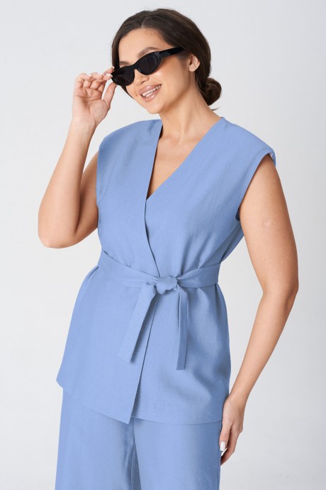Комплект состоящий из жилета и укороченных брюк (кюлоты) Жилет на подкладке, прямого силуэта с увеличенной плечевой накладкой. Застежка двубортная на 2 петли и пуговицы. В комплект входит мягкий пояс из основной ткани. Брюки прямого покроя на прямом поясе с резинкой по спинке. Застежка на тесьму-молнию и пуговицу. По передним половинкам брюк функциональные карманы.