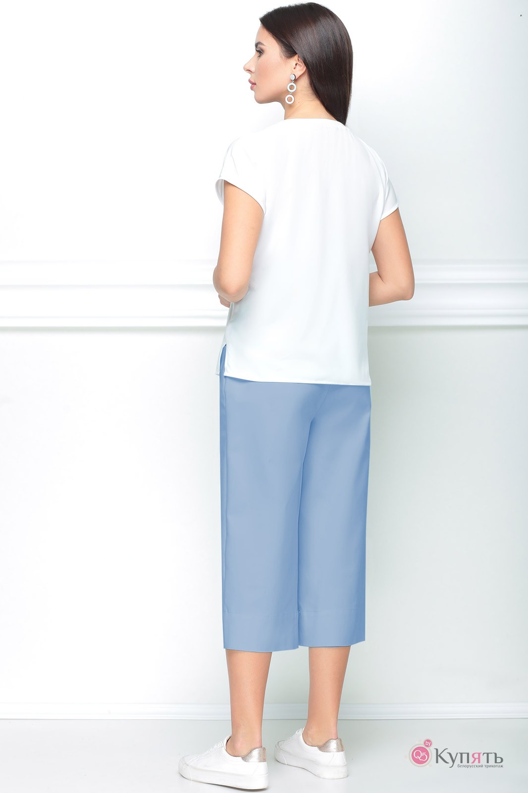 Комплект женский состоящий из блузки и кюлот. Блузка свободного силуэта из струящейся ткани с круглым вырезом горловины с притачной планкой, рукав спущенный короткий. По бокам имеются разрезы. По переду декоративный принт (сублимация). Кюлоты из хлопковой ткани расширенные к низу на притачном поясе со шлевками. По переду функциональные карманы и складка. Застежка по переду на тесьму-молнию и пуговицу.