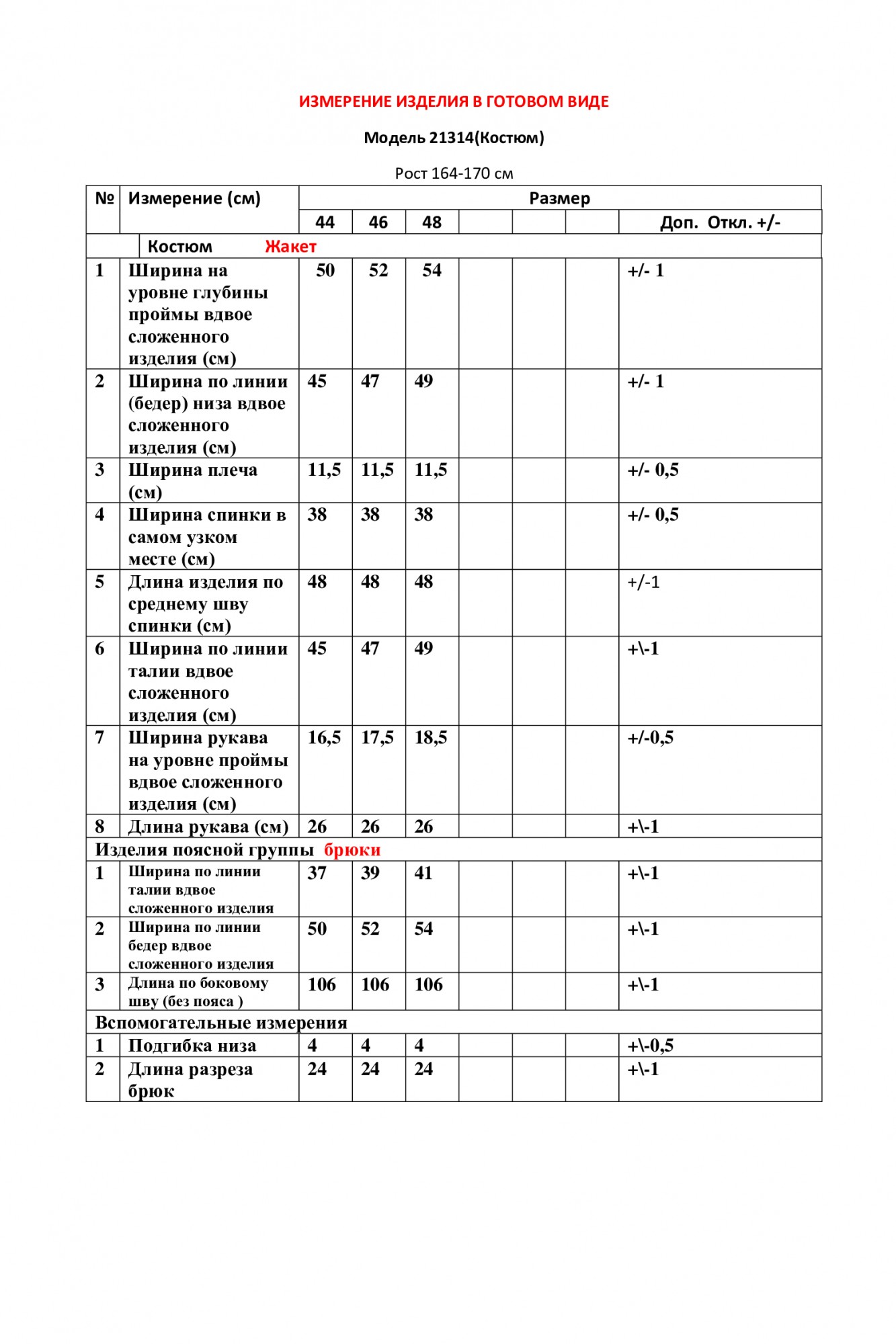 Таблица размеров