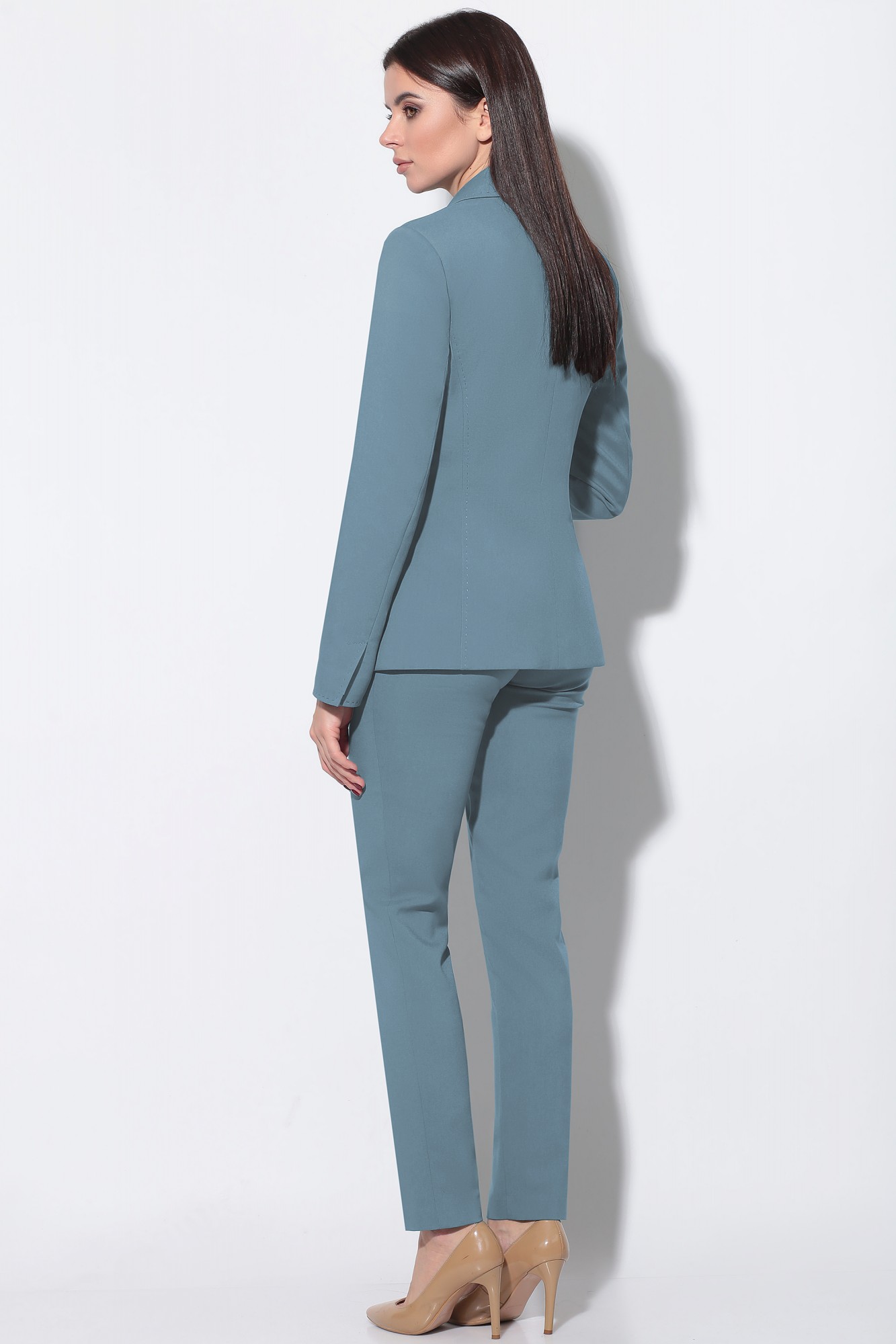 Комплект женский, состоящий из жакета, блузы и брюк. Жакет полуприлегающего силуэта на подкладке. По переду декоративные вытачки, рельефы и функциональные прорезные карманы с клапаном. Воротник пиджачного типа с застежкой на 1 обтяжную пуговицу в размерах 44-48. В размерах 50-54 жакет застегивается на 2 пуговицы. Рукав длинный, втачной. Все швы декорированы отделочной строчкой-имитацией ручного стежка. Блуза женская полуприлегающего силуэта со сборкой по горловине и V-образным вырезом. Рукав короткий втачной. По горловине декоративная планка переходящая в завязку-бант. Брюки чуть заужены к низу, с функциональными карманами по переду. На притачном поясе имеется также отделочная строчка-имитация ручного стежка. Брюки застегиваются на петлю и обтяжную пуговицу.