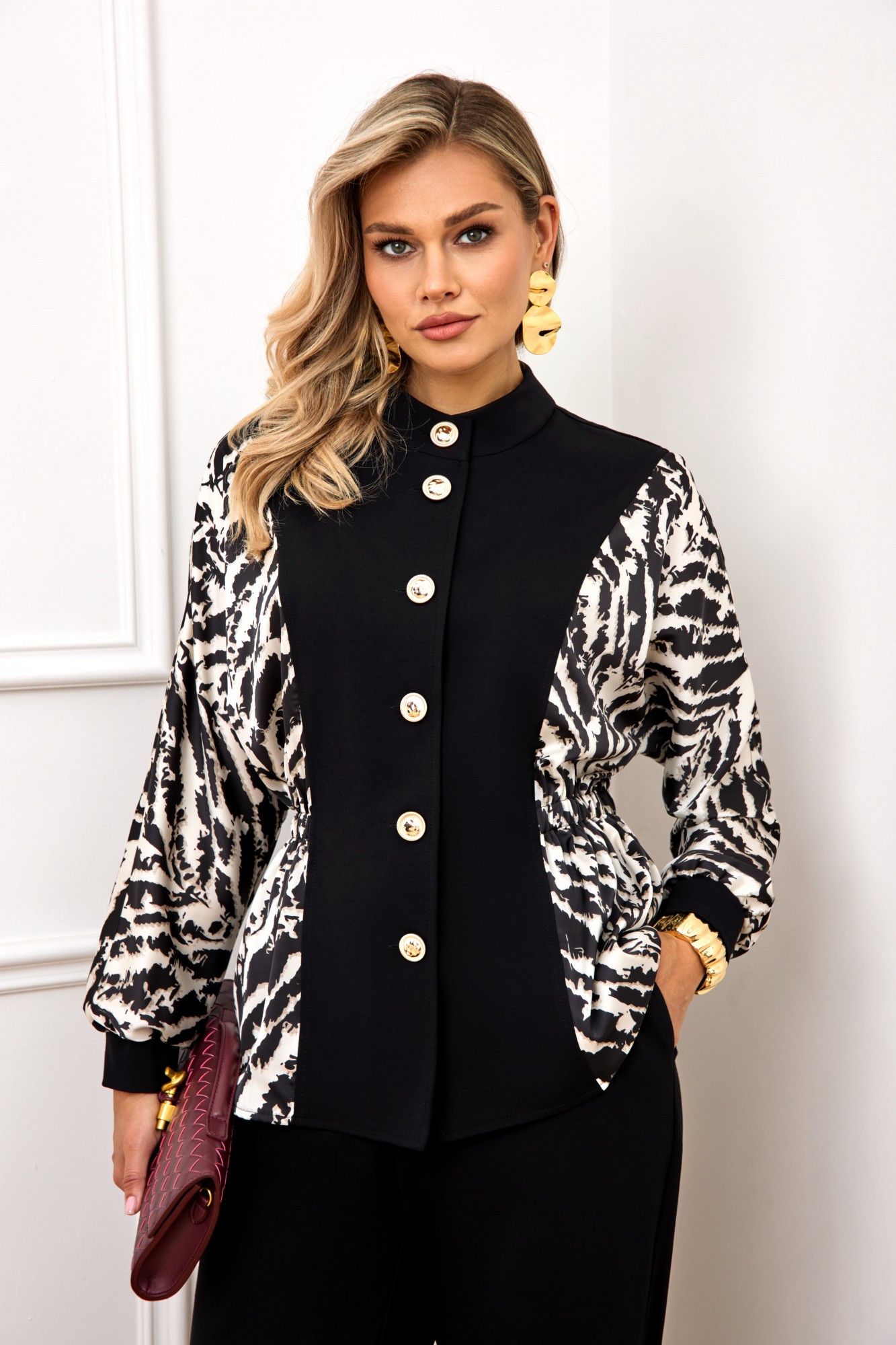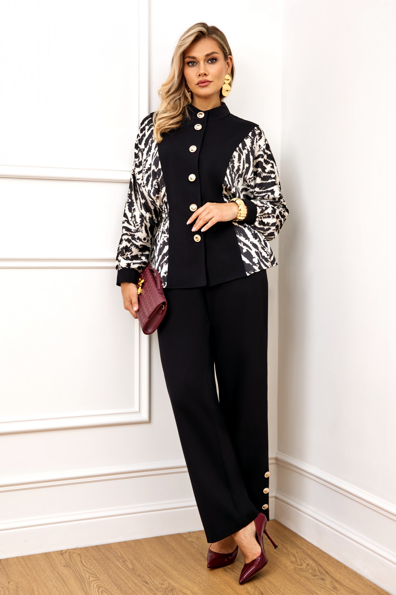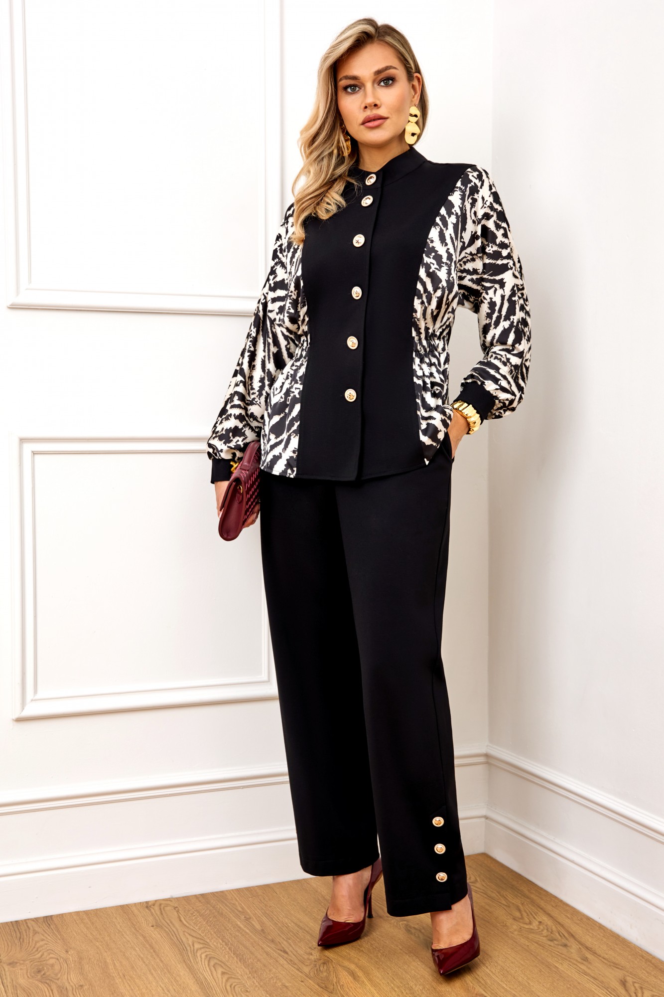 Стильный комплект, состоит из блузы и брюк. Блуза полуприлегающего силуэта, выполнена из высококачественной трикотажной ткани, рукав и бочек выполнены из атласной ткани с модным дизайнерским принтом. Блуза с горловиной стойкой и застёжкой по переду на пуговицы. Рукав полной длины, выполнен в стиле летучая мышь, с манжетой из однотонного трикотажа. На талии по бокам блуза с резинкой. Все элементы блузы создают неповторимый образ, модель невероятно стройнит. Брюки выполнены из высококачественного трикотажа, на поясе, по спинке на резинке, по переду с застежкой на пуговицу и молнию. В боковых швах брюк функциональные карманы. По бокам брюк снизу шлица, декорированная пришивными пуговицами.