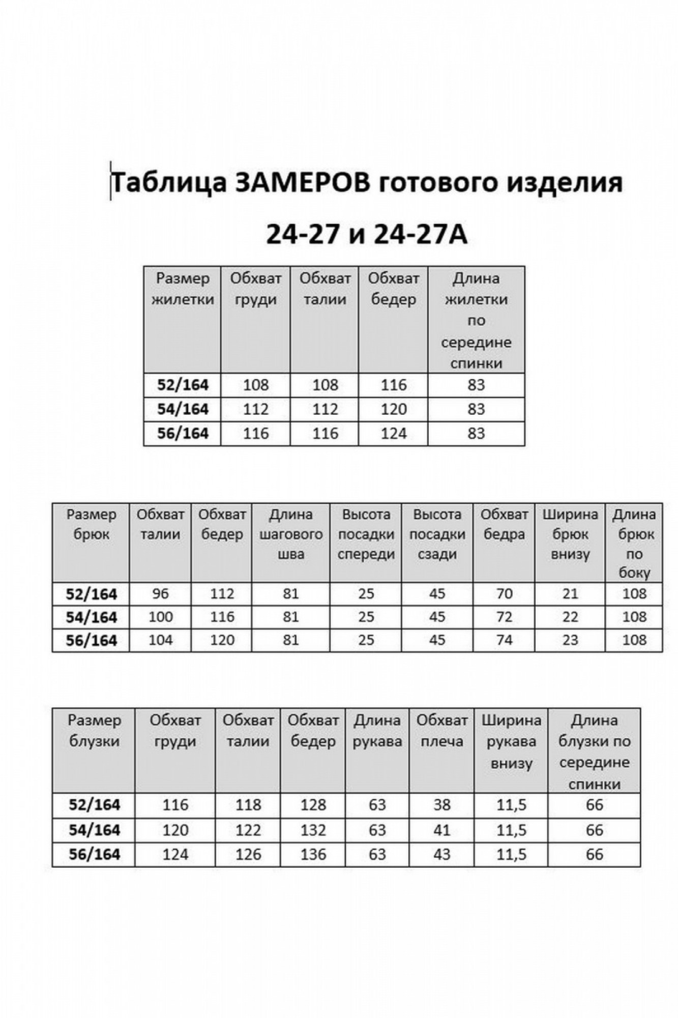 Длина жилетки 83 см, длина блузки 65 см, длина рукава 64 см, длина брюк 107 см.