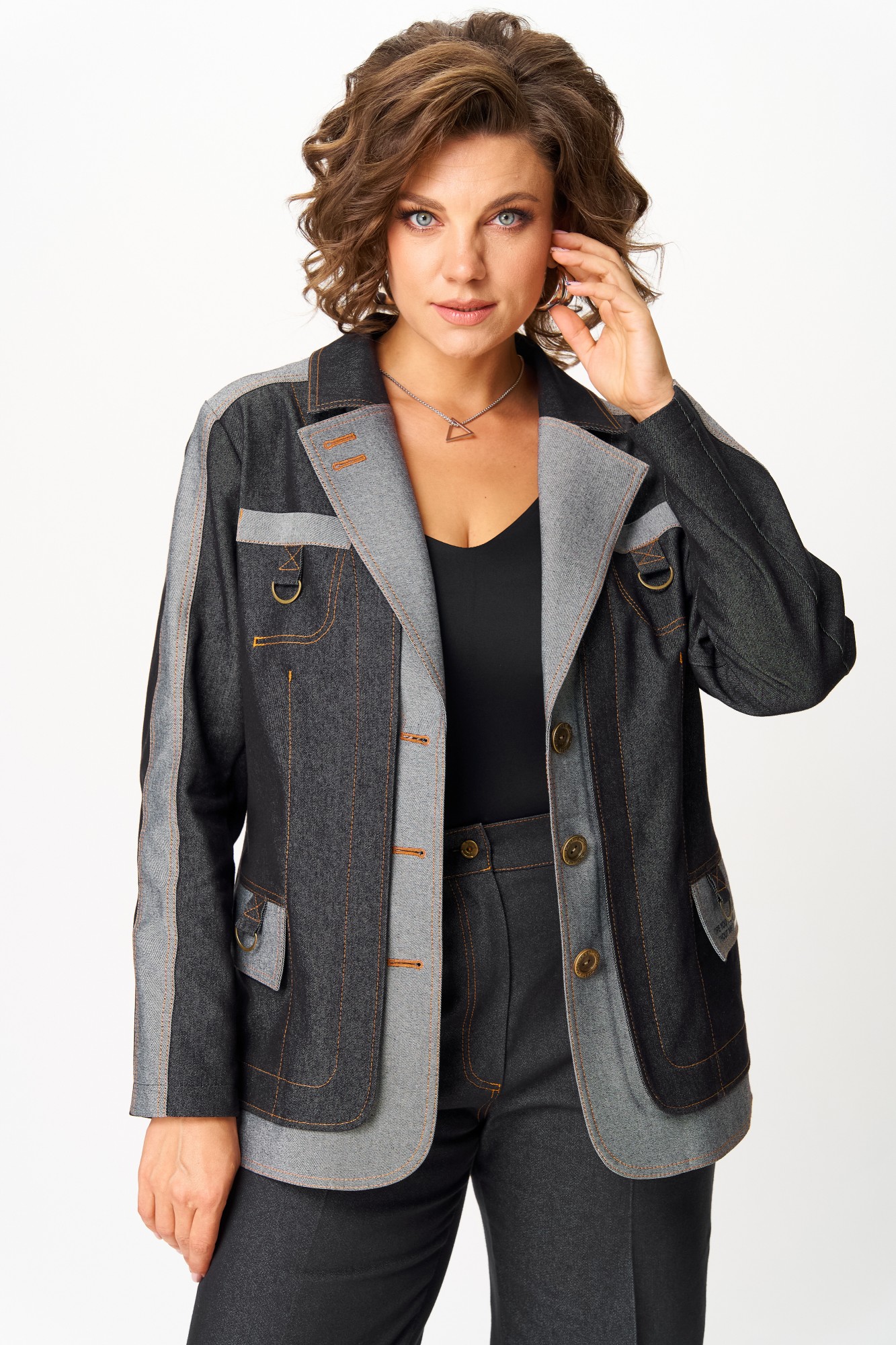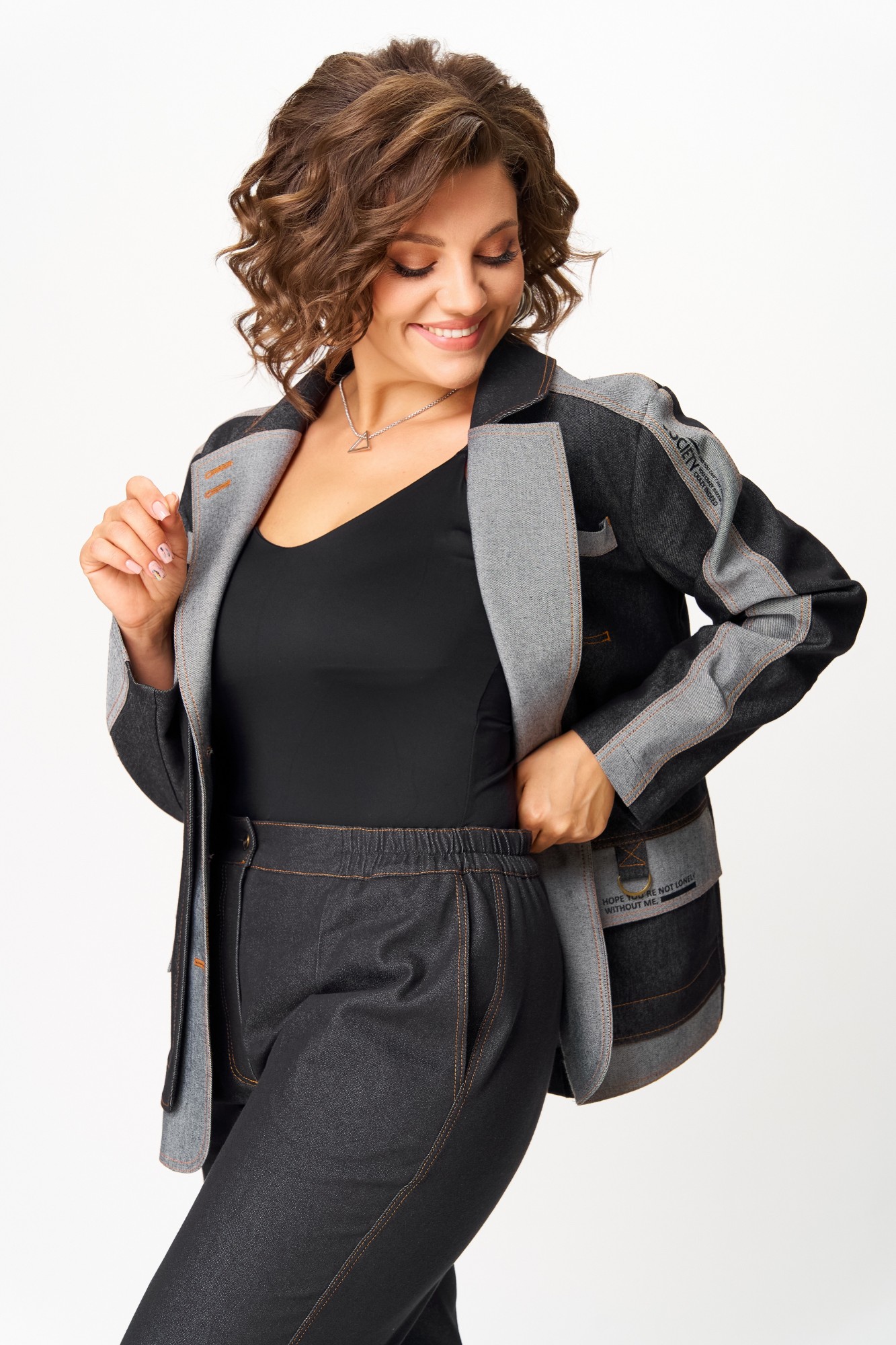 Этот стильный женский костюм из двух предметов сочетает современный дизайн с элементами уличной моды. Комплект включает приталенный жакет и умерено широкие брюки, выполненные из джинса, что придает образу уникальный и уверенный характер.