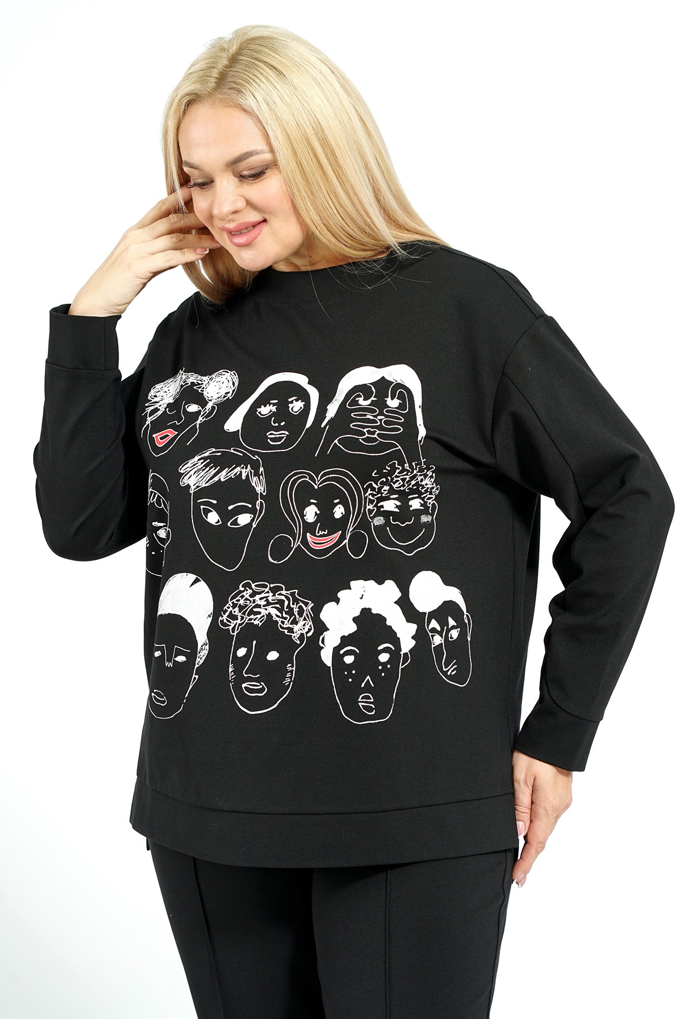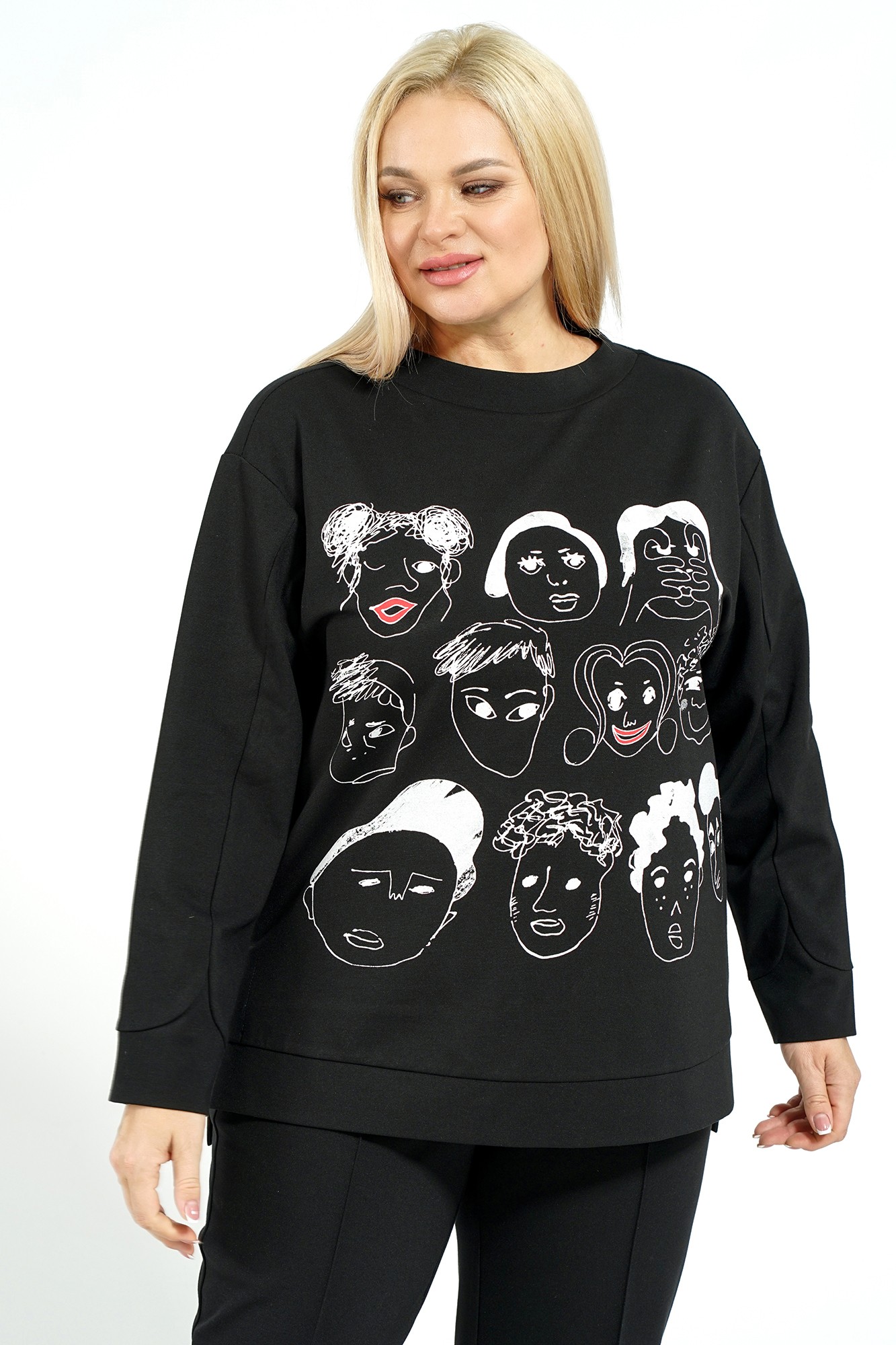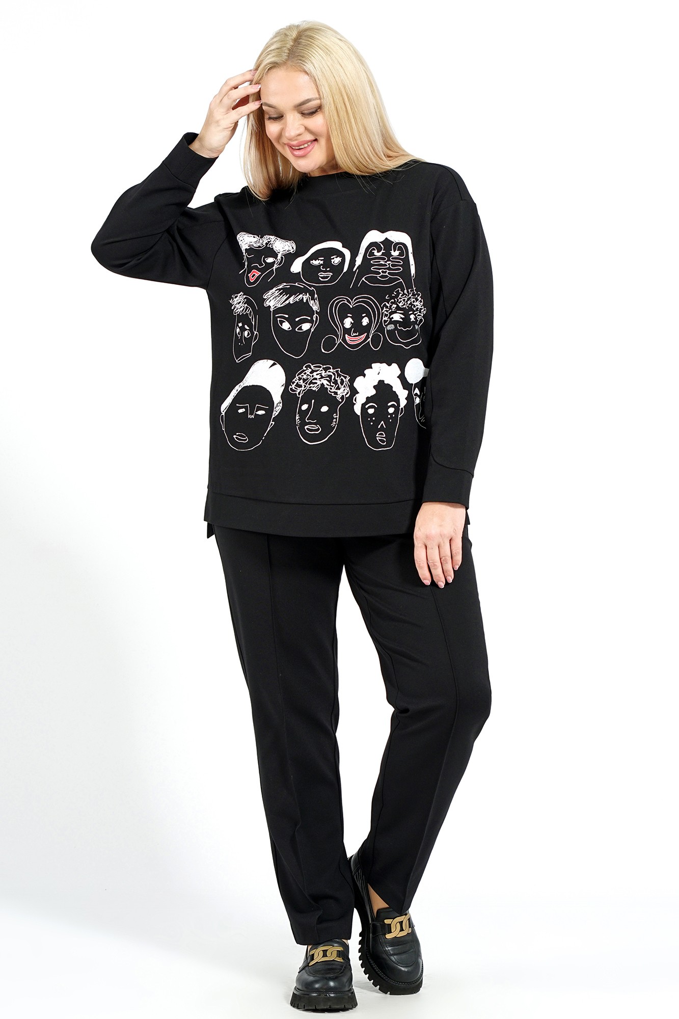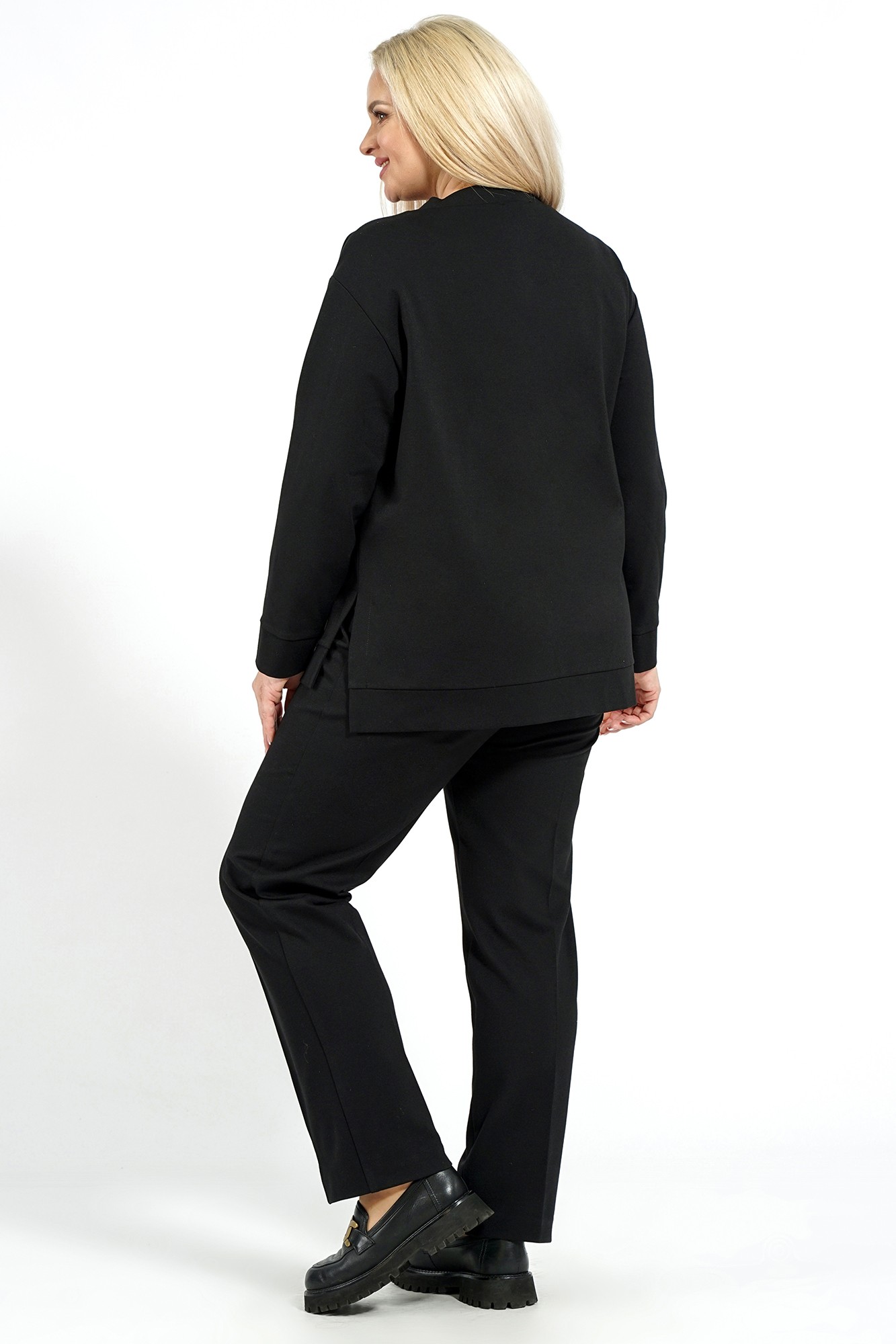Блузон женский прямого, свободного силуэта, понизу с притачным поясом и разрезами по боковым, со спученной линией плеча. С втачными, длинными рукавами, понизу с фигурной линией и с притачными манжетами. Горловина формы лодочка с втачной стойкой. Брюки женские свободного, прямого силуэта с притачным поясом на резинке и имитация застёжки по среднему шву типа «гульфик». Передние части отстрочены в край.
