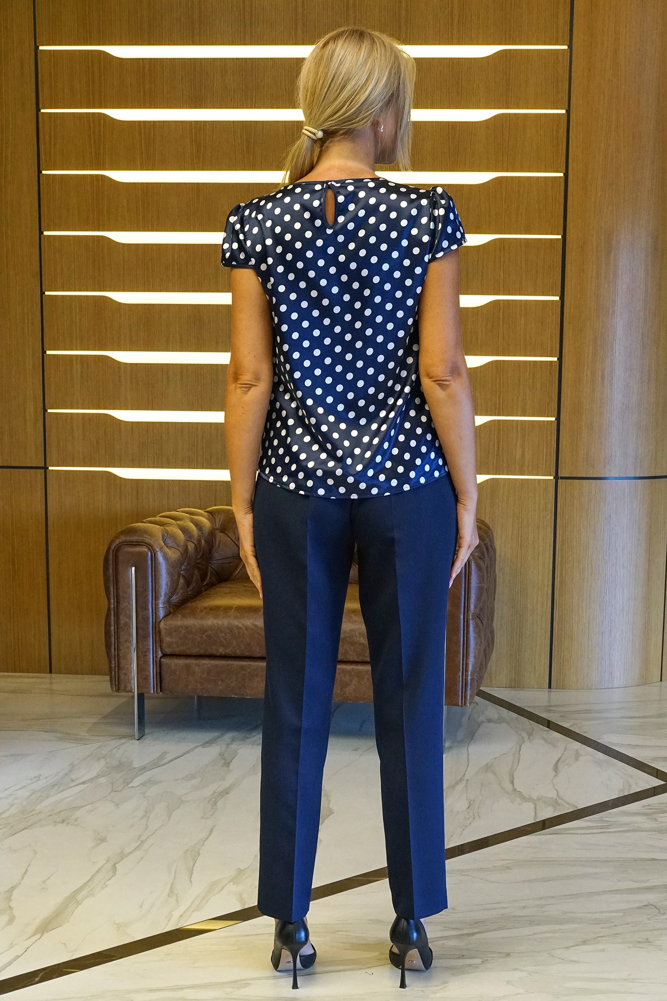 Блуза женскаяР46-50 полуприлегающего силуэта, с разрезом виде капельки по центру горловины спинки с застёжкой на навесную петлю и пуговицу, низ фигурной формы.Перед с нагрудными выточками. Рукава втачные, крылышко по окату со сборкой.
