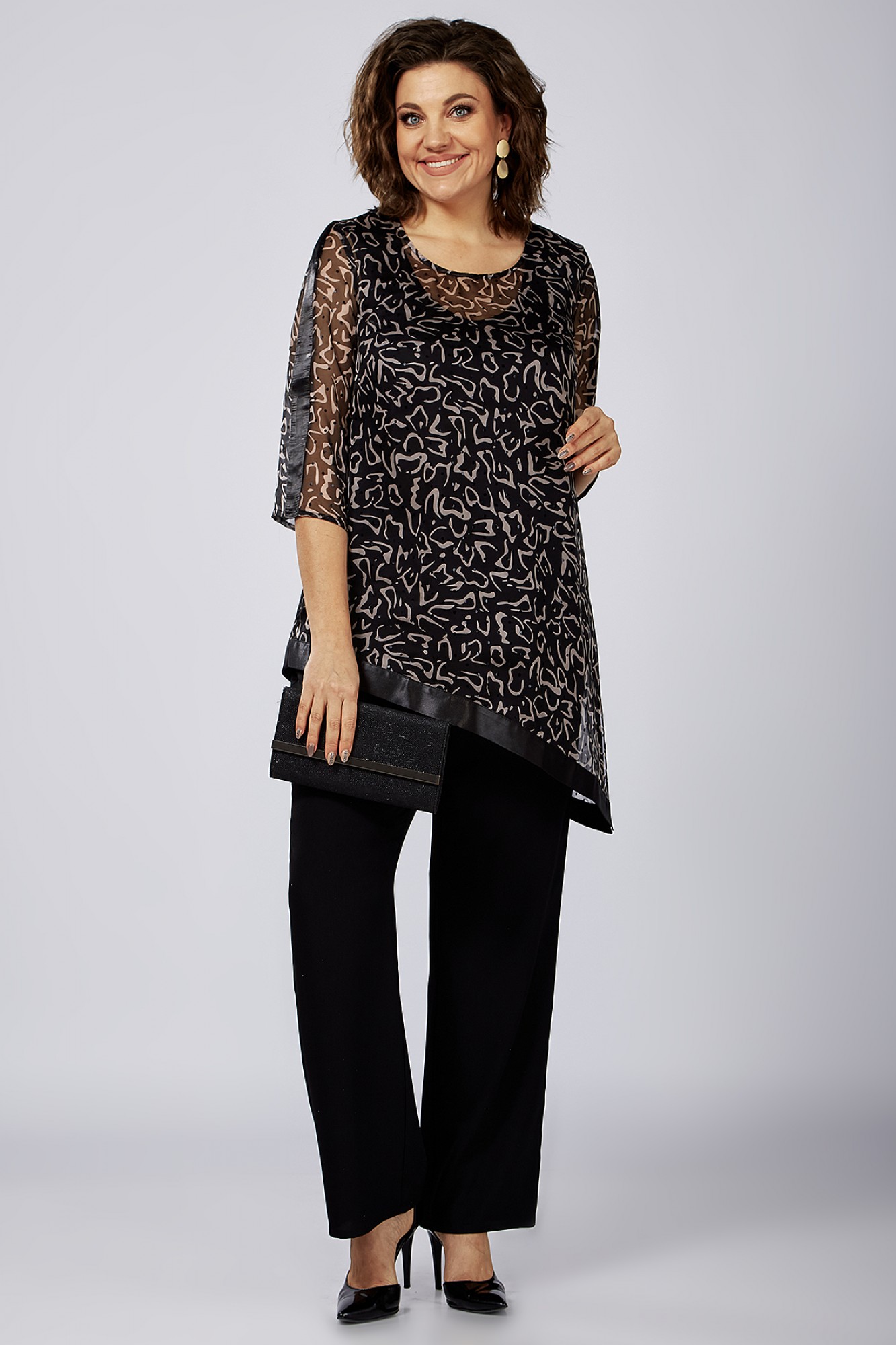 Мягкий, красивый стильный и очень комфортный женский костюм большого размера, состоящий из блузы и брюк прямого силуэта. Брюки выполнены из костюмно-плательной ткани, пояс на резинке. Блуза выполнена из шифона на трикотажной подкладке. Блуза сложного геометрического кроя с удлиненным боковым швом и разрезом. Низ изделия обработан отделочной тканью. Рукава длиной чуть ниже локтя. Необычное дизайнерское решение на стыке безупречной женственности и стиля с динамикой и новаторством подчеркнет изысканный вкус обладательницы, не лишив комфорта и функциональности. Подойдет как офисная одежда, вечерний наряд, а также как праздничный или для вечернего выхода. В больших размерах легкий оверсайз.