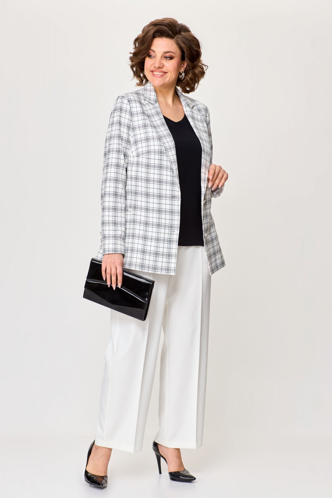 Представьте себе величественную даму, идущую с изяществом и уверенностью, восхищающую всех своим непринужденным стилем. Её образ – это искусное сплетение элегантности и современной роскоши. На ней – женский брючный костюм, созданный для того, чтобы притягивать восхищенные взгляды. Пиджак, в котором она словно воплощает элегантность и власть, олицетворяет роскошь и стиль. Он выглядит как произведение искусства: однобортный, с центральной застёжкой на две изысканные пуговицы, создающие ощущение истинного роскошного шика. Отложной воротник с лацканом придает образу особый шарм и респектабельность. Спинка и перед пиджака украшены изысканными рельефами, которые подчеркивают женственные линии фигуры. Прорезные карманы в листочку дополняют его стиль и функциональность, а подкладка добавляет ощущение роскоши и комфорта. Брюки, с другой стороны, придают образу современную строгость и изысканность. Прямой покрой создает идеальные линии, подчеркивая изящную фигуру. Они выполнены из однотонной ткани, которая великолепно гармонирует с клетчатым пиджаком. Брюки с боковыми карманами добавляют удобство и практичность, а пояс на резинке обеспечивает комфорт. Этот брючный костюм – это не просто одежда, это произведение искусства, которое подчеркивает индивидуальность и утонченный вкус своей обладательницы. Он создан для того, чтобы притягивать восхищенные взгляды и оставаться в памяти как воплощение элегантности и стиля.