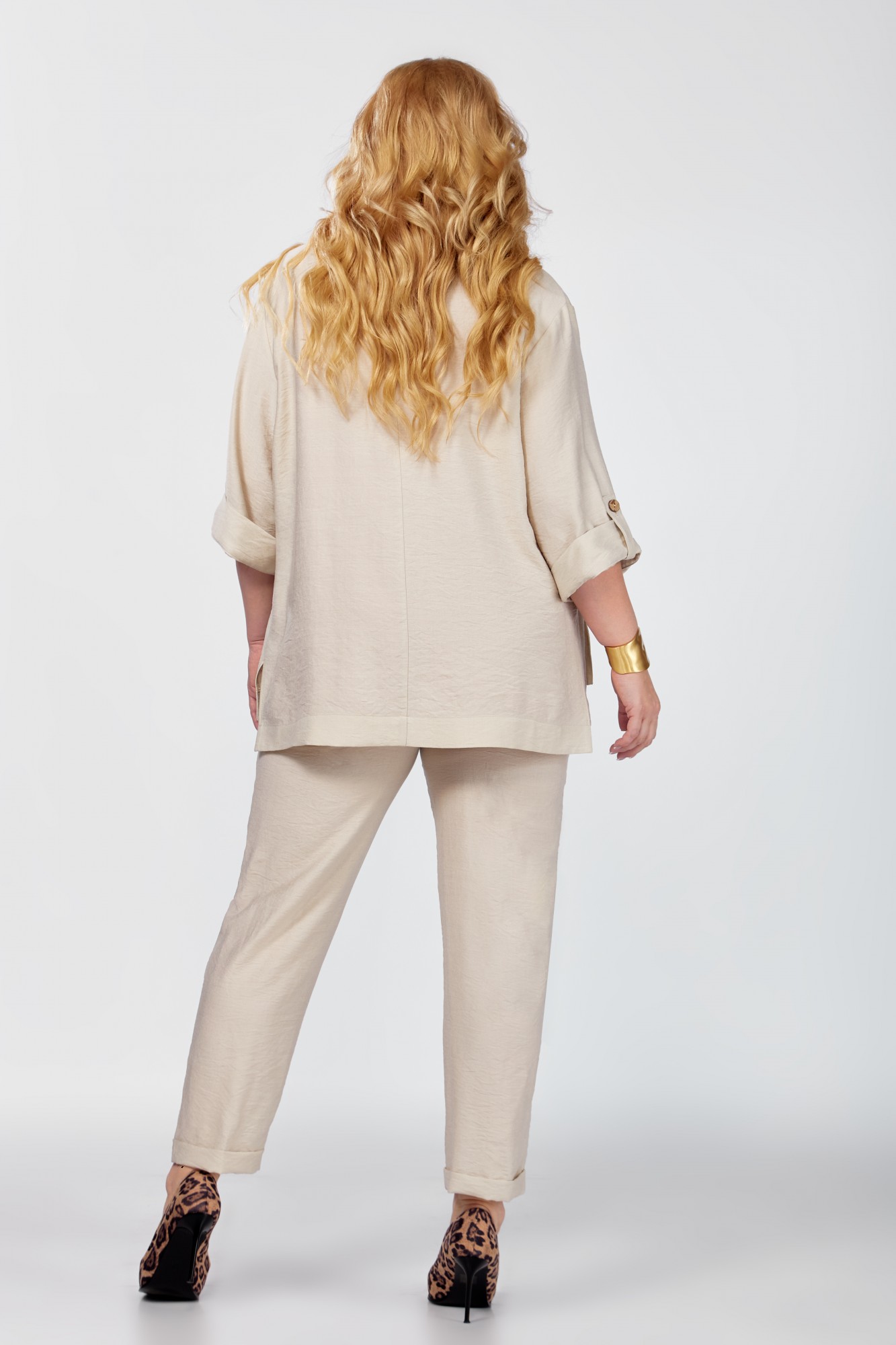 Стильный женский комплект-тройка ALGRANDA: рубашка-жакет с брюками и созвучной майкой – это стильное и комфортное решение для женщин больших размеров, идеальный выбор для тех, кто ценит комфорт и стиль. Модель выполнена из ткани из натурального волокна - хлопка с добавлением полиэстера и эластана, что позволяет чувствовать прохладу в жару, она прекрасно сидит на фигуре, обеспечивая свободу движений и приятные тактильные ощущения. Жакет свободного прямого кроя со спущенными рукавами, застегивается на 5 пуговиц и дополнен двумя накладными карманами, по боковым швам обработаны разрезы, низ жакета асимметричный. Блуза с рукавом «крылышко», горловина углубленная V-образной формы, на правом боковом шве есть декоративная нашивка. Брюки-бананы с отложными манжетами и боковыми карманами обеспечивают удобную посадку. Свободный крой комплекта позволяет носить его как в офисе, так и в повседневной жизни. Модель представлена в широком размерном ряде, что делает ее доступной для женщин с любыми параметрами. Это идеальный женский костюм как для прогулки, так и для похода в офис.