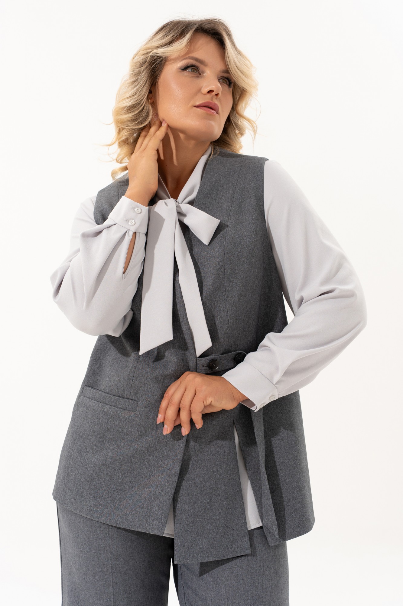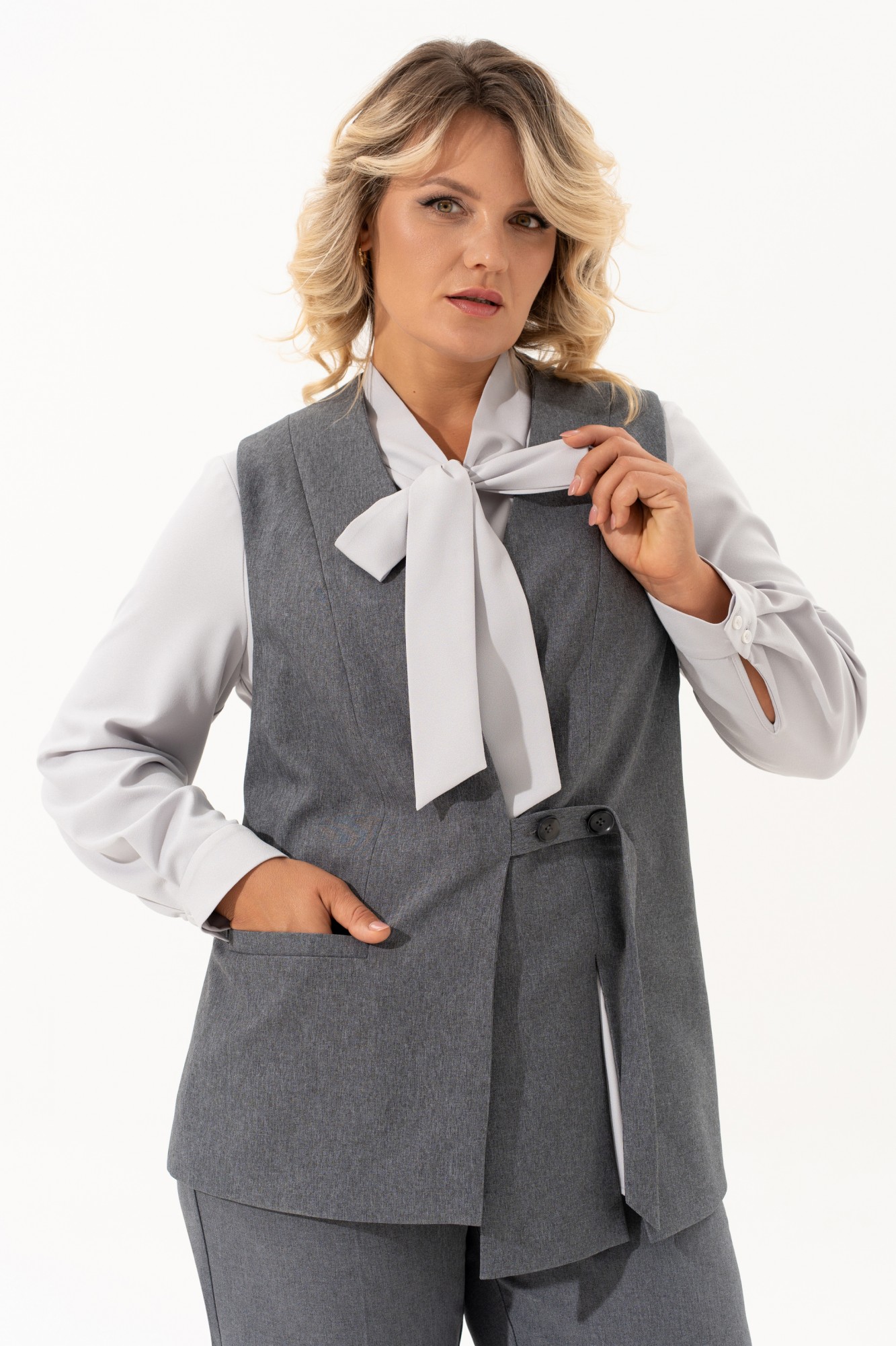 Костюм женский классический это идеальное решение для Вашего гардероба. Комплект состоит из двух предметов - прямые брюки с высокой посадкой прямого кроя на молнии и на резинке, с боковыми карманами сочетаются с любыми базовыми вещами. Универсальный классический жилет с V-образным вырезом горловины превосходно садится по фигуре, на правой полочке обработан прорезной карман с листочкой, на левой разрез , застежка обработана на отлетном хлястике ,на петлю и пуговицу. Этот элемент делает его более интересным. Жилет на подкладке . Ассиметричный жилет можно одевать поверх тонкой одежды. Базовый брючный костюм идеален для повседневного образа на работу в офис, школу, а при нарядной блузке комплект превращается в нарядный. Современный костюм также будет хорошо смотреться как вечерний наряд на различные мероприятия, праздники, день рождения, корпоратив. Шикарный нарядный станет незаменимым в Вашем гардеробе . Этот костюм подчеркнет Вашу уверенность и стиль.