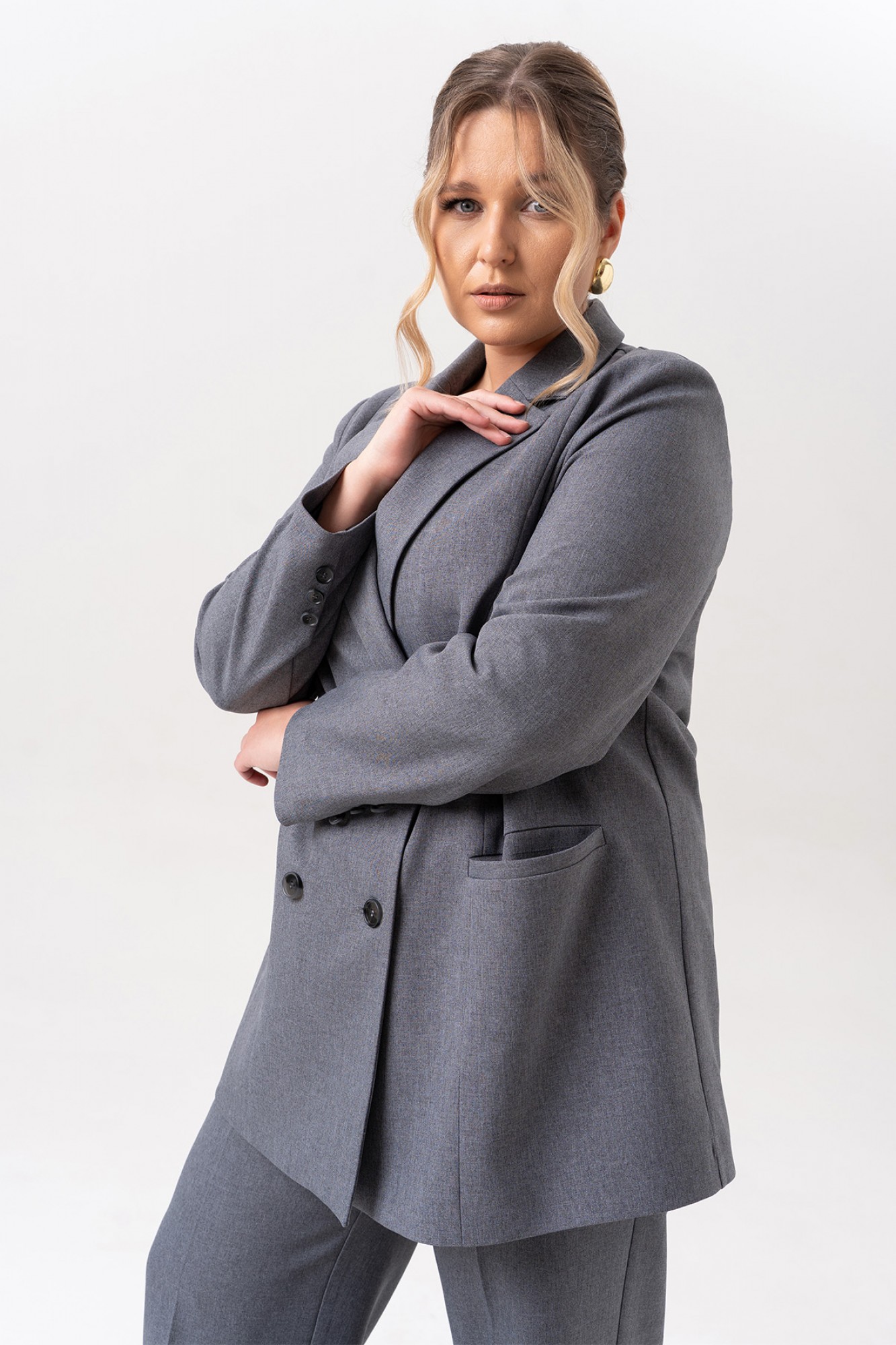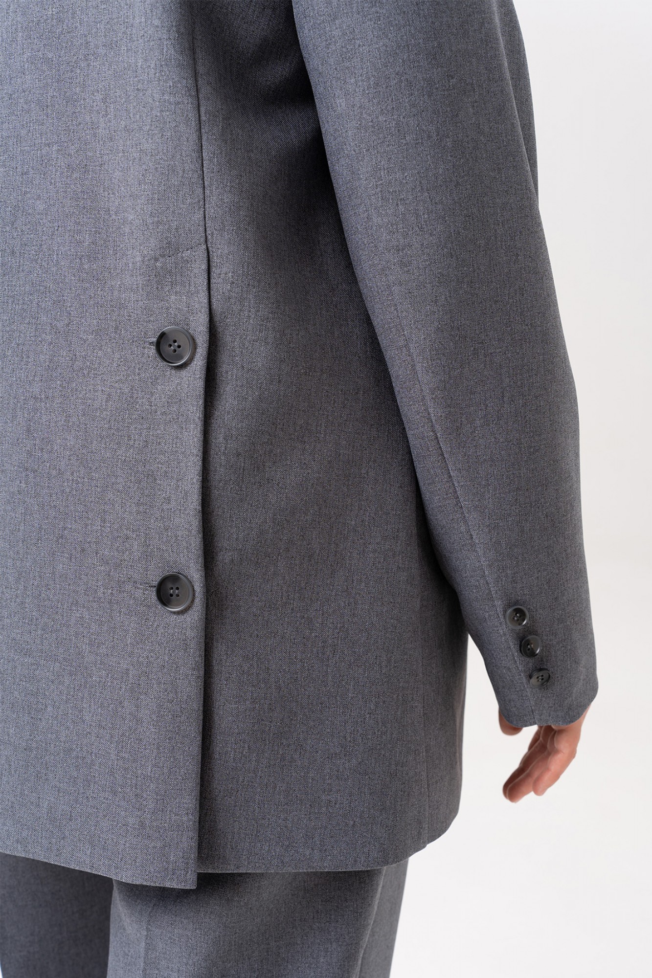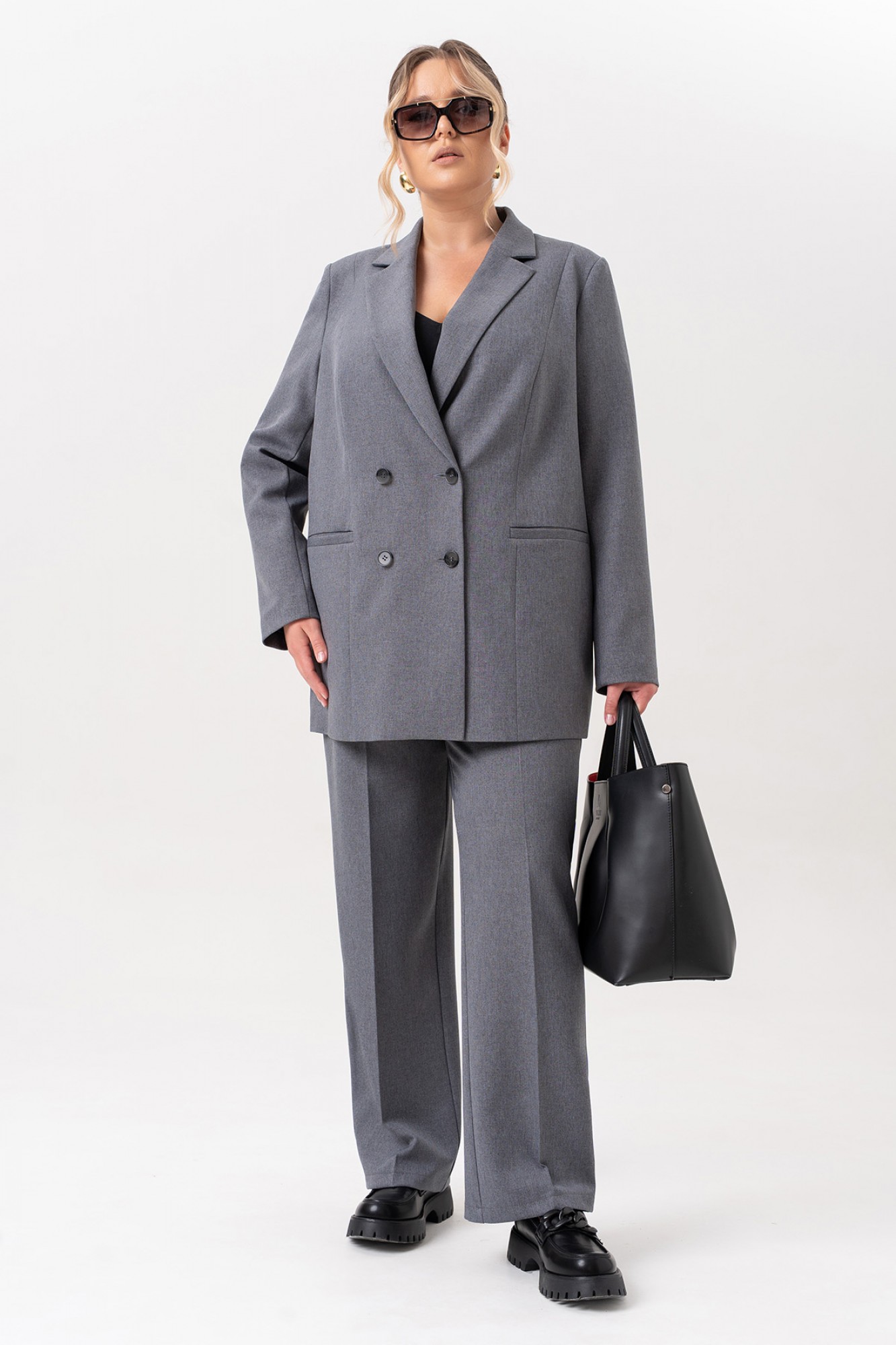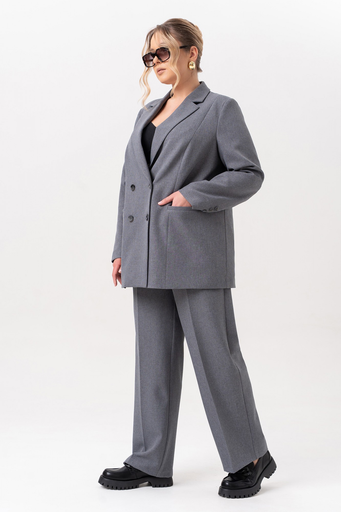 Элегантный женский костюм, в котором классика встречается с современными акцентами. Жакет выполнен в двубортном исполнении с выразительным пиджачным воротником, подчеркивающим строгость и стиль. Рельефы на полочках от плечевого шва придают силуэту структурность, а прорезные карманы в листочку добавляют практичности и утонченности. Особое внимание привлекает спинка: асимметричный рельеф на правой части, переходящий в шлицу, оформленную декоративными пуговицами — неожиданный и эффектный штрих. Втачные двухшовные рукава завершены аккуратными шлицами с тремя пуговицами, что добавляет костюму благородства и внимания к деталям. Брюки — лаконичные, с функциональными карманами и гульфиком на молнии. Удобный пояс с эластичной тесьмой по бокам делает посадку комфортной, не нарушая внешней строгости образа. Этот костюм — идеальное сочетание женственности, силы и комфорта. Он подойдет как для деловой встречи, так и для повседневного выхода, где важна уверенность и стиль.