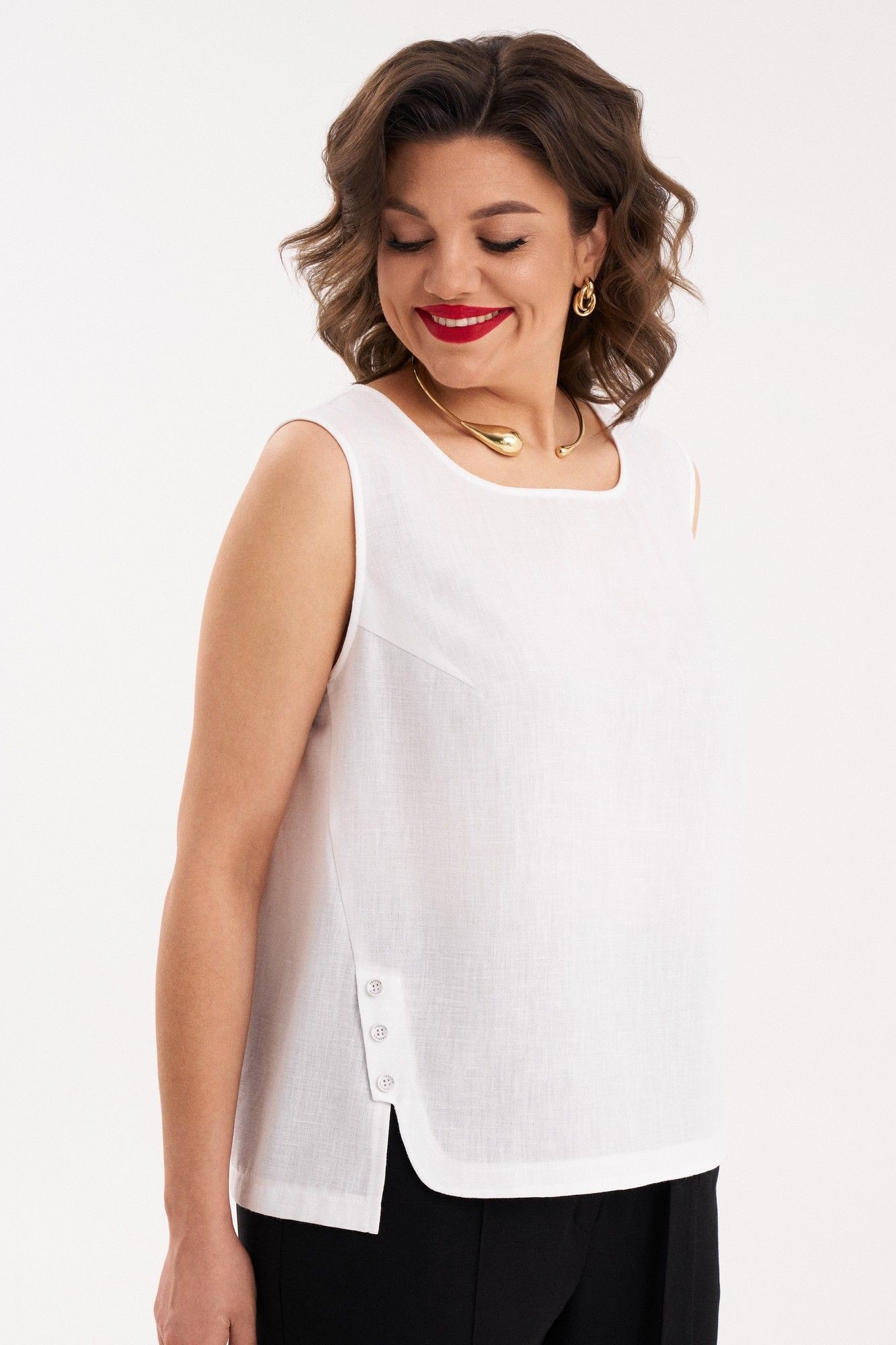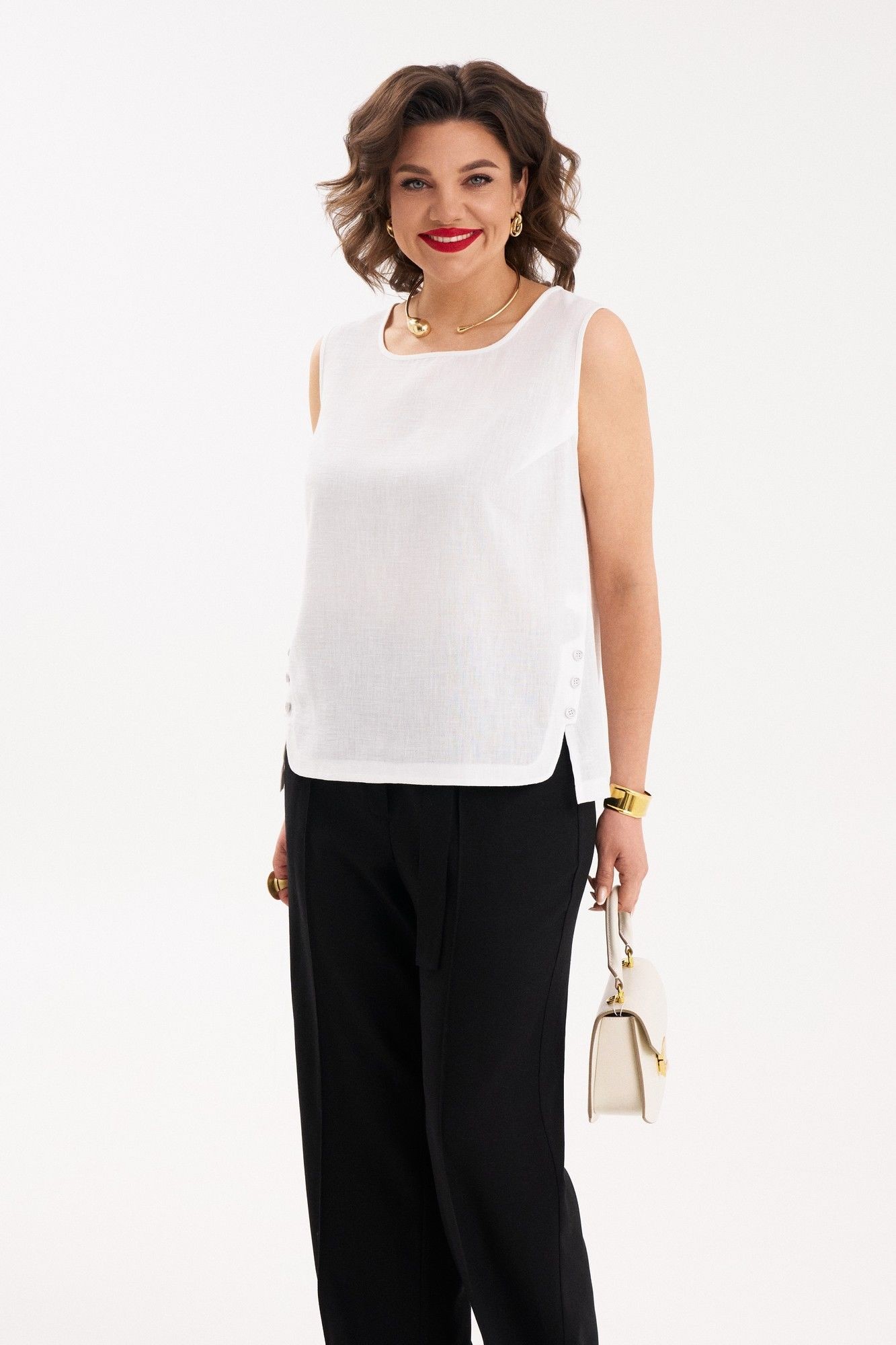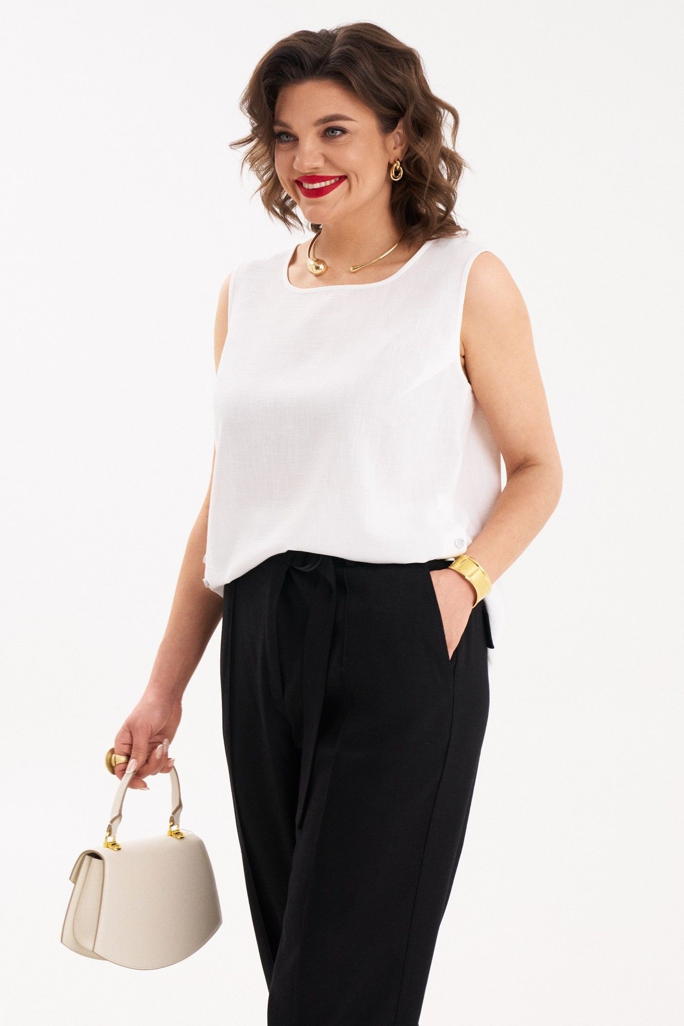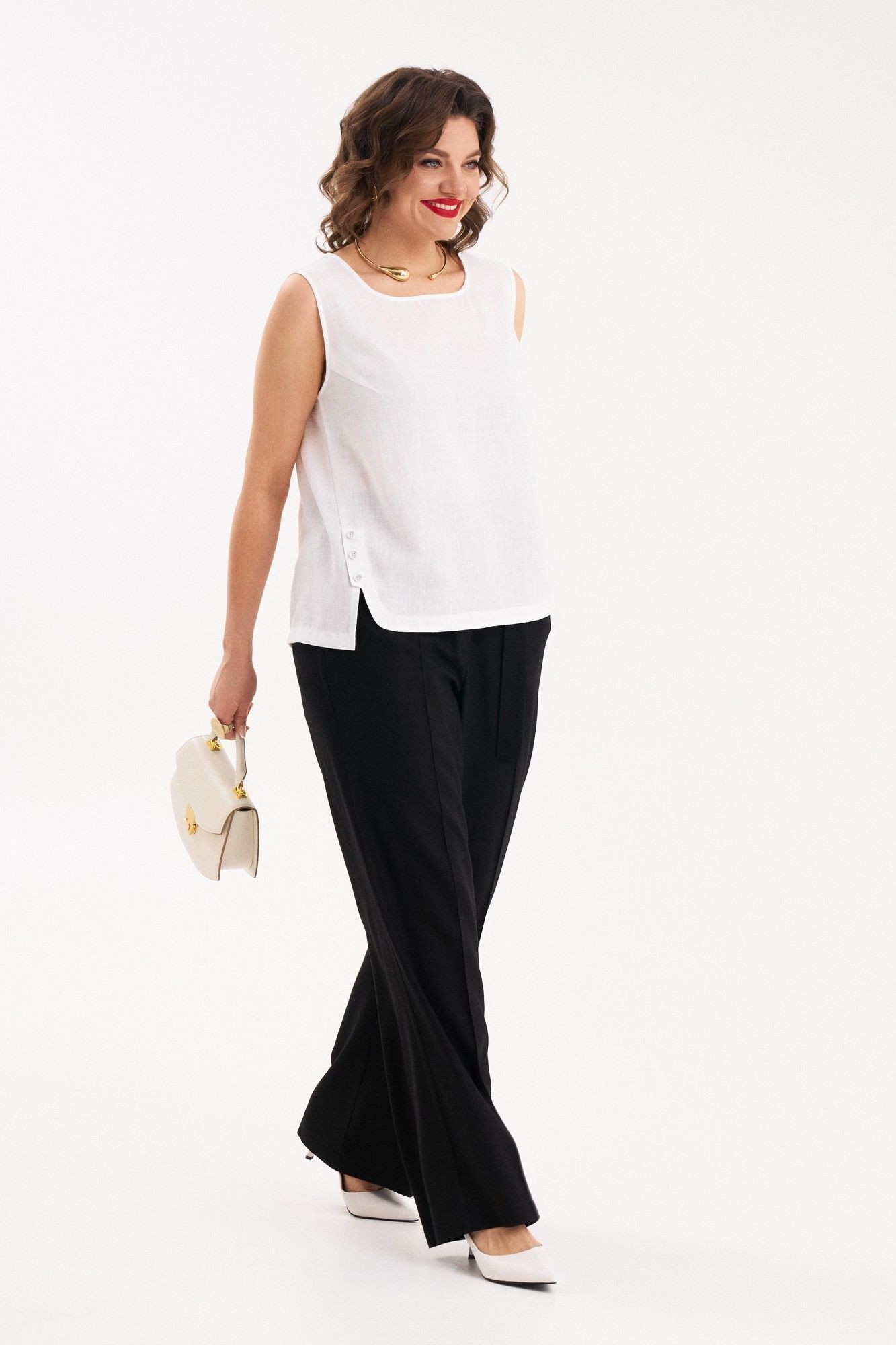 Стильный, легкий комплект состоит из брюк и топа. В комплекте топ - блузка без рукавов с интересным фигурным низом, разной длиной переда и спинке. Стильные, удобные брюки станут идеальным базовым предметом вашего гардероба. Брюки прямые, широкие. По переду защипы, на застежке, в боковых швах внутренние карманы. На задних половинках брюк декоративные клапаны. По линии талии притачной пояс со шлевками и резинкой сзади. По переду оригинальная застежка на пояс полукольцами. Брюки отлично смотрятся на любом типе фигуры и удачно сочетаются как с рубашкой, блузой так и с жакетом. Каждую вещь комплекта можно носить, как самостоятельную.