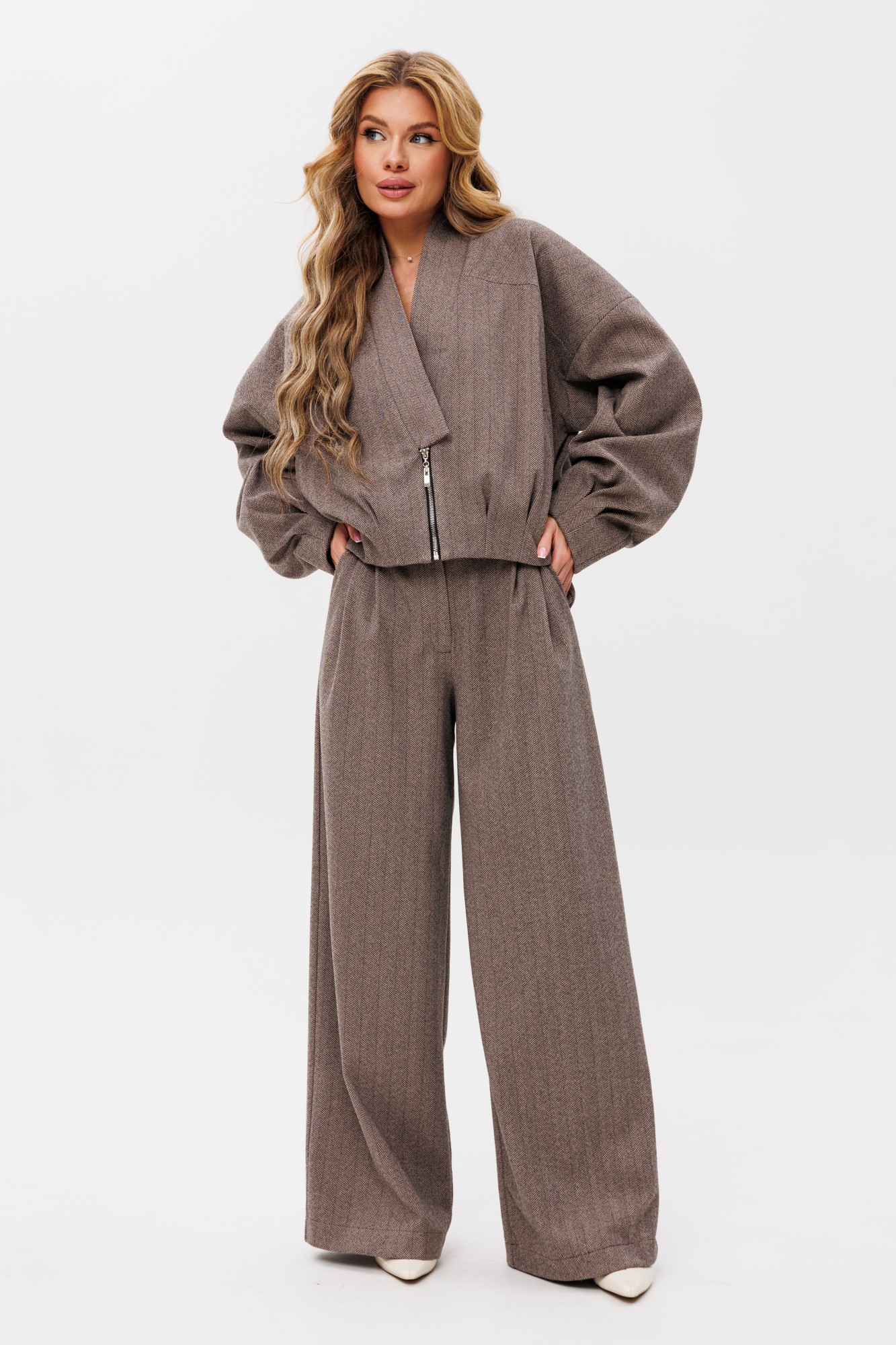 Костюм двухпредметный выполнен из плотной трикотажной ткани .Жакет-Бомбер оверсайз со спущенным плечом, воздушным рукавом, по низу рукава бантовые складки. По переду застёжка на молнию, воротникшаль. Перед жакета на кокетке, по низу заложены складки. Спинка на кокетке, по низу резинка. Брюки женские, свободного силуэта, на поясе со шлевками. Застежка на молнию и пуговицу. По переду заложены складки. По бокам действующие угловые карманы.