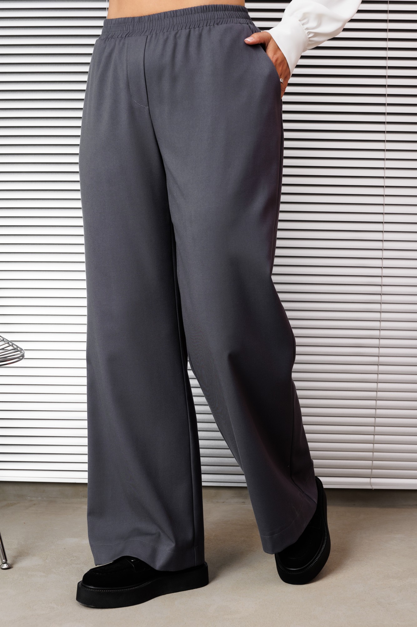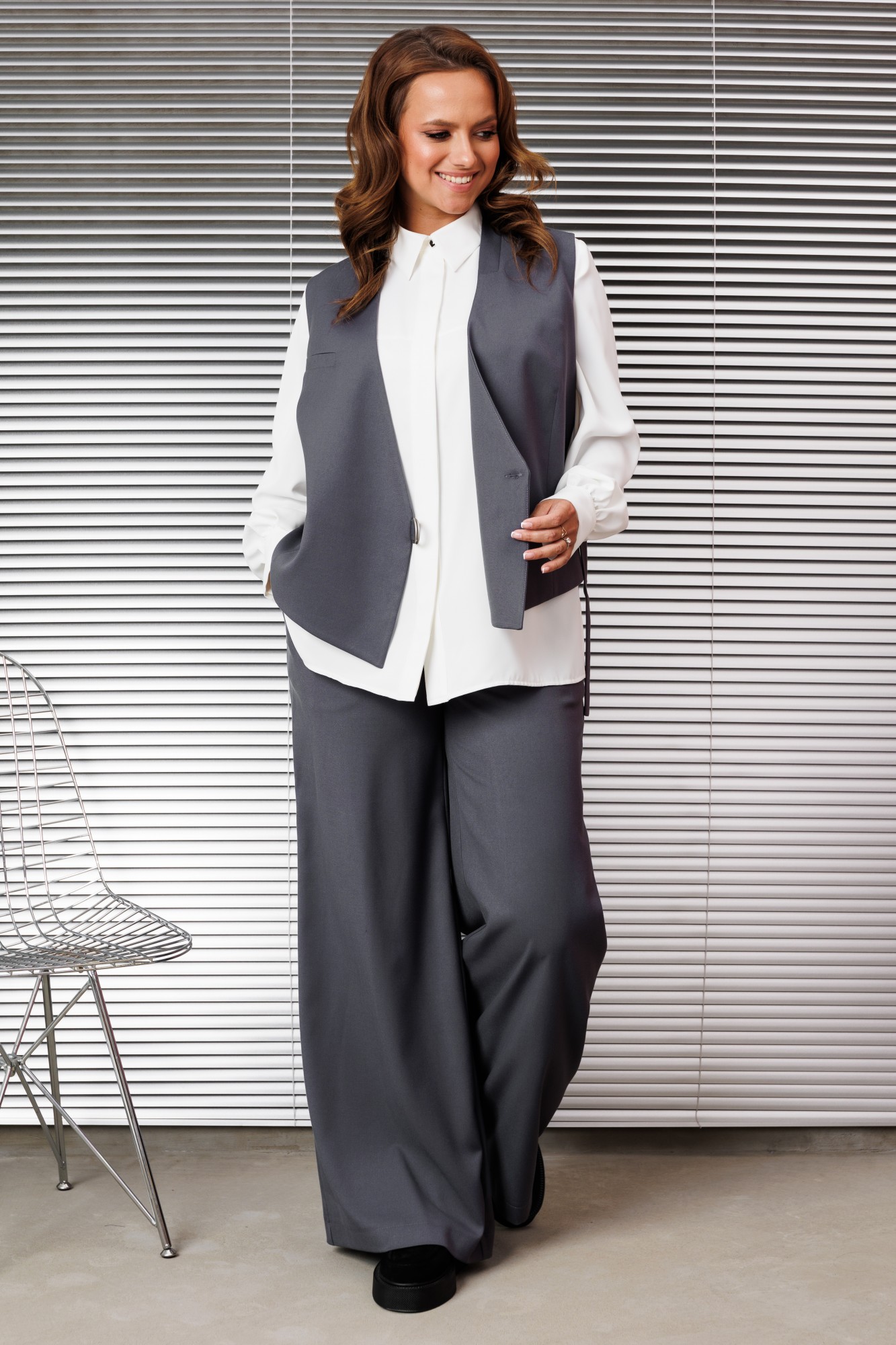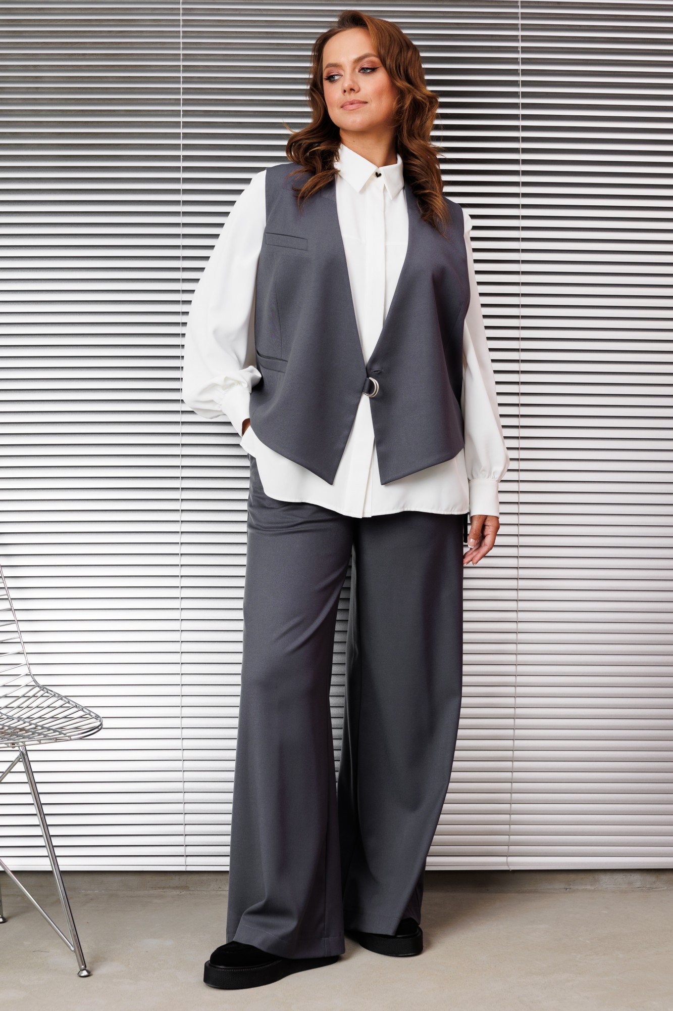 Женский брючный костюм тройка, состоящий из жилета, брюк и рубашки. Изысканный жилет полуприлегающего силуэта, он полностью на подкладке, что обеспечивает идеальную посадку и комфорт, дополнен застежкой на декоративную тесьму и потайную пуговицу. На правой полочке обработан нагрудный карман листочка и функциональный карман листочка в области талии, по горловине прилегающий воротник стойка. Спинка со средним швом и выточками. Брюки свободного прямого кроя со средней посадкой. В боковых швах функциональные карманы с отрезным бочком. Верхний срез оформлен поясом с эластичной тесьмой. Блузка прямого силуэта идеально сочетает в себе комфорт и стиль. В блузке классический рубашечный воротник и удобная центральная застежка на потайной планке на петли и пуговицы. Рукава втачные со сборкой по низу что обеспечивает эффектный объемный вид, по низу обработан притачной манжет застегивающийся на петлю и пуговицу. По полочке в области груди подрез. По спинке кокетка, переходящая на полочку и бантовая складка от кокетки. В боковых швах по низу обработаны разрезы.