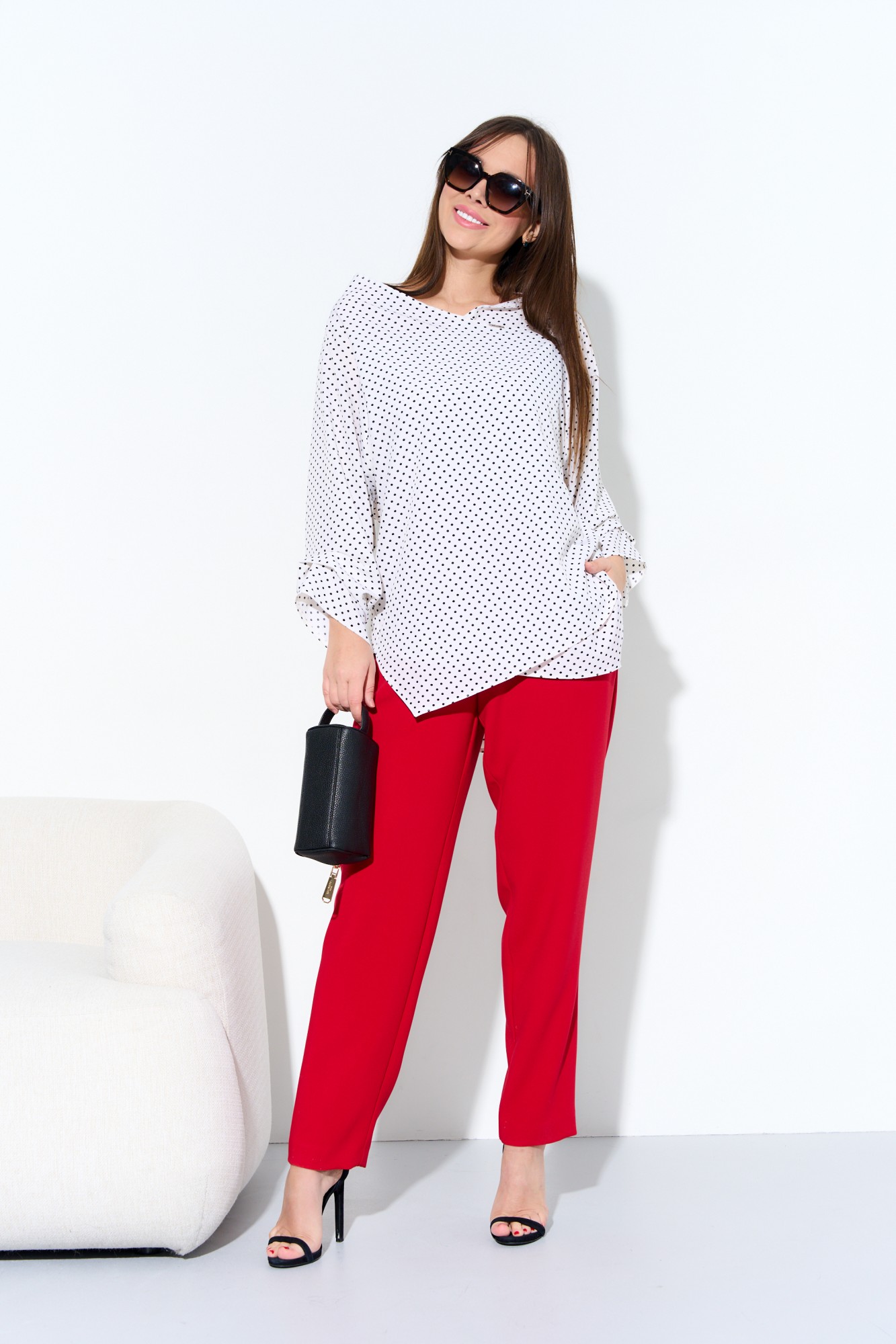 Комплект женский 2-х предметный (блузка, брюки). Блузка из текстильной, блузочной ткани. Модель прямого силуэта, рукав углублённый , рубашечного типа. Перед идет с запахом, низ блузы ассиметричный, по полочке углы, спинка закруглённая, удлинённая. По рукаву идут защипы. По горловине полочки пришит логотип бренда. Брюки зауженные к низу, пояс на резинке, по бокам карманы. Длина по спинке: 82 см. Длина рукава: 47 см. Длина брюк: 97см.