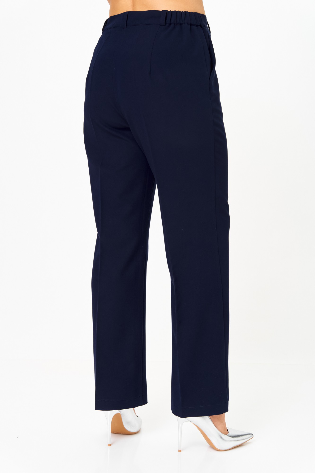 Комплект состоит из туники и брюк. Туника двухслойная, выполнена из однотонного полупрозрачного струящегося шифона (верхняя часть) и трикотажного однотонного полотна (нижняя часть). Брюки выполнены из костюмной однотонной ткани. Ткань брюк имеет механическое растяжение благодаря содержанию в ней эластана. Брючный костюм идеальный вариант на торжественные мероприятия. Туника А-образного силуэта с ассиметричным низом. Верхняя часть туники из шифона, полочка и спинка цельные, с круглой горловиной. Плечевой пояс на бретелях с декором из тесьмы с люрексом. Рукав в виде волана, длиной до локтя. Нижняя часть туники из трикотажного полотна, полочка с нагрудными вытачками, спинка цельная. Брюки полной длины, прилегающие в области бедер и свободные в колене и по низу. Брюки со стрелками. По передним половинкам выполнены наклонные карманы. В среднем шве передней половинки обработана застежка на молнию. По задней половинке обработаны таллиевые вытачки. По талии брюки на притачном поясе с эластичной тесьмой и застежкой на петлю и пуговицу. По поясу брюк обработаны шлевки под ремень.