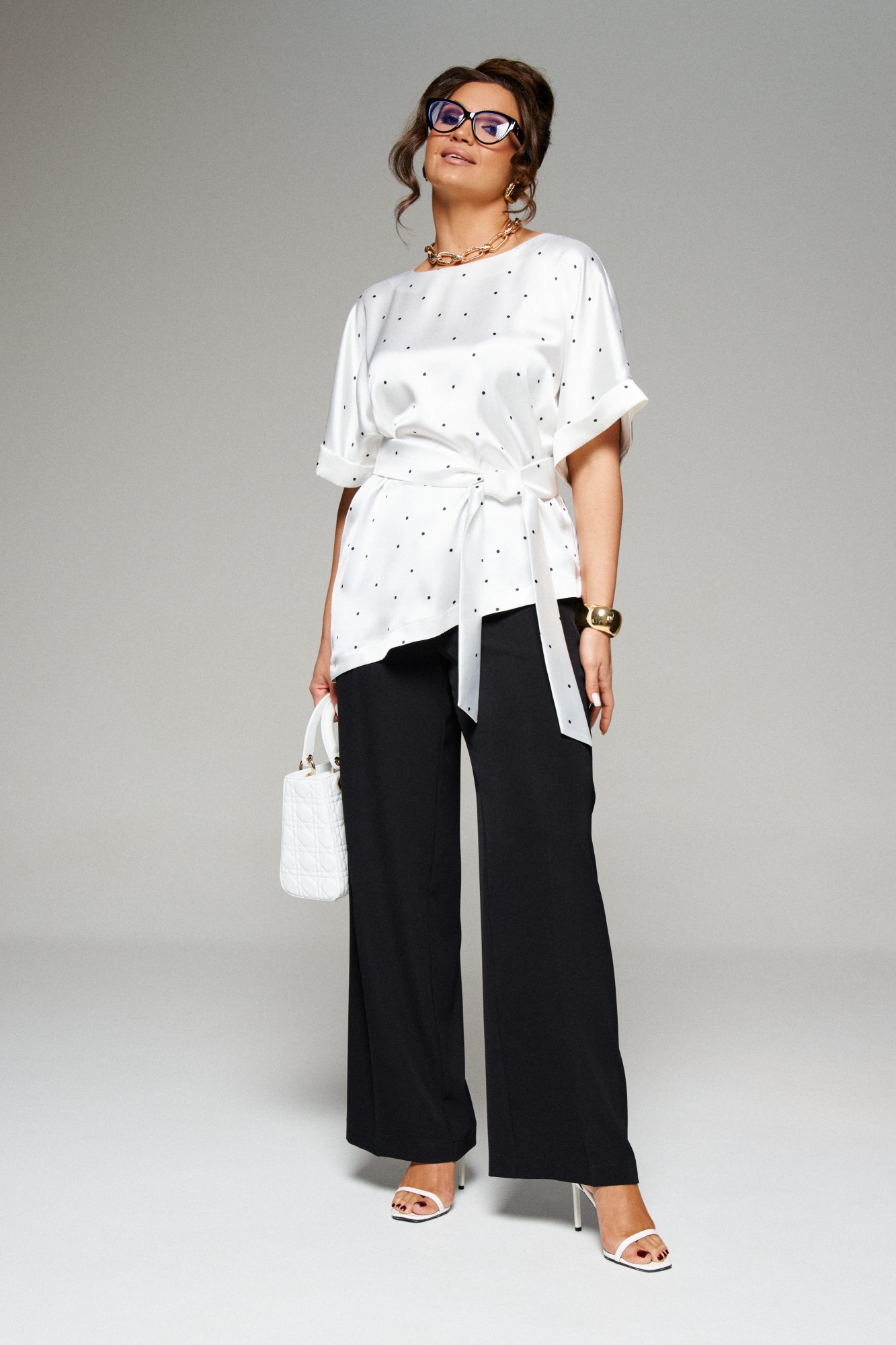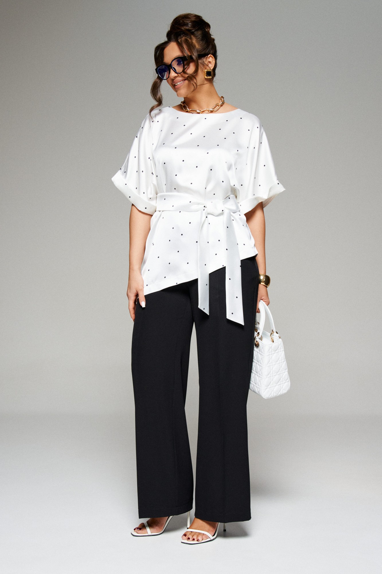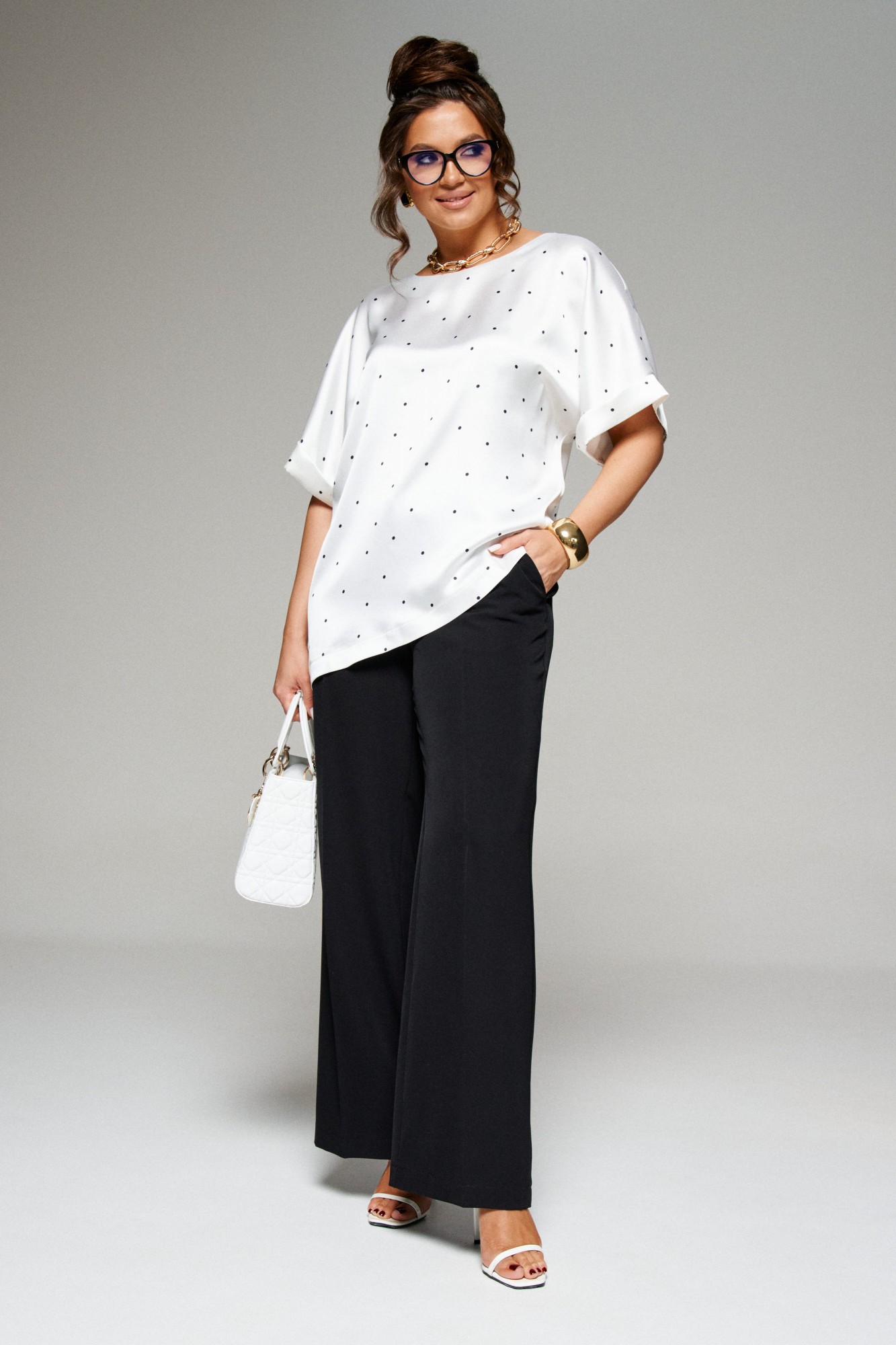 Деловой и нарядный комплект, состоящий из двух предметов: блузона и брюк. Блузон свободного кроя выполнен из ткани атлас, которая мягко облегает фигуру, а благодаря своему блеску придаёт изделию торжественный и презентабельный вид. Перед цельный. Спинка разрезная по среднему шву, в верхней части которого расположен небольшой разрез-капля с застёжкой на петельку и пуговицу. Горловина округлой формы, обработана обтачкой. Рукав цельнокроеный с притачной манжетой. В комплекте предусмотрен пояс, шириной 6см. Брюки выполнены из ткани «французский креп», которая красиво струится и имеет очень легкий стрейч. Покрой классический, посадка высокая. В верхней части брюк расположены функциональные карманы. Застежка центральная на молнию и петлю с пуговицей на поясе. В задней части пояса брюк для удобства использования и прилегания вставлена эластичная тесьма.