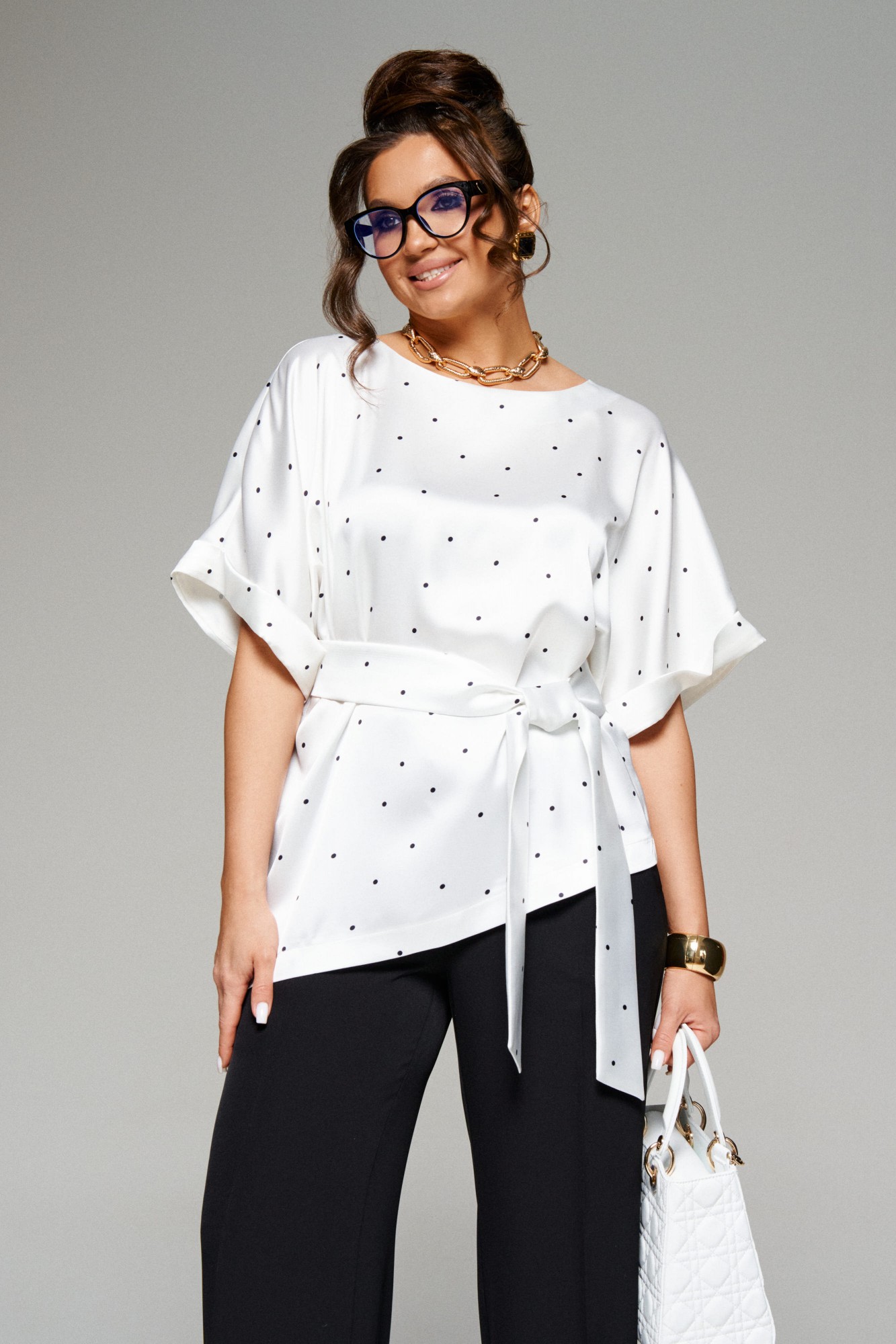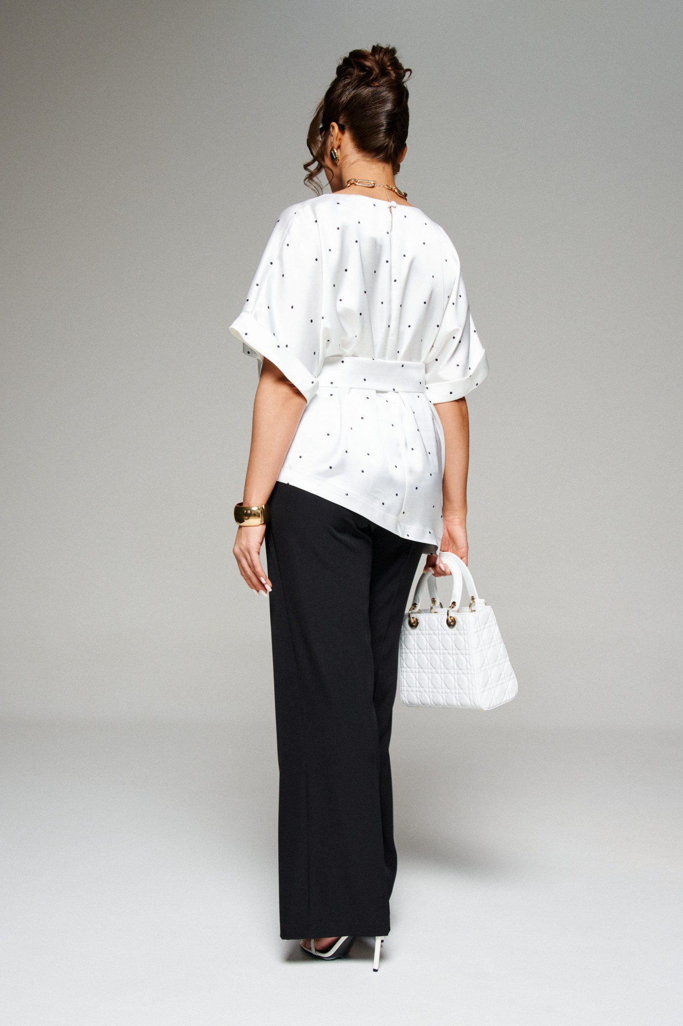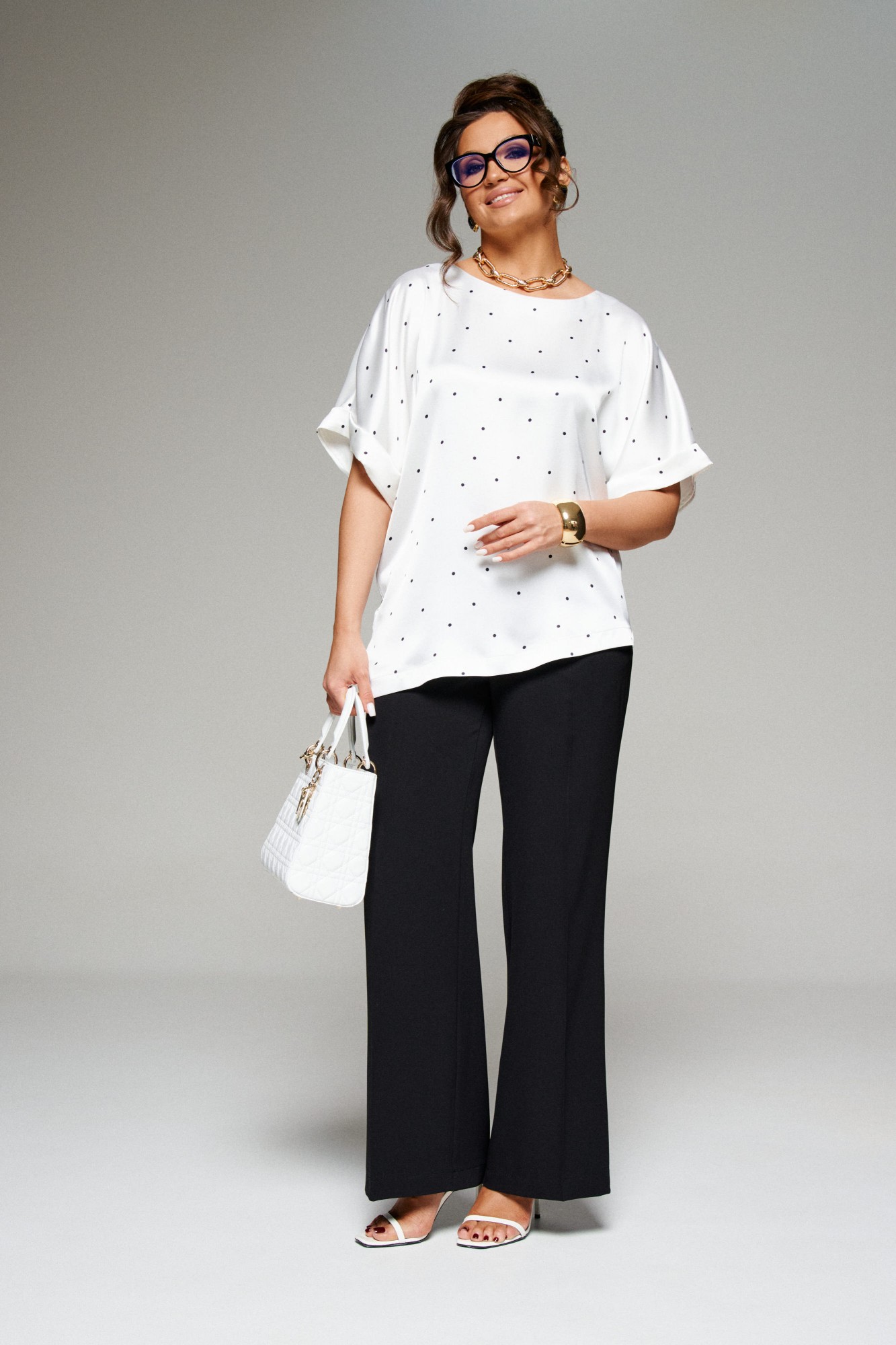 Деловой и нарядный комплект, состоящий из двух предметов: блузона и брюк. Блузон свободного кроя выполнен из ткани атлас, которая мягко облегает фигуру, а благодаря своему блеску придаёт изделию торжественный и презентабельный вид. Перед цельный. Спинка разрезная по среднему шву, в верхней части которого расположен небольшой разрез-капля с застёжкой на петельку и пуговицу. Горловина округлой формы, обработана обтачкой. Рукав цельнокроеный с притачной манжетой. В комплекте предусмотрен пояс, шириной 6см. Брюки выполнены из ткани «французский креп», которая красиво струится и имеет очень легкий стрейч. Покрой классический, посадка высокая. В верхней части брюк расположены функциональные карманы. Застежка центральная на молнию и петлю с пуговицей на поясе. В задней части пояса брюк для удобства использования и прилегания вставлена эластичная тесьма.