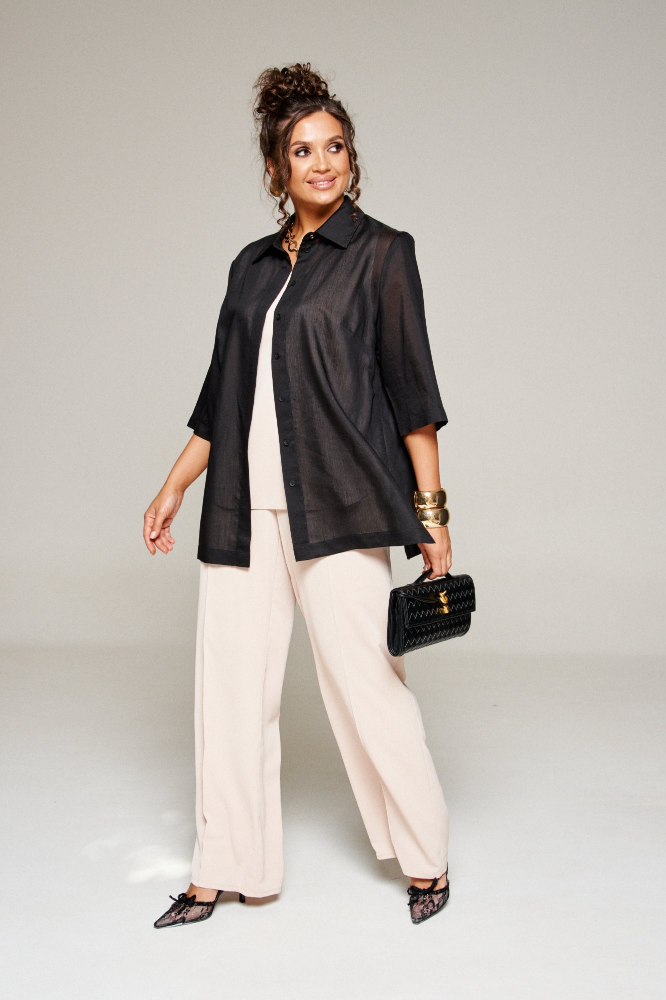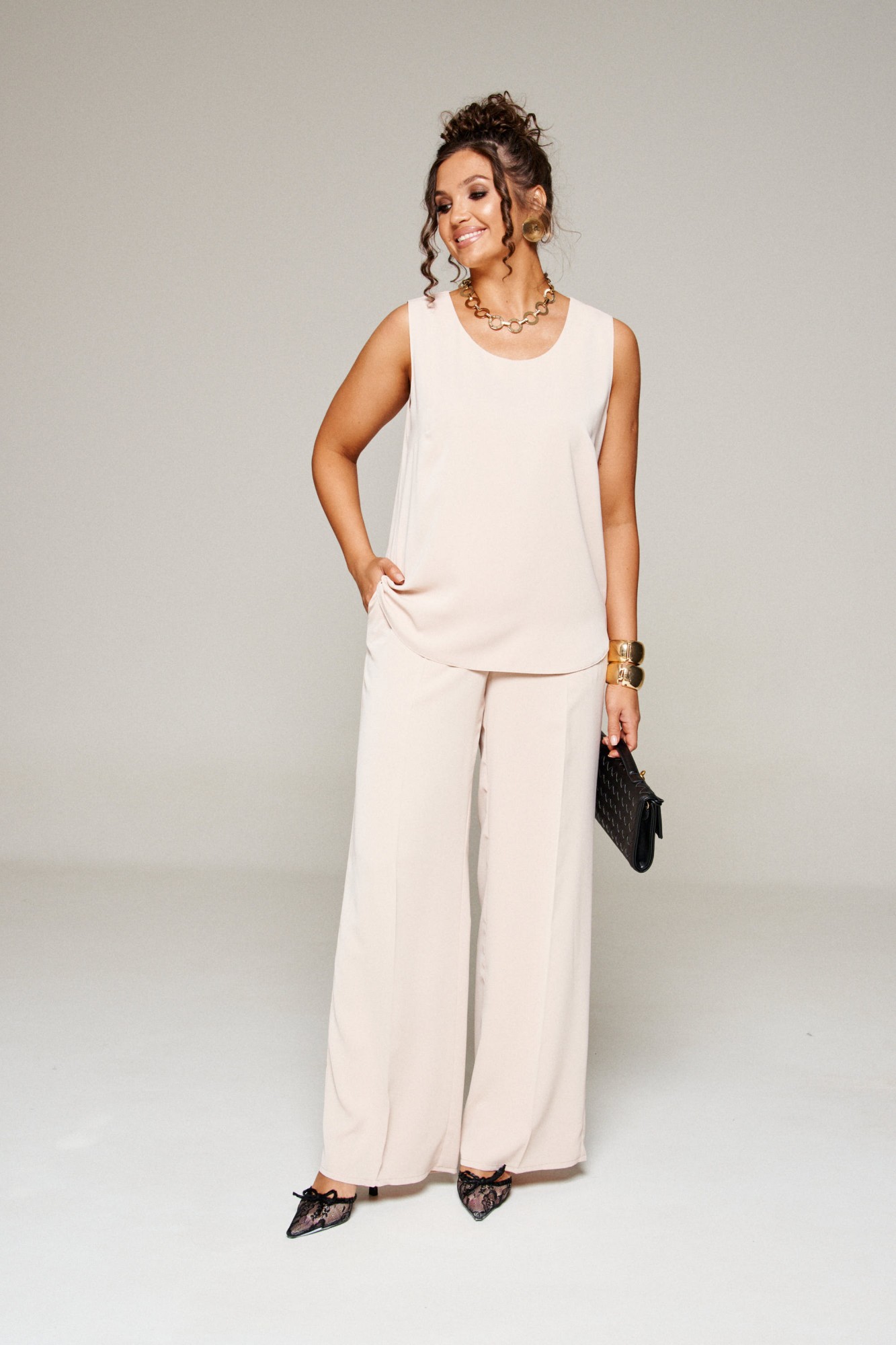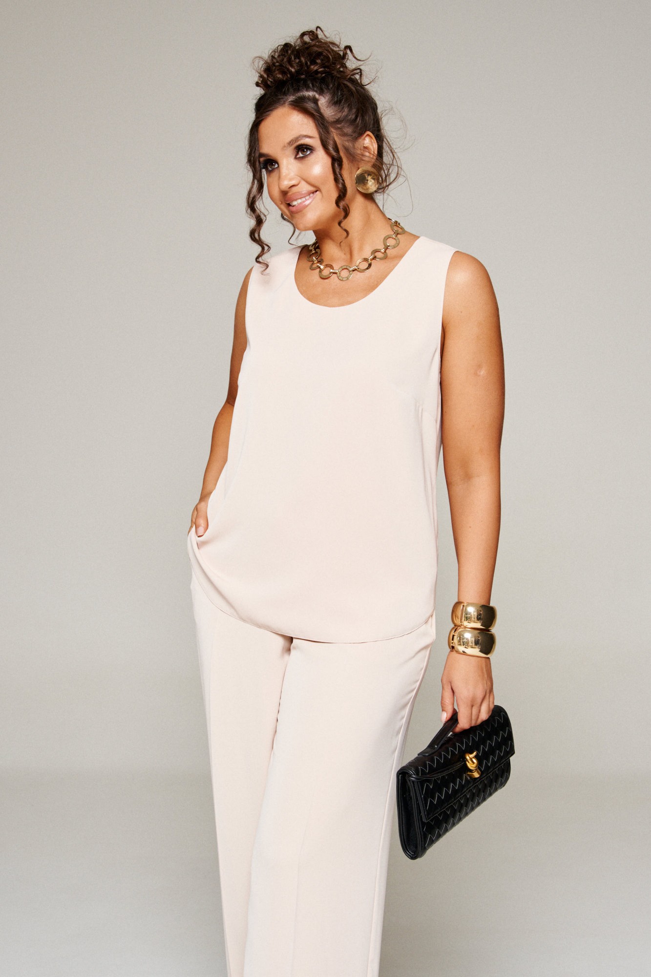Комплект с блузкой из вуали, брюк и топа – изделие вне времени и трендов, созданное в различных интерпретациях: от оверсайза до классики. Предназначен для повседневного и выходного использования. Найдет применение в любую погоду.