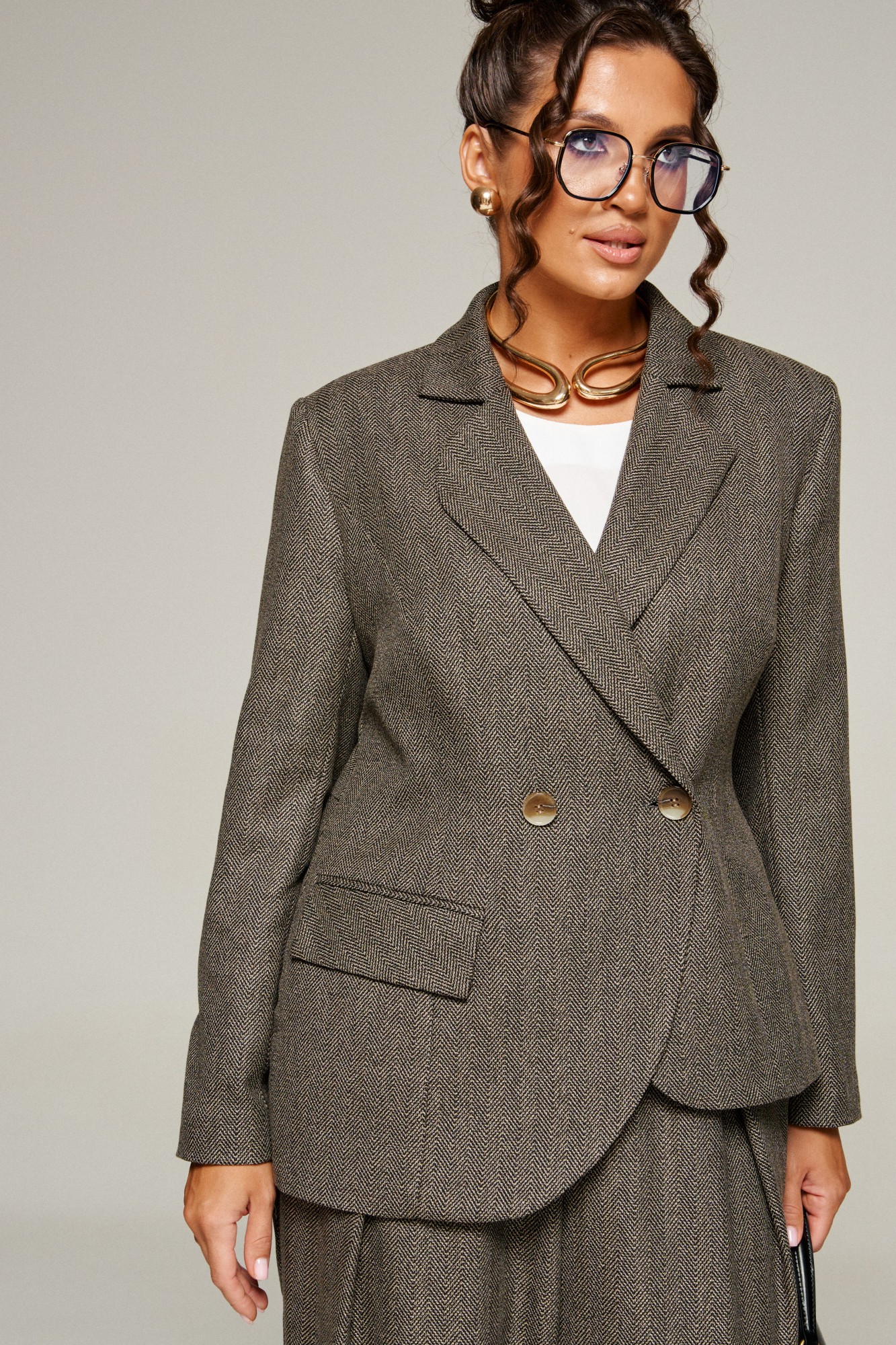 Жакет полуприлегающего силуэта, двубортный, асимметричный разноуровневый. На подкладке.