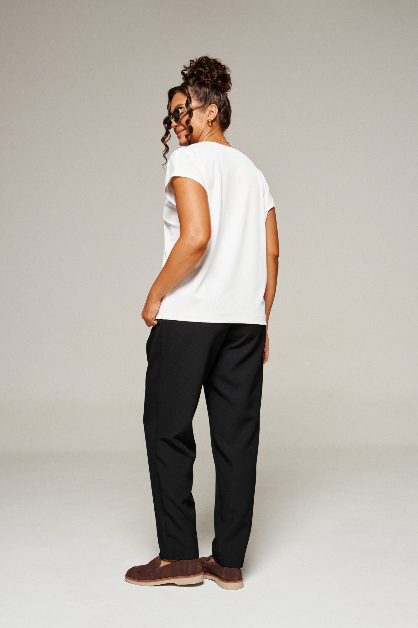 Брюки длинные, слегка заужены к низу; в спортивном стиле; выполнены из смесового костюмного полотна. Посадка классическая, высокая. Без застежки.