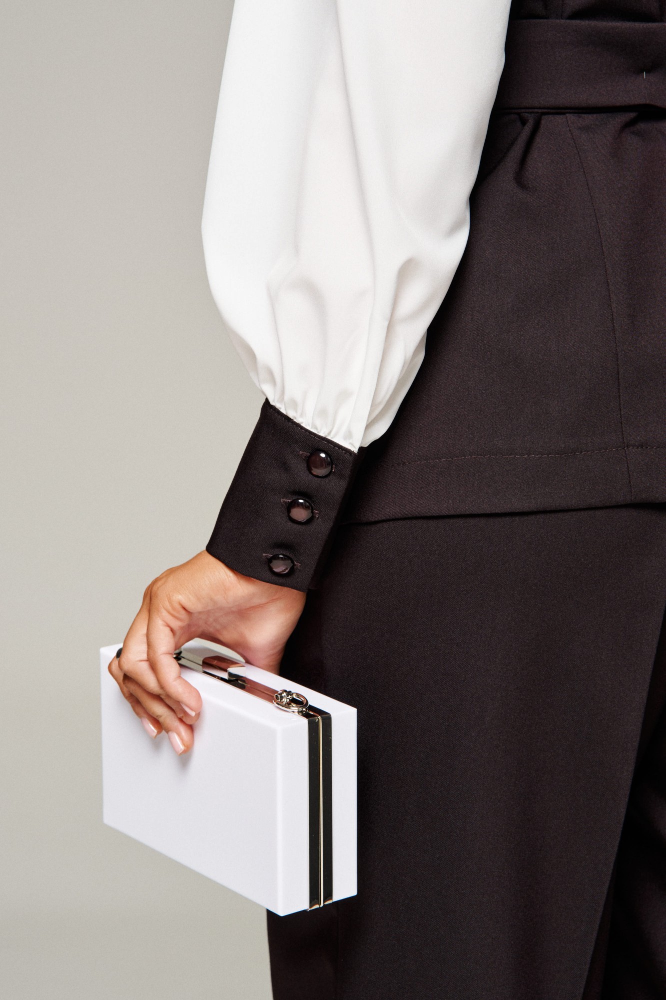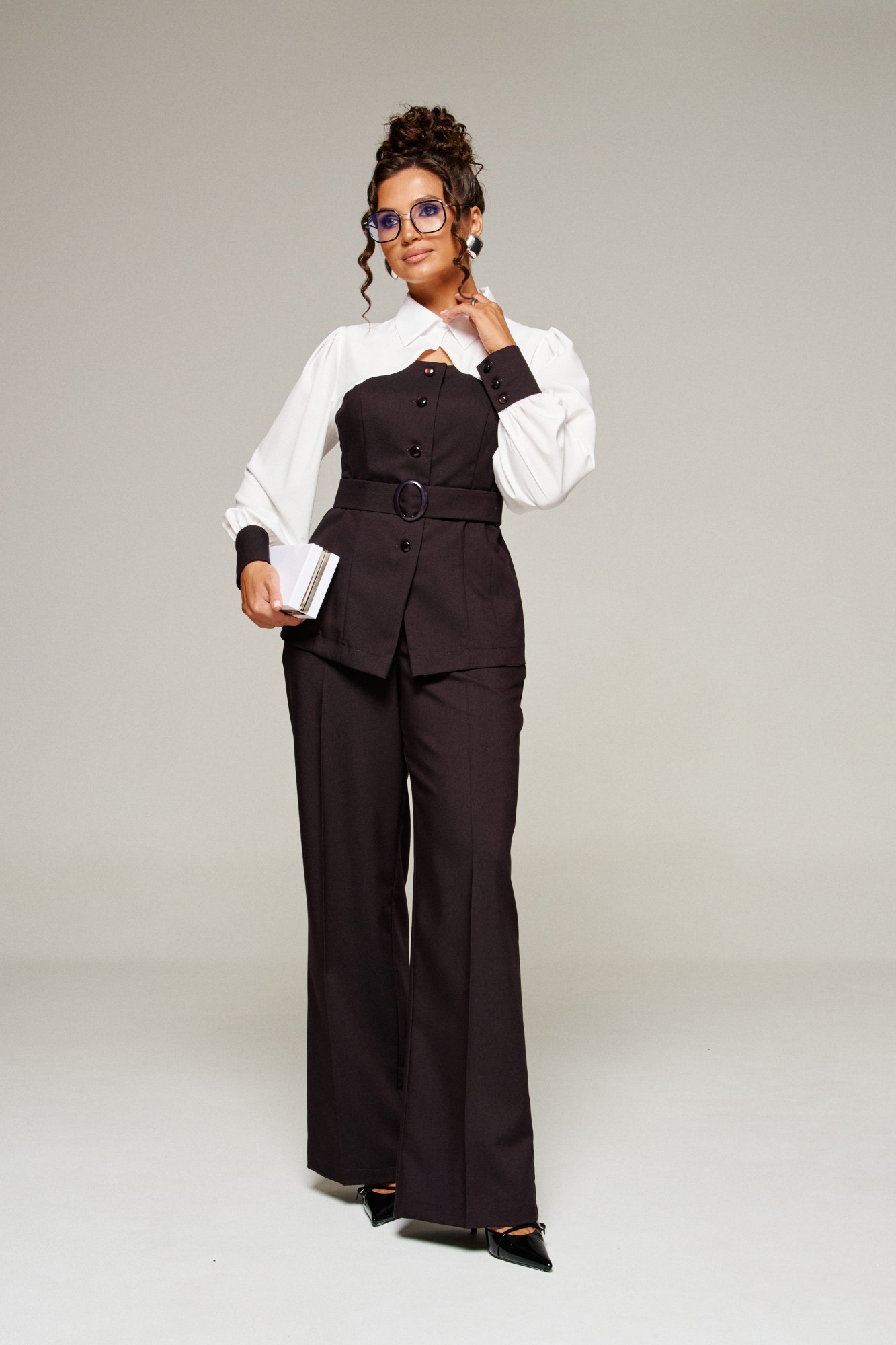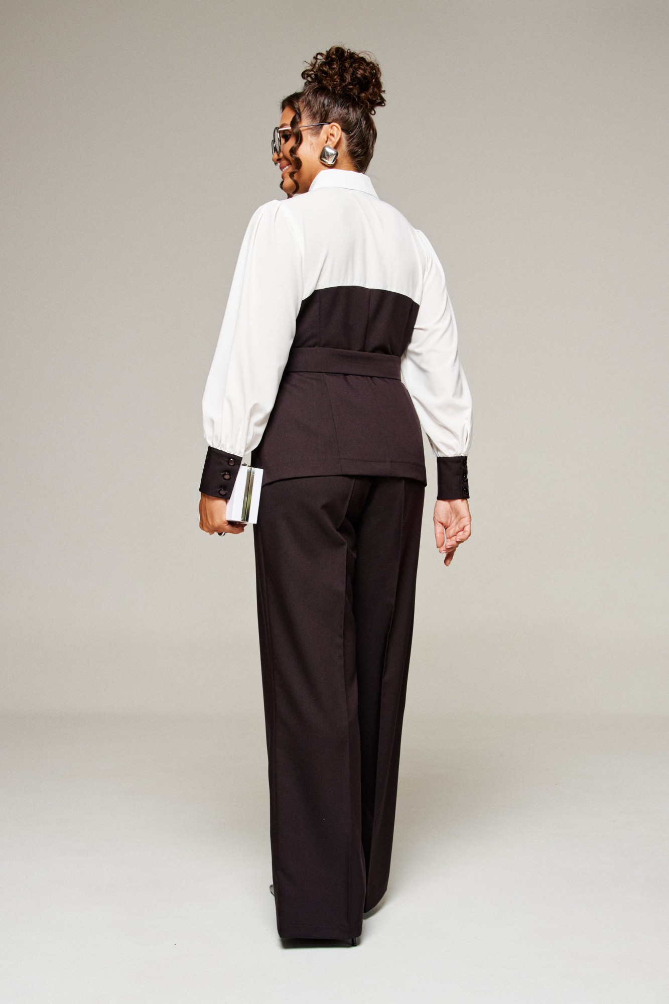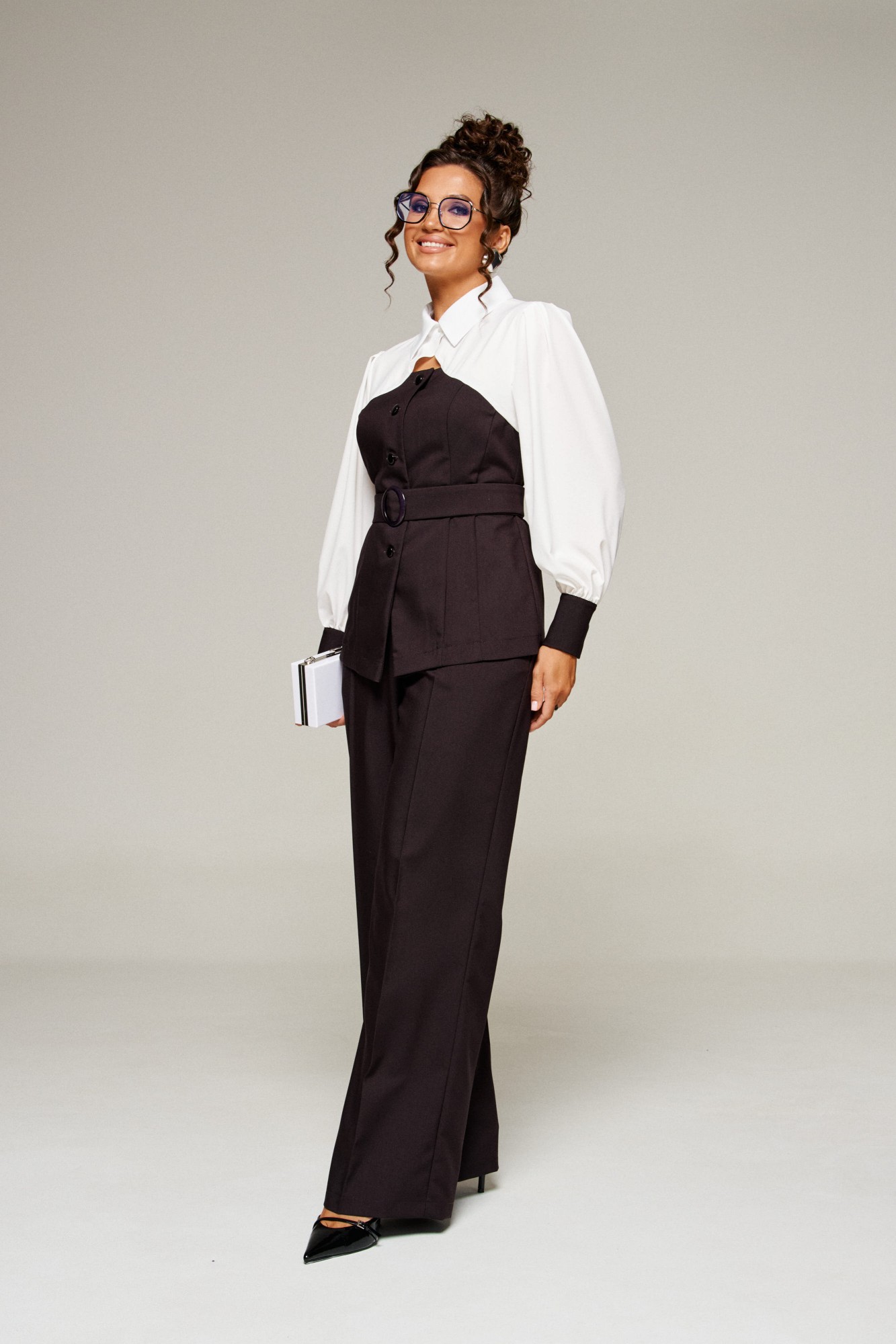 Удобство брючного костюма – неоспоримый факт, проверенный жизнью. Костюм женский 2-ух предметный: жакет, имитирующий блузку в верхней части, и брюки в романтическом стиле. Выполнен из костюмного полотна с нежной фактурой в контрастном сочетании цвета с мягкой вискозной блузочной тканью. Жакет-блузка прилегающего силуэта длиной ниже бедер. Верхняя часть (подрезная кокетка) спереди и сзади имитирует блузку, нижняя - жакет. Нижняя передняя часть с фигурными подрезными боковыми частями. Нижняя часть спинки с центральным швом и с вертикальными рельефами от кокетки. Рукав втачной одношовный длинный с мягкими складками по окату и сборкой снизу на притачной манжете с застежкой на три петли и пуговицы. Воротник рубашечного типа на отрезной стойке. Низ ровный. Застежка центральная однобортная на петли и пуговицы. Брюки прямого силуэта классической посадки, длинные, с двумя верхними боковыми карманами. Высота сиденья стандартная. Застежка центральная на молнию и на петлю и пуговицу на поясе. В задней части пояса для удобного прилегания по талии вставлена резинка.