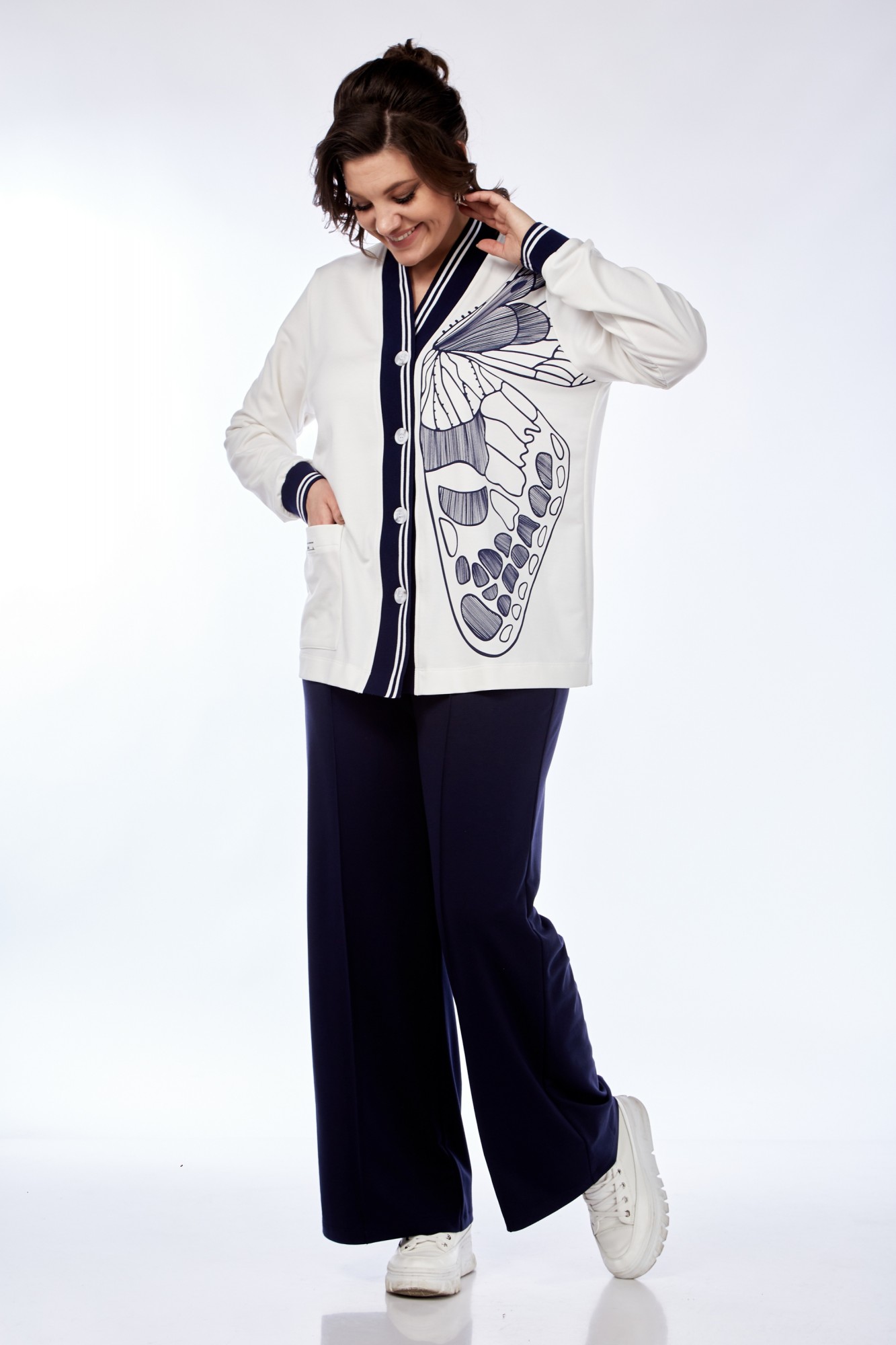 Комплект брючный из трикотажного полотна. Кардиган с центральной застежкой на 4 петли и пуговицы. Перед с накладным карманом на правой полочке и печатью в виде крыла бабочки на левой полочке. Рукав втачной одношовный с манжетом из довяза в полоску. По борту и горловине довяз в полоску. Брюки прямого силуэта с поясом на резинке. По передним половинам брюк отстрочена стрелка.