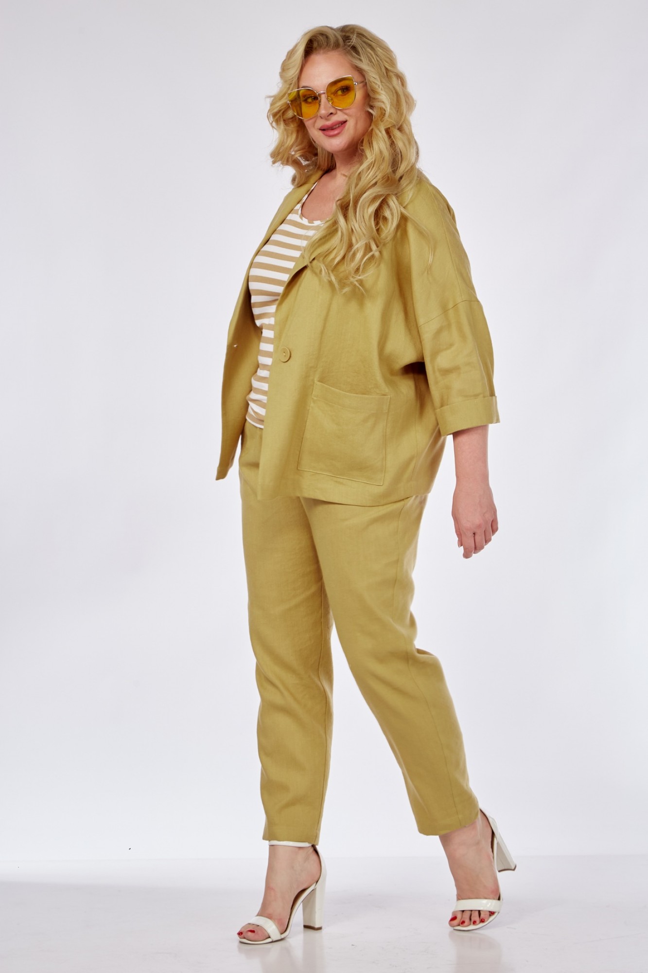 Костюм: лен 53%, вискоза 47%, майка: вискоза 50%, хлопок 50%
