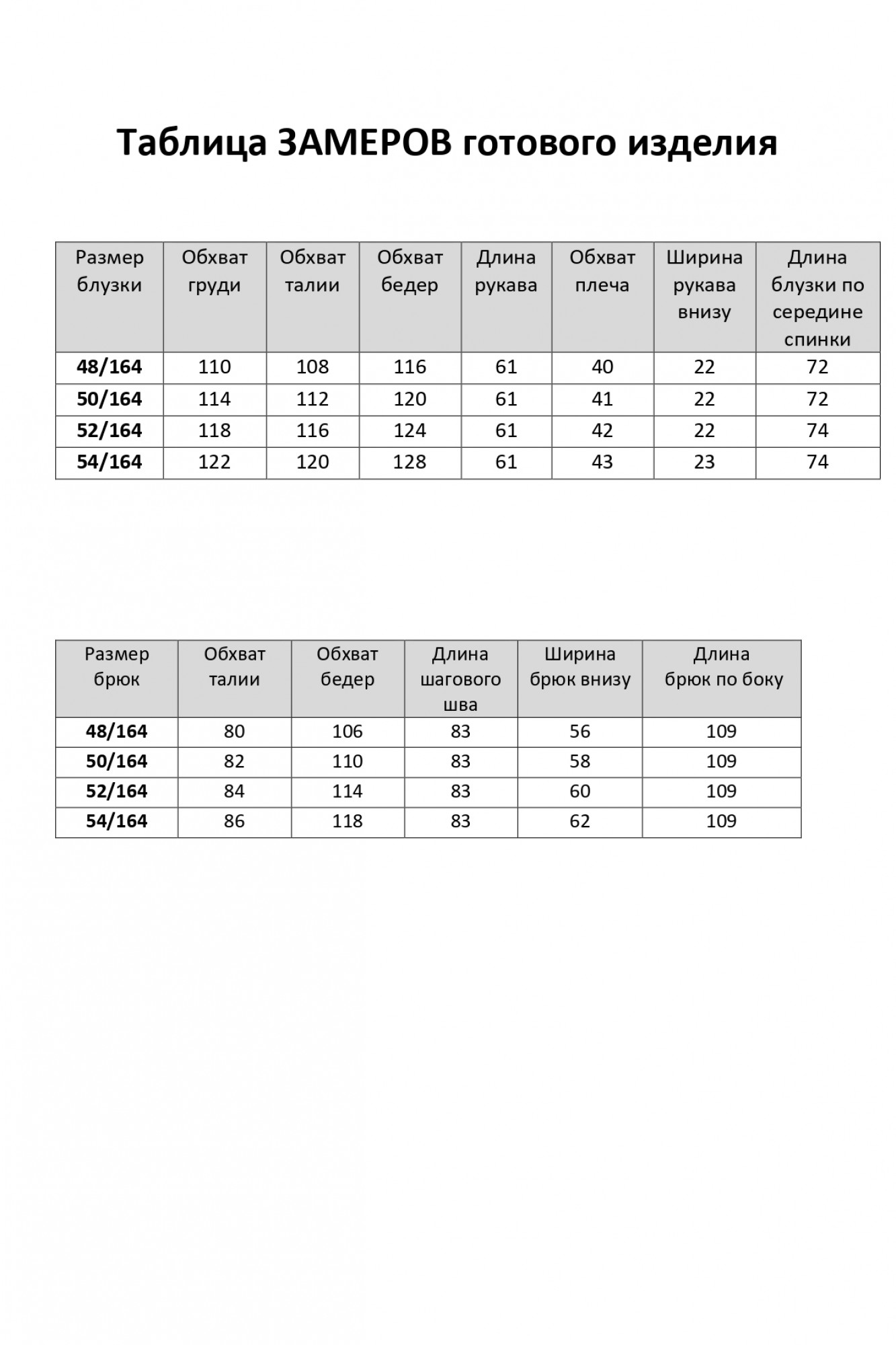 Таблица размеров