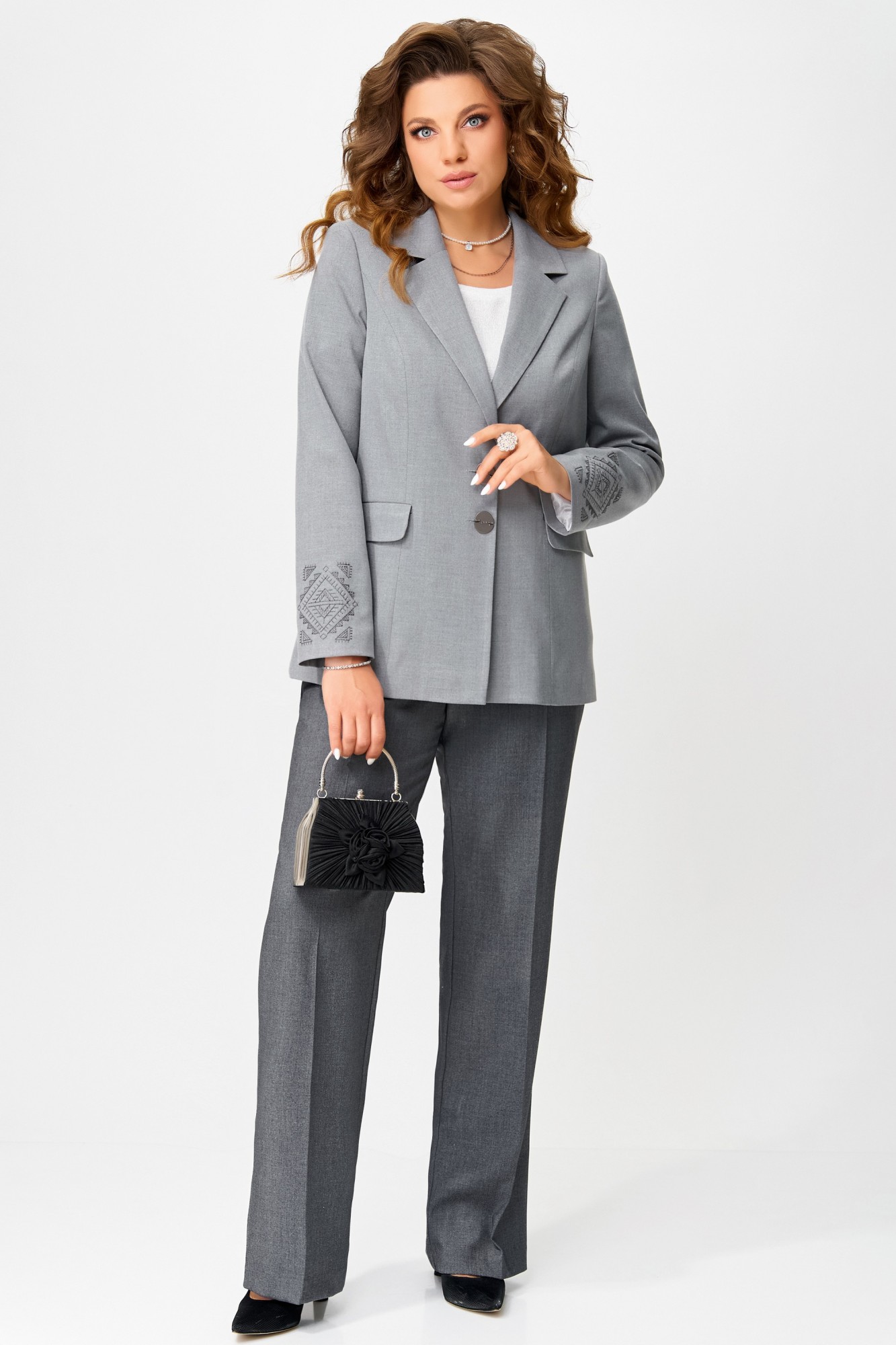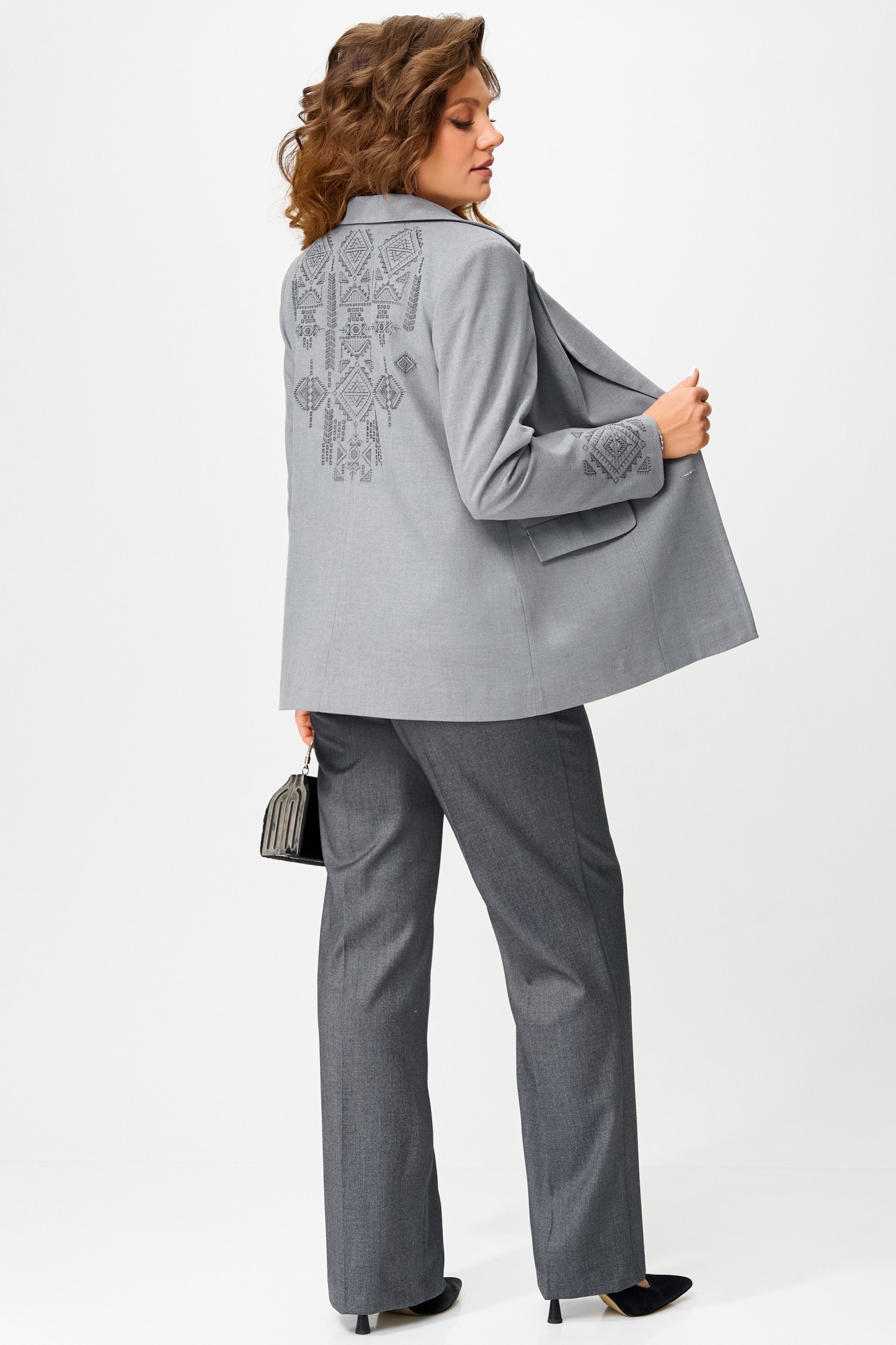 Комплект Янута — классика с изысканным штрихом современности. Погружение в элегантность начинается с комплекта Янута — женской двойки, где утонченность классического стиля тонко сочетается с художественной выразительностью вышивки. Жакет — архитектура формы и утончённости Полуприлегающий силуэт жакета обрамляет фигуру с мягкой строгостью, благодаря подкладке создаётся безупречный комфорт. Однобортная застёжка на петли и пуговицы — отголосок ретро-изящества, подчёркнутая воротником и лацканами пиджачного кроя. Прорезные карманы с листочкой и клапаном не только функциональны, но и служат декоративным акцентом. Втачные двухшовные рукава завершаются магией вышивки — на спинке и по низу, словно тонкая роспись, придающая изделию индивидуальность и художественную глубину. Брюки — лёгкость движения и уверенности Прямой силуэт брюк гармонично балансирует изящество с практичностью. Высококачественная текстильная ткань струится по телу, подчёркивая линию бедра. Пояс оформлен эластичной вставкой по спинке, создавая идеальную посадку и свободу. Карманы на передней части добавляют утилитарную нотку, а подгибка низа — аккуратную завершенность. Трансформируемый стиль Янута — это не просто комплект, это дизайнерское откровение, которое легко адаптируется под любой стиль. Жакет и брюки можно носить отдельно, сочетая их с другими элементами гардероба, создавая уникальные образы для разных настроений и случаев. Этот наряд словно говорит: «Я — часть вашего характера, вашего ритма, вашей эстетики.